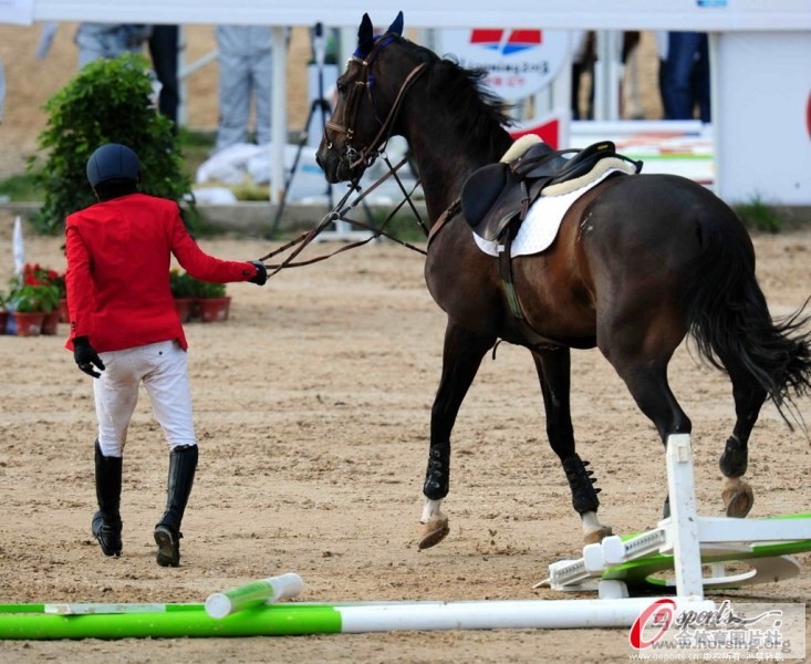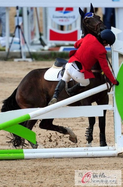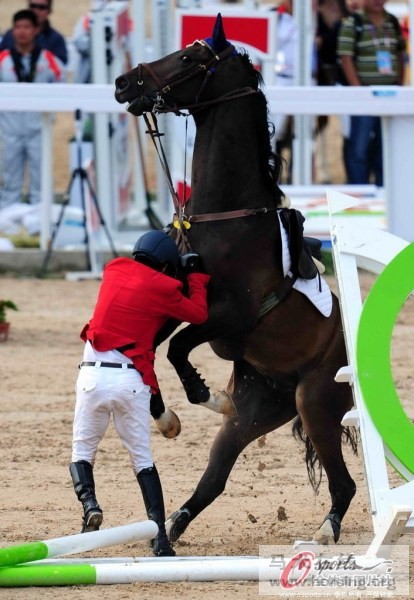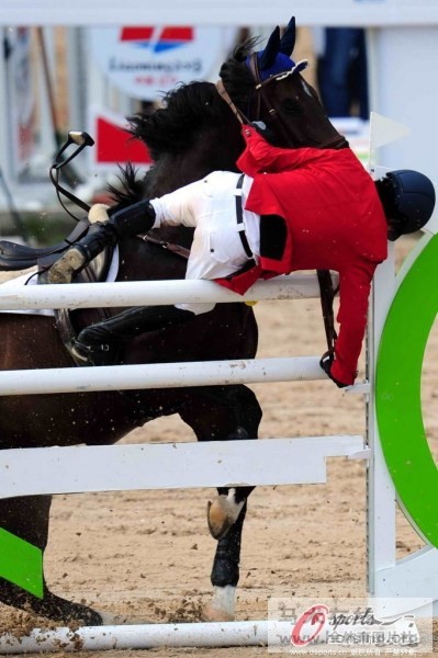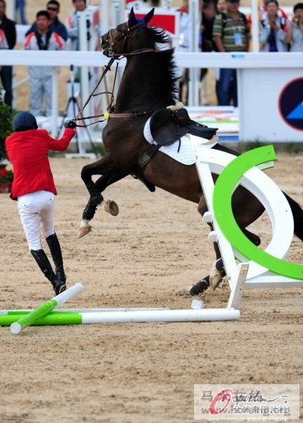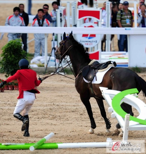 : 2013年9月2日,遼寧省沈陽(yáng)市,2013全運(yùn)會(huì)馬術(shù)場(chǎng)地障礙賽團(tuán)體決賽,馬失前蹄,選手落馬。