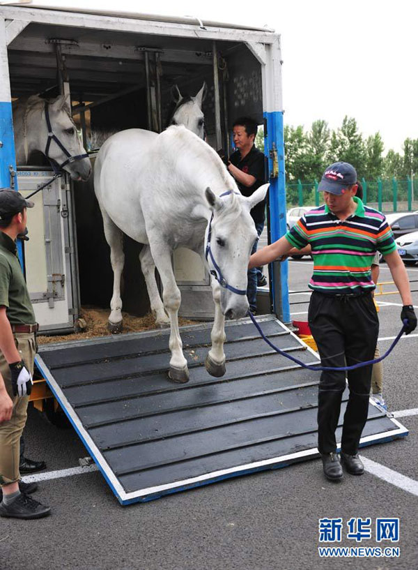 11匹歐洲表演馬于近日空運(yùn)抵達(dá)北京,參加今年7月份在鄂爾多斯達(dá)拉特旗舉行的全國(guó)馬術(shù)繞桶冠軍賽和鄂爾多斯達(dá)拉特第二屆國(guó)際馬文化節(jié)。該11匹馬分別是葡萄牙的盧西塔諾馬和西班牙的安達(dá)盧西亞馬。馬匹抵達(dá)后運(yùn)往北京香河的檢疫場(chǎng)接受為期一個(gè)半月的檢疫隔離。據(jù)介紹,“盧西塔諾馬”和“安達(dá)盧西亞馬”是世界著名的表演馬,以表演最具有巴洛克式古典美的馬匹的訓(xùn)練表演著稱。除11匹歐洲表演馬外,還有59匹來(lái)自美國(guó)的參賽馬已于之前抵達(dá)北京。(新華社記者汪永基攝) |