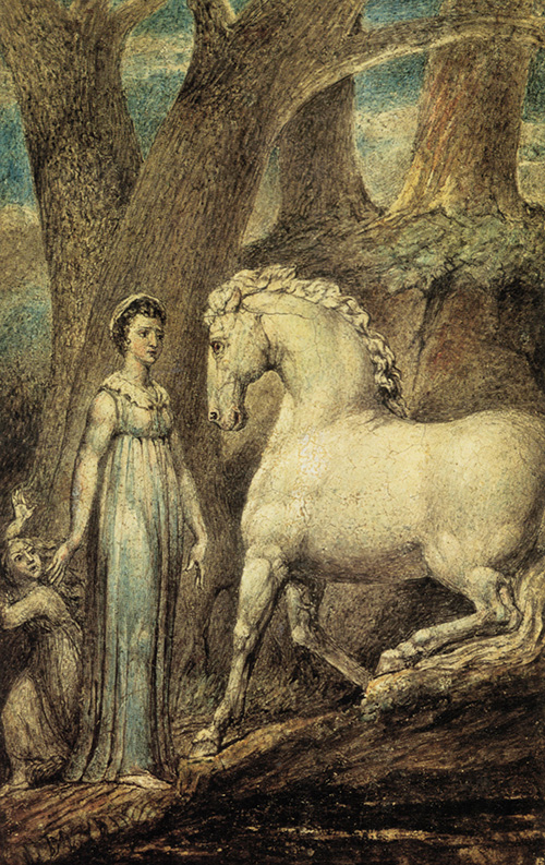 出自威廉·海利(William Hayley )的民謠 威廉·布萊克(1757-1827) 創(chuàng)作于 1805 年,銅版畫,10.6*6.4 cm 目前儲(chǔ)藏于耶魯大學(xué)英國(guó)藝術(shù)中心 威廉·布萊克(William Blake)是一位英國(guó)畫家、詩(shī)人和版畫復(fù)制匠,他在很早的時(shí)候就顯現(xiàn)出了特殊的藝術(shù)天賦,可是一生都未能揚(yáng)名。現(xiàn)在,他被認(rèn)為是英國(guó)浪漫主義文學(xué)時(shí)代在詩(shī)歌和視覺藝術(shù)領(lǐng)域的領(lǐng)軍人物。他曾表示自己在幼年時(shí)就產(chǎn)生過幻象,而第一次出現(xiàn)幻象時(shí),他才只有十歲。那一天,他看到了一棵綴滿天使的樹。作為一名非常獨(dú)特且充滿神秘色彩的藝術(shù)家,威廉·布萊克的作品也是非比尋常的。 在這些作品中,《The Horse( 馬 )》雖然不是布萊克最優(yōu)秀的作品,但卻已經(jīng)表現(xiàn)出他所特有的,又是世人所陌生的世界觀。這幅畫是作為英國(guó)詩(shī)人威廉·海利的一本詩(shī)集中的插畫而出現(xiàn)。描繪的是一首長(zhǎng)篇悲劇詩(shī)里的故事:一匹馬因一名惡毒的騎士而死。這匹馬周身彌漫著悲劇的英雄主義色彩,給人一種馬主動(dòng)接受了宿命的預(yù)感,并讓人產(chǎn)生心煩意亂的感覺。馬畫得并非不完美,構(gòu)圖也不能說不流暢,只是在加強(qiáng)了這兩點(diǎn)要素后,就產(chǎn)生了一種讓人惴惴不安的效果。 |