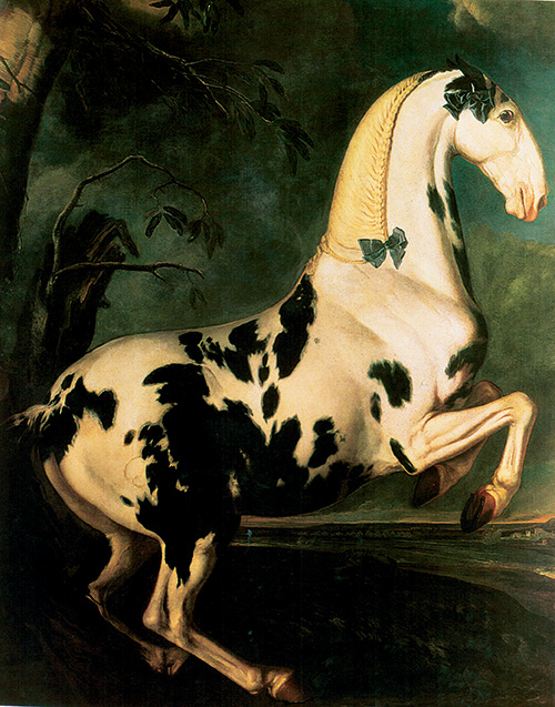 漢密爾頓是十八世紀一名勤奮的編年史作家,專寫古典訓馬術(shù)。在這幅畫中他畫了一匹健碩有力的種公馬,它可以自由優(yōu)雅地參加盛裝舞步比賽。這匹幾乎與真馬同等大小的花斑種馬肖像畫原本是漢密爾頓在公元 1700 年創(chuàng)作的 6 副系列馬畫的一部分,用來裝飾在維也納的羅騷新建的列支敦士登夏宮。七年后,風景畫家安東·法伊斯滕貝格奉命在其中的四幅油畫中插入背景。通過風景圖畫背景的支撐,花斑馬起揚的動作顯得更具動態(tài)感。漢密爾頓不僅試圖描繪動物的美,還注重肖像的意義和性格的表達。