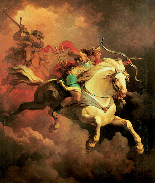 菲利普·雅克(菲利普·詹姆斯)德·盧戴爾伯格(1740-1812) 創(chuàng)作于 1789,木材油畫(huà) 122.2*99.1cm 目前收藏于倫敦泰特美術(shù)館 盧戴爾伯格所描繪的世界末日有種純粹的美麗,會(huì)使人們感覺(jué)好似得到了上天的寬恕。所以雖說(shuō)是世界末日,但卻并沒(méi)有觸發(fā)人們對(duì)世界末日來(lái)臨的恐懼感。這是位個(gè)性張揚(yáng)的藝術(shù)家、浪漫主義的先行者,并且熱衷于研究宗教、希伯來(lái)神話(huà)、秘術(shù)和信仰療法等。他被戲劇性的主題以及神秘的自然現(xiàn)象所吸引,其浪漫主義的配色結(jié)合了大量古典主義畫(huà)家的特點(diǎn)。 這是盧戴爾伯格為托馬斯· 麥克林創(chuàng)作的 22 幅《圣經(jīng)》插圖之一。盧戴爾伯格塑造這匹白馬時(shí)使用了不同尋常的配色模式——馬嘴和眼周肌膚都為粉紅色。這種擁有粉紅色皮膚和藍(lán)寶石般的眼睛的馬是一種比較少見(jiàn)的 Cremello( 克萊馬洛馬 )。馬的毛色呈奶油色,這是兩種奶油色基因與異色 / 淡異色基因雜交的結(jié)果。 圖上健碩有力的白馬載著《啟示錄》第一騎士“征服”,而從他身后沖出的那匹火紅色馬是第二騎士所代表的“戰(zhàn)爭(zhēng)”。與傳統(tǒng)表現(xiàn)這些人物的方式不同的是,這張圖上的騎士們看起來(lái)更加讓人戰(zhàn)栗不安。圣喬治的傳奇故事早已傳遍整個(gè)歐亞大陸,并且還在一代代地傳揚(yáng)下去。他被視為所有俠義英雄的化身——“金甲騎士”的原型。有趣的是,他的經(jīng)歷和畫(huà)作都很像希臘傳說(shuō)中的英雄柏勒羅豐,柏勒羅豐被天馬座背后殺人不眨眼的怪獸奇美拉殺死;又好像是英仙座的珀?duì)栃匏?,他殺死了戈?duì)栘暋っ蓝派⑶译S后從海怪那里搭救了仙女座。這些描述英雄生死搏斗的傳說(shuō)可以追溯到弗里吉亞的騎士天神薩巴茲烏斯那里,他曾與兇惡的大蛇進(jìn)行搏斗。 |