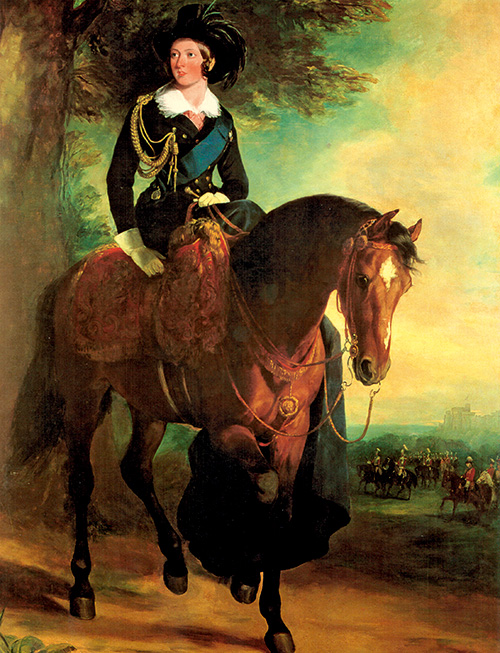 弗朗西斯 ? 格蘭特(1803-1878) 創(chuàng)作于 1840 年,木材油畫 目前儲藏于倫敦陸海軍下級軍官俱樂部 蘇格蘭畫家弗朗西斯 ? 格蘭特曾任皇家學(xué)院的校長,多次為維多利亞女王畫像,同時(shí)也為許多杰出的英國貴族和政治人物畫像。在這張畫像上,年輕的女王從容優(yōu)雅地騎在棕色的坐騎上,這也是最能展現(xiàn)她美麗的畫作之一。身后的寢宮及城堡在向世人展示著她的地位,皇室權(quán)威的形象在此顯露無疑。此畫中,女王得體優(yōu)雅的儀態(tài)舉止與放松的氛圍協(xié)調(diào)一體,流露出了女王內(nèi)心深處平易近人的一面。 畫中的維多利亞女王坐在女士馬鞍上,在現(xiàn)實(shí)中,女王也非常愛馬并且熱衷于賽馬。據(jù)說有一次她與叔叔威廉四世賽馬,最后還贏了叔叔一匹馬。還有一次,在觀看阿斯科特的賽馬比賽時(shí),女王曾激動得想要試著親自參加決賽,竟然將皇室包廂的窗戶打破了。英國皇室一直熱衷于馴養(yǎng)馬匹,尤其喜歡賽馬運(yùn)動,這一傳統(tǒng)他們?nèi)员A糁两瘛?/div> |
