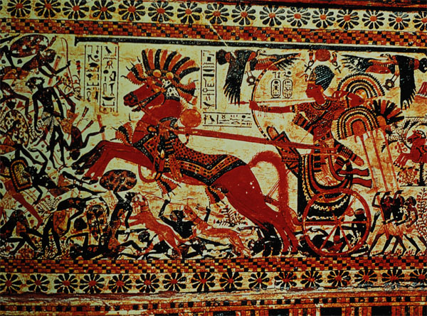 埃及 圖坦卡蒙駕戰(zhàn)車痛擊非洲人(局部) 公元前1567-1320年左右; 木制,彩繪 ;開羅,埃及國家博物館 這幅描繪年輕的法老王圖坦卡蒙(約公元前1370-1352年)狩獵非洲人的圖畫與其它幾幅屬于一個裝飾華麗的木箱表面的裝飾畫。該木箱是在圖坦卡蒙的墓中發(fā)掘出來的一件珍寶。發(fā)現(xiàn)時(shí)木箱表面五彩繽紛,色澤鮮亮,雖歷經(jīng)萬年仍保存完好,令人驚嘆。 畫面中,年輕的法老王站在由兩匹充滿力量與激情的駿馬所牽引的戰(zhàn)車中,一匹栗色露牙,另一匹則是棕色。這兩匹阿拉伯種馬飛奔向前,高高躍起,避開跌倒在地的敵人,攻擊狂野有力,與主人勇敢無畏的脾性相映生輝。而圖坦卡蒙則將韁繩纏繞在自己的腰間,空出兩手張弓瞄準(zhǔn)敵人。 不久前,人們開始置疑有關(guān)圖坦卡蒙死于謀殺的說法,并提出另一種假設(shè),他有可能是從戰(zhàn)車上摔下致死。無論如何,將韁繩纏繞在自己的腰間是一種很危險(xiǎn)的做法,極其容易導(dǎo)致發(fā)生意外。 |