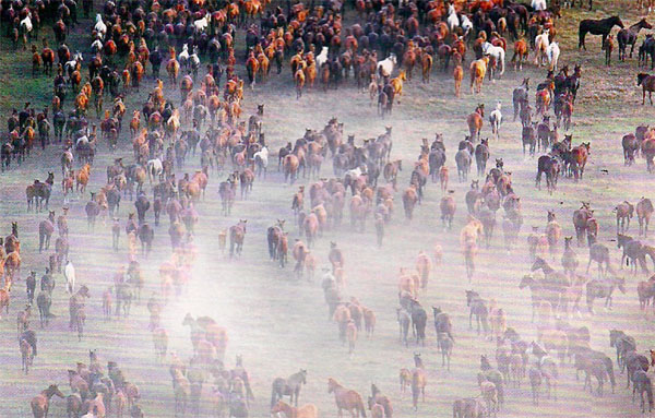 2009年9月25日,新疆伊犁大草原上舉行了“萬(wàn)馬奔騰迎亞運(yùn)”活動(dòng),這個(gè)活動(dòng)采用的是新疆特有的伊犁馬。人們喜歡馬,并非僅源于它在科學(xué)和遺傳上的意義,而是更喜歡它張揚(yáng)自由的生命,喜歡它野性十足、激昂放縱的精神。馬代表個(gè)遠(yuǎn)去的時(shí)代,伊犁大草原大概還會(huì)記得100年前它們的雄風(fēng),這個(gè)幫助人類飛馳過原野、荒漠的朋友,大大提高了人類的文明進(jìn)度。 遠(yuǎn)處一聲悠長(zhǎng)的嘶鳴,穿透了寧?kù)o的草原,萬(wàn)馬奔騰而至,蹄聲響徹云霄。這一刻生氣蓬勃,呈現(xiàn)出渾然一體的美,像王子領(lǐng)軍出征的軍隊(duì),正在伊犁大草原上。沿著追尋自由的一幕大戲。無(wú)數(shù)個(gè)渴望自由的靈魂,在無(wú)邊的原野上奔馳而過,像風(fēng)和電一樣,追趕先祖的背影。 |