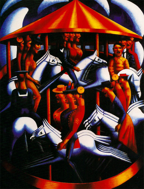 旋轉(zhuǎn)木馬【1916年】;馬克·格特勒(1891-1939年) 布面油畫,189.2×142.2cm;倫敦,泰特美術(shù)館 旋轉(zhuǎn)木馬場(chǎng)中,姿勢(shì)僵硬、因受到驚嚇而目光呆滯的人們騎著蒼白如幽靈般的馬兒,一圈圈地不停旋轉(zhuǎn),永不靜止。格特勒將旋轉(zhuǎn)木馬--這個(gè)傳統(tǒng)上與歡樂和孩子聯(lián)系在一起的元素,以如此離奇、荒唐的方式呈現(xiàn)出來,更凸顯出整幅畫面的錯(cuò)亂感。這幅《旋轉(zhuǎn)木馬》創(chuàng)作于第一次世界大戰(zhàn)期間,反映了格特勒對(duì)無休止戰(zhàn)爭(zhēng)的評(píng)論。這幅畫被視為戰(zhàn)爭(zhēng)期間最重要的幅作品,當(dāng)時(shí)不僅飽受贊譽(yù),也遭到了嚴(yán)厲的批評(píng)。格特勒作為和平主義者和波蘭猶太移民的后裔,非常激烈地反對(duì)英國(guó)參戰(zhàn),他的這一觀點(diǎn)在這幅無比獨(dú)特的畫作中也得以充分的展現(xiàn)。 1916年10月,格特勒就這幅作品寫道:“我生活在一個(gè)經(jīng)常過度興奮的狀態(tài)中,我的作品和我的構(gòu)想總令我十分激動(dòng)。我?guī)缀鯚o法承受這一切,并長(zhǎng)期感到不適。有時(shí)在完成一天的工作后,我都不能走動(dòng)了?!?/div> |