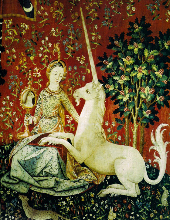 法國(guó)巴黎,國(guó)立中世紀(jì)博物館 創(chuàng)作時(shí)間:15世紀(jì),作品材質(zhì):哥白林織花壁毯 獨(dú)角獸在傳說中通常被描述為一種具有馬身,頭頂有只單角的動(dòng)物。也有傳說獨(dú)角獸具有羚羊后腿,獅子尾巴和山羊胡子。在中世紀(jì)基督教界,獨(dú)角獸象征宗教和長(zhǎng)久。一些希伯來圣經(jīng)的早期譯本中曾經(jīng)講到獨(dú)角獸,并且說它具有神職,象征著純潔。雖然當(dāng)它身陷絕境時(shí)會(huì)兇殘搏斗,但人們相信,獨(dú)角獸會(huì)被純潔的少女所馴服,因此許多中世紀(jì)藝術(shù),包括木刻,燈彩,以及織錦等常出現(xiàn)有關(guān)獨(dú)角獸將頭溫柔地靠在少女懷中的描述。 有些基督教傳說獨(dú)角獸總是和圣母瑪麗亞在一起,說它就是救世主耶穌。依據(jù)傳說獨(dú)角獸之角極其珍貴,具有可以治愈一切疾病的神奇功力。人們?yōu)榱朔蓝?,曾盛行使用?dú)角制成的杯子。由于獨(dú)角獸象征了純潔、勇敢、善良及尊嚴(yán)等品質(zhì),它的圖形紋章風(fēng)行于中世紀(jì)。 這幅壁毯是一組哥白林壁毯中的一幅。其中的五幅分別表現(xiàn)了人的五種知覺,第六幅《視覺》則表現(xiàn)了愛與愿望。 |