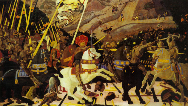 作者:保羅·烏切洛;倫敦,英國(guó)國(guó)家美術(shù)館;作品時(shí)間:約1450年 保羅·烏切洛是15世紀(jì)惠大利最具魅力的畫(huà)家之一,他一生致力于透視畫(huà)法的研究,《圣羅馬諾之戰(zhàn)》是他晚年為了紀(jì)念1432年佛羅倫薩戰(zhàn)勝錫耶納之戰(zhàn)而創(chuàng)作的杰出作品。該繪畫(huà)可能是科西莫·迪·美第奇為了裝飾美第奇宮殿而向畫(huà)家訂購(gòu)的,我們看到這幅是三幅描繪同樣戰(zhàn)斗場(chǎng)面繪畫(huà)中的一幅。畫(huà)面中央騎白色戰(zhàn)馬的是佛羅倫薩軍隊(duì)的司令官,是科西莫的朋友、支持者尼克羅·達(dá)·特倫提諾。 畫(huà)家通過(guò)精確巧妙的構(gòu)思,將觀賞者的視線(xiàn)吸引到尼克羅身上。通過(guò)馬匹色調(diào)的對(duì)比和長(zhǎng)矛所構(gòu)成的斜線(xiàn)指向突出了尼克羅的重要性。透視法展現(xiàn)出的如同舞臺(tái)一樣的空間,其背后的樹(shù)叢和風(fēng)景如同舞臺(tái)上的彩畫(huà)幕布。畫(huà)面從前景的三匹躍起的戰(zhàn)馬到中間的騎士混戰(zhàn)向遠(yuǎn)處陡坡上兩名騎士的背影延展開(kāi)去。 畫(huà)面中的馬,鼻孔張開(kāi)雙眼睜大。這種嘶嗚驚恐的樣子一定來(lái)自于畫(huà)家的觀察,但卻給人術(shù)制的感覺(jué),似乎不是血肉之軀,簡(jiǎn)直就是童話(huà)中的木偶馬,這種高度格式化的馬形象在繪畫(huà)語(yǔ)言中前無(wú)來(lái)者。烏切洛用充滿(mǎn)游戲情趣的透視法,與騎士胯下的猶如木馬般的戰(zhàn)馬來(lái)調(diào)和畫(huà)面里洋溢的非現(xiàn)實(shí)性的氣氛,既真實(shí),又充滿(mǎn)虛幻,這當(dāng)然是繪畫(huà)大師的獨(dú)具匠心。 在那遙遠(yuǎn)的冷兵器時(shí)代,馬作為戰(zhàn)爭(zhēng)的工具,同主人一樣沖鋒陷陣,經(jīng)歷血雨腥風(fēng),面對(duì)冰冷的長(zhǎng)槍鐵錨,聽(tīng)著震耳的喊殺聲,馬的無(wú)畏和勇敢來(lái)自于它的本性,它的精神,它與主人榮辱與共的結(jié)盟。當(dāng)我們?cè)趲装倌旰蟮慕裉煨蕾p大師的《圣羅馬諾之戰(zhàn)》時(shí),只知道坐在馬背上的將軍的名字,卻不知道那匹馬的名字,這也許就是馬對(duì)人類(lèi)的高貴奉獻(xiàn)所在吧! |