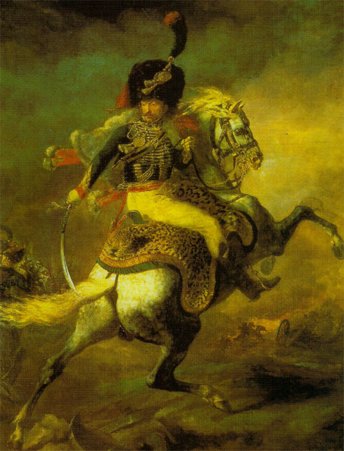 泰奧多爾·席里柯,生于18世紀(jì)末19世紀(jì)初期,法國(guó)浪漫主義天才。他悲劇性的人生既短暫又充滿(mǎn)波折,自幼崇拜馴馬演員,一生與馬緊密相連,畫(huà)馬的作品達(dá)千幅,年僅33歲卻不幸墜馬身亡。 這幅《輕騎兵軍官》是席里柯早期的成名作,是他在1812年入選沙龍并榮立金獎(jiǎng)時(shí)的一幅作品,描繪的是一位揮刀馳騁的騎兵軍官躍馬戰(zhàn)場(chǎng)的場(chǎng)景。據(jù)說(shuō),畫(huà)家是看到后腿直立,前腿躍起的軍馬得到這幅畫(huà)的靈感。 在欣賞這幅作品時(shí),首先我們要了解當(dāng)時(shí)的歷史背景。那時(shí)法國(guó)處在一個(gè)動(dòng)蕩不安的時(shí)期,拿破侖發(fā)動(dòng)的戰(zhàn)爭(zhēng)給人們的生活帶來(lái)了巨大變化,并暫時(shí)取得了空前的勝利。從騎士騎坐的馬鞍我們就可以看出,豹紋的馬鞍傳達(dá)著異國(guó)風(fēng)情的要素,這暗示著拿破侖的勝利已擴(kuò)大到歐洲大陸以外的地區(qū)。再看馬鐙,青色戰(zhàn)馬狂暴地以后腿站立,騎兵松緩韁繩,腳卻牢牢地蹬住馬鐙,輕松地控制著馬,使人感到人馬合一的最高境界,也暗示著戰(zhàn)爭(zhēng)的空前勝利給人們帶來(lái)的歡欣鼓舞。畫(huà)面遠(yuǎn)處的大炮殘骸則強(qiáng)調(diào)了這次沖鋒的激烈和敵人前線(xiàn)已被突破的狀況。面對(duì)騎兵的沖鋒,四散奔逃的敵軍發(fā)瘋似的穿過(guò)火墻逃亡遠(yuǎn)處。畫(huà)家在這幅作品中,著力渲染動(dòng)蕩緊張的氣氛,借助富于張力的躍馬動(dòng)作、強(qiáng)烈的光影對(duì)比、生動(dòng)的造型、特寫(xiě)式的拉近場(chǎng)景,使觀(guān)眾親臨其境似的感受到硝煙滾滾戰(zhàn)馬嘶嗚的戰(zhàn)場(chǎng)廝殺之中。 從人類(lèi)躍上馬背,馬從來(lái)就不是戰(zhàn)爭(zhēng)的旁觀(guān)者,馬的動(dòng)力驅(qū)動(dòng)著歷史的車(chē)輪滾滾向前。相對(duì)軍官,畫(huà)面中的青色公馬的撼烈無(wú)畏更讓人記憶深刻。 |
