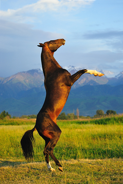 “汗血馬”,學(xué)名阿哈爾捷金馬,目前全世界有純種汗血馬約 4000 匹,該馬原產(chǎn)地為土庫(kù)曼斯坦,它是世界上最古老、最獨(dú)特的馬種之一,是曾經(jīng)被稱為“土庫(kù)曼馬”的古老馬種中最獨(dú)特的一族。詩(shī)人和歷史學(xué)家記載了這種馬數(shù)以千年的歷史,贊揚(yáng)了它的優(yōu)雅、力量、耐力和美麗。 歷史回顧 公元前 126 年,中國(guó)漢代卓越的探險(xiǎn)家、旅行家與外交家,對(duì)絲綢之路的開(kāi)拓有重大貢獻(xiàn)的張騫從西域回來(lái)說(shuō)大宛國(guó)“多善馬,馬汗血,其先天馬子也”,使我們第一次聽(tīng)說(shuō)西域有這樣的一種良馬,后來(lái)管這種馬叫大宛馬、宛馬、宛天馬、貳師馬、天馬、汗血馬、汗血寶馬等,從此 2000 多年的詩(shī)詞歌賦都不停地歌頌這一神奇而偉大的馬種,汗血馬不僅成了“良馬”的代名詞,而且在我國(guó)形成了一種獨(dú)特的“汗血馬文化”現(xiàn)象。 名字來(lái)源 土庫(kù)曼有兩個(gè)著名的馬種,一個(gè)是阿哈爾捷金馬,一個(gè)是約姆德馬,以前都混稱為“土庫(kù)曼馬”等名字,并不存在“阿哈爾捷金馬”這個(gè)名字。直到 19 世紀(jì) 20 年代,因生活在阿哈綠洲上的特克部落所擁有的馬最好而遠(yuǎn)近聞名,當(dāng)時(shí)已有了“阿哈——特克——汗部落馬”的概念,19 世紀(jì)中后期正式有了“阿哈特克馬”(土庫(kù)曼語(yǔ):Ahal-teke aty)的名字。其中,“阿哈”一詞取自“阿哈綠洲”,“特克”(土庫(kù)曼語(yǔ)本意為“公羊”)取自土庫(kù)曼最大的部落——特克部落?!鞍⒐柦萁瘃R”一名譯自俄語(yǔ)。 勿要迷信《相馬經(jīng)》 《相馬經(jīng)》云:“膺下欲廣一尺以上,名曰‘挾尺’,能久走。”指胸要寬,而阿哈爾捷金馬不但胸很窄,而且身體也都狹窄,似“鯽魚(yú)片子”。阿哈爾捷金馬的頸高舉,稱之為“鹿頸”,有專家說(shuō)不利于跳越障礙。《相馬經(jīng)》又云:“背欲短而方,脊欲大而抗。”阿哈爾捷金馬的背卻相對(duì)“長(zhǎng)”。阿哈爾捷金馬的外形使其特別,不同于其他馬品種。一些權(quán)威專家認(rèn)為阿哈爾捷金馬集合了幾乎所有通常的外貌弱點(diǎn)(諸如窄胸、鹿頸、吊肚子),盡管如此,它還是有著驚人的美麗和靈性,有著傲人的貴族氣質(zhì),有著飛鳥(niǎo)一般翱翔的速度。所謂權(quán)威專家的解讀是源于用尋常的尺度去衡量非同尋常的馬,這是過(guò)于迷信《相馬經(jīng)》教條的結(jié)果。 優(yōu)雅的外貌 阿哈爾捷金馬頭部結(jié)構(gòu)細(xì)致優(yōu)美,與身體結(jié)構(gòu)和諧,臉頰寬。直頭或略凸,眼大而炯炯有神。鼻孔寬、薄而干燥。耳長(zhǎng)、機(jī)警,狀如削竹,耳距略寬。常呈“鹿頸”。頸礎(chǔ)高,幾乎垂直于身體。鬃毛與鬣毛不是很長(zhǎng),多數(shù)表現(xiàn)稀疏。嘴角線一般高于鬐甲。身體似管狀,胸窄背長(zhǎng),肋骨架淺,腰長(zhǎng)而不顯,后軀窄,這對(duì)其他馬來(lái)說(shuō)這無(wú)疑是噩夢(mèng)般的缺點(diǎn),它們瘦削修長(zhǎng),但筋腱有力;尻相對(duì)長(zhǎng),肌肉發(fā)達(dá),呈正尻。鬐甲高、長(zhǎng)且富于肌肉;肩部長(zhǎng)而傾斜良好,肩礎(chǔ)輪廓分明;皮毛超常的細(xì)軟且淺薄,這些特點(diǎn)符合典型的沙漠型馬。另一特點(diǎn)是馬尾短而稀疏、順滑,跑起來(lái)尾巴呈流線形。腿部長(zhǎng)、輪廓分明、緊密,筋腱清楚分明。兩前肢通常靠近并且直立,前臂長(zhǎng),兩后肢長(zhǎng),飛節(jié)高。馬蹄略小且堅(jiān)硬,形狀規(guī)整,蹄踵低,球節(jié)部有少量距毛或無(wú)距毛。阿哈爾捷金馬的系部與眾不同,其他品種馬前系部略長(zhǎng),并較后系部?jī)A斜,但是阿哈爾捷金馬的后系部并不短于前系部,反而較前系部?jī)A斜一些?;蛟S是松軟的沙地造就了阿哈爾捷金馬特殊的系部結(jié)構(gòu)。 獨(dú)特的毛色 阿哈爾捷金馬的毛色之美也是其他同類無(wú)法相比的,一些帶有黃毛色的馬之毛色閃金光,一些青馬的毛色閃銀光。在純血馬培育時(shí),曾引入許多東方的良種阿拉伯公馬,其中有“兔褐阿拉伯”(Dun Arabian)、銀鬃的“Darcis Yellow Turk”,有關(guān)學(xué)者根據(jù)毛色就可以做排除的結(jié)論,確信這些馬不是阿拉伯馬,而是阿哈爾捷金馬。 根據(jù) 2005 年發(fā)表的《純種阿哈爾捷金馬品種登記冊(cè)》對(duì) 3567 匹馬的統(tǒng)計(jì)表明,黑色占 12.6%,騮色占 38.5%,鹿皮色(注:相當(dāng)于金色海騮、金色兔褐)占 24.2%,栗色占 10.2%,銀鬃色占 5.4%,銀河色(珍珠白、落地白)占 2.9%,青色占 6.2%。阿哈爾捷金馬公馬的體高范圍為 147—167cm,平均為 158.9cm。母馬為 145—173cm,平均為157.3cm。阿哈爾捷金馬毛色復(fù)雜多樣,在西方被譽(yù)為“歷史之父”的希羅多德記述了這種“閃金光”的駿馬,而東方的偉大史學(xué)家司馬遷記述了這種“汗血”馬,從不同的角度,描述了同一種寶馬。 運(yùn)步特點(diǎn)與秉性 阿哈爾捷金馬的運(yùn)動(dòng)是獨(dú)特的。當(dāng)它運(yùn)步時(shí),轉(zhuǎn)動(dòng)頭部、變換靈敏的耳朵、起揚(yáng)(用后肢站立,古人稱之為“人立”)等等,都絕對(duì)令人著迷。阿哈爾捷金馬是沙漠的精靈,所以它的步態(tài)一定要適合于沙地,非常柔軟有彈性。盡管阿哈爾捷金馬的系部略垂直,但行走卻很流暢,抬腿很低,有如滑行,無(wú)身體搖擺,平衡度更好,都是為了節(jié)省能量