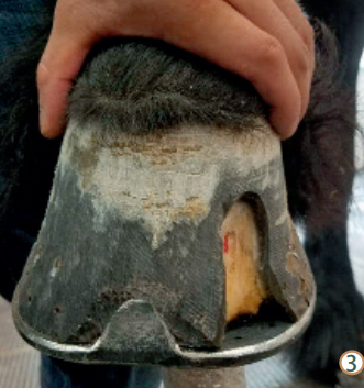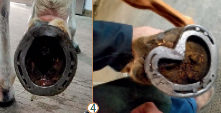 馬蹄位于馬肢體末端,是馬身體與地面接觸的最前線,有支撐、緩沖、保護(hù)和推進(jìn)等重要功能。常言道:“無蹄則無馬”,足以證明蹄部在馬匹運(yùn)動(dòng)生涯中的重要性。當(dāng)下,馬匹的用途已從早期的拉車、耕地、載貨轉(zhuǎn)變?yōu)楦咚降母?jìng)技,使得性能最大化與過勞傷間僅一墻之隔。而作為專業(yè)蹄部護(hù)理的修釘蹄工作也日益精細(xì)化和專業(yè)化。起初,釘蹄鐵的目的只是為了防止過度磨損,但現(xiàn)在的蹄鐵既可以用來提高競(jìng)技水平,又能治療某些跛行問題。今天,我們要從更加深入的角度來聊一聊修釘蹄那些事兒。 一、理論基礎(chǔ) 蹄部解剖結(jié)構(gòu),自不必多言,凡有心養(yǎng)馬、養(yǎng)好馬者皆已從各種途徑了解和學(xué)習(xí)過這類基礎(chǔ)知識(shí),以便于日常護(hù)理。除此之外,修釘蹄工作更關(guān)注的是:蹄部平衡、蹄部角度、蹄尖長(zhǎng)度、滾動(dòng)、蹄底厚度以及平整度。 平衡 蹄部平衡是近些年才逐步流行起來的一個(gè)說法。蹄部平衡又可細(xì)分為幾何平衡、動(dòng)態(tài)平衡;內(nèi)外側(cè)平衡、背掌側(cè)平衡等。幾何平衡指的是:當(dāng)馬匹處于休息狀態(tài)時(shí),蹄子應(yīng)該是對(duì)稱的,而且蹄子向地面垂直于肢體縱軸(如圖 1)。這樣,肢體的重量會(huì)均勻地分布在各承重結(jié)構(gòu)。動(dòng)態(tài)平衡:理想情況下,落地時(shí)首先雙側(cè)蹄踵同時(shí)與地面接觸,隨后進(jìn)入緩沖期,由蹄壁與諸如指墊、指 / 趾深屈肌腱等軟組織將沖擊能量緩沖吸收,當(dāng)縱向減速度為零后,骨質(zhì)結(jié)構(gòu)逐步接管,進(jìn)入支撐階段。當(dāng)然很多馬也會(huì)出現(xiàn)平踏的情況,即整個(gè)蹄底直接落地。少有蹄尖先著地的情況出現(xiàn)。不恰當(dāng)?shù)钠胶鈺?huì)使得某一點(diǎn)或一側(cè)承壓過度,進(jìn)而引發(fā)蹄踵切變、蹄壁扭轉(zhuǎn)、蹄裂等問題。遺憾的是,日常工作中幾乎無法同時(shí)滿足所有的平衡。 長(zhǎng)度 蹄尖長(zhǎng)度是從蹄尖向地面到蹄冠處的距離。蹄尖長(zhǎng)度與蹄子飛行期的最大高度、蹄子縱向速度、起步點(diǎn)與最大高度間的水平距離以及滾動(dòng)密切相關(guān)。增加蹄尖長(zhǎng)度可以增加高度和縱向速度,但也會(huì)延緩滾動(dòng),使得起步階段指 / 趾深屈肌腱對(duì)足舟骨黏液囊的壓力升高,而且容易引發(fā)球節(jié)的懸掛結(jié)構(gòu)損傷。所以修釘蹄要根據(jù)馬匹的具體用途、性能而決定。 角度 蹄子角度是背側(cè)蹄壁與蹄子向地面所呈的夾角。一直以來,人們認(rèn)為正常的蹄子角度應(yīng)該是前蹄45-50 °,后蹄50-55 °。但這個(gè)結(jié)論已被證實(shí)是有誤的,因?yàn)椴]有將肢體構(gòu)造考慮在內(nèi)。理想的蹄子角度應(yīng)該是:立定姿勢(shì)下,背側(cè)蹄壁、蹄踵的角度與系蹄軸恰好平行(如圖 2)。蹄子角度過陡(系蹄軸前突)或過緩(系蹄軸后凹)都會(huì)改變肢體的受承壓結(jié)構(gòu),從而容易引發(fā)組織結(jié)構(gòu)損傷。角度過緩時(shí),指 / 趾深屈肌腱承壓增加,容易引發(fā)足舟骨綜合癥、蹄裂等疾??;過陡時(shí),則指 / 趾淺屈肌腱和懸韌帶承壓增加。 滾動(dòng) 滾動(dòng)是運(yùn)步階段,從蹄踵始離地面到蹄尖離開地面的這個(gè)時(shí)段。隨著蹄踵與蹄底逐步離開地面,地面作用力完全集中于蹄尖處,使得背側(cè)蹄壁壓力和指 / 趾深屈肌腱的副韌帶張力達(dá)到極值。蹄鐵滾動(dòng)做得好,那蹄尖處的力臂則會(huì)相應(yīng)變短,這樣蹄子離開地面會(huì)更容易。 厚度 蹄底厚度是蹄子向地面到內(nèi)部真皮間的距離。蹄底角質(zhì)具有保護(hù)內(nèi)部真皮組織免受外傷的作用。蹄底的厚度從外觀很難直接測(cè)量,需要借助影像設(shè)備,如 X 光才能確定。蹄底過薄,則容易使內(nèi)部結(jié)構(gòu)受損,出現(xiàn)淤血等問題,進(jìn)而引發(fā)馬匹跛行。當(dāng)然這種問題可以添加額外材料,如足墊等保護(hù)蹄底。 二、蹄部常見疾病的修釘蹄處理 蹄部疾病種類眾多,大致可分為:蹄匣功能紊亂(蹄叉腐爛、白線病、蹄壁缺損、蹄裂、蹄踵內(nèi)收、切變、角質(zhì)瘤),蹄部膿腫,外傷(刺傷、挫傷等),蹄潰瘍?。–anker),蹄側(cè)副軟骨功能紊亂(礦化、壞死等),骨折(蹄骨骨折、足舟骨骨折),關(guān)節(jié)結(jié)構(gòu)功能障礙(滑膜炎、骨關(guān)節(jié)炎、囊腫樣損傷、軟骨損傷等),軟組織損傷(指/趾深屈肌腱傷、籽骨奇韌帶傷、側(cè)副韌帶傷等)以及蹄葉炎等。臨床中,特殊的修釘蹄方法常用于輔助治療,配合關(guān)節(jié)注射、抗炎藥或再生療法等方法會(huì)使得治療事半功倍。下面我們分享幾種常見疾病的修釘蹄方法。 白線病和/或蹄壁空鼓 白線病多數(shù)是因?yàn)榻琴|(zhì)質(zhì)量差或蹄子長(zhǎng)期處于溫?zé)岢睗竦沫h(huán)境中導(dǎo)致細(xì)菌或真菌從蹄底或釘孔處入侵蹄白線,使得蹄壁與內(nèi)部蹄葉組織分離??展某@^發(fā)于白線病或蹄葉炎等疾病。一般根據(jù)涉及蹄壁的面積來決定如何治療。如果僅是向地面處淺表的問題,則僅用蹄刀扣掉感染組織即可,無需過多處理;若是已向近端爬升,那就需要將被感染或空鼓部分全部切除,直至正常組織。如果切除的蹄壁面積很大,可以考慮使用補(bǔ)蹄膠將切除部分補(bǔ)齊,方便下釘,同時(shí)