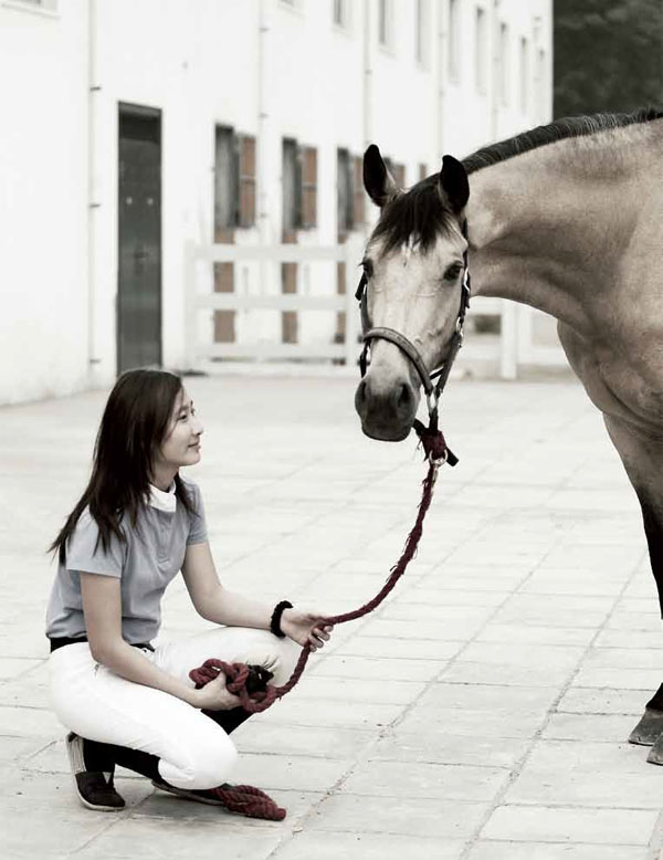 "一個(gè)花季雨季般美好的年齡,一個(gè)如花似玉般精致的臉龐,一份攬括世界般驕人的閱歷,一份安然篤定般少女的情懷,于是,她,王允允,一襲從容優(yōu)雅的騎馬裝,登場。" 記得父輩總會(huì)教育我們,要做個(gè)好孩子。和允允的談話進(jìn)行到一半,我已經(jīng)很確定她是這樣的孩子——勤奮聰明,乖巧孝順。中國的老話“言傳身教”,我想她首先該感謝的是父母,給了她這種人格養(yǎng)成的最深根脈。然而不容忽視的背后,有它們的相伴左右。 公主與馬 都說和馬做朋友是會(huì)改變?nèi)诵缘?,這一點(diǎn),允允很贊同。“你不是很喜歡小動(dòng)物嘛,今天帶你去個(gè)好地方!”3 年前允允在爸爸的陪伴下,于天星初試騎馬。爸爸沒有預(yù)料到,因?yàn)樵试誓昙o(jì)小,本能的害怕使她與馬之間產(chǎn)生了一種距離感。就這樣,匆匆結(jié)束了這次騎乘體驗(yàn),允允笑談:“爸爸很用心,只是那時(shí)對馬真沒有太特別的感覺!” 然而,也許冥冥中注定的,1 年后,允允從英國回北京的朋友再一次帶她走進(jìn)馬場,這一次,她的課余生活發(fā)生了改變。“開始我和朋友只覺得沒有新鮮的娛樂項(xiàng)目,不如干脆去馬場看看,沒想到,我突然對馬有了興趣,不再膽怯,而是滿心地想要騎好它?!边@次之后,允允就經(jīng)常自己去馬場。細(xì)心的爸爸看到了女兒的變化,用實(shí)際行動(dòng)表達(dá)著父愛的博大:一匹顏色特別的匈牙利溫血Verona 闖入了允允的世界。 和Verona 算是巧遇,有一次它的主人帶它去天星比賽,允允第一眼就被它的顏色吸引。初騎Verona時(shí),允允的技術(shù)不太好,經(jīng)常會(huì)被它扔下來,“后來我們相處很好,感覺上像家人一樣重要。它很聽我的,不用拉它,走到哪,它就跟到哪。非常戀我?!闭f到這里,15 歲的小姑娘臉上難掩美滋滋的表情。 在愛馬路上 對允允來說,自從擁有Verona,馬場就變成了一塊有著強(qiáng)大磁場的吸鐵石,允允把它當(dāng)做自己的孩子而絕非一個(gè)寵物。她每天下課之后都會(huì)去馬場“探班”,一待就是好幾個(gè)小時(shí),過得很開心。Verona 是匹母馬,有時(shí)候會(huì)耍脾氣。每當(dāng)允允忽略了它,少給了它吃的,或者輕輕地懲罰過它,或者來馬房后先去看望其他馬,它就會(huì)撒嬌生氣,轉(zhuǎn)過身不再理主人, “它雖然經(jīng)常有本事讓我哭笑不得,不過我覺得是它引起了我對馬的興趣,對馬術(shù)的興趣,開始喜歡談?wù)摵婉R相關(guān)的一切,也懂得了一些道理,付出一些還是值得的。” Verona 是允允最早擁有的馬,磨合時(shí)間比較長,允允知道它的每個(gè)小動(dòng)作代表的含義。而她從未在愛馬的路途上停滯不前,Verona 之后,她繼續(xù)擔(dān)當(dāng)著一個(gè)“好家長”的角色,悉心地照顧著超超和Gary,用心去接觸和認(rèn)識它們。允允口中的超超是匹優(yōu)質(zhì)馬,技術(shù)好,適合專業(yè)騎手;性格好,容易調(diào)教。超超還是典型的“兩面派”,在馬房和場地就像是兩匹馬。“它在馬房里非常老實(shí),正常睡覺,很乖,但在場地就特別興奮,跑啊跳啊,很是活躍和頑皮?!盙ary 是匹舞步馬,雖然是爸爸的馬,允允也是每次必定去馬房“報(bào)到關(guān)懷”。 周末的時(shí)候,允允會(huì)和它們整天在一起,是那種特別舒暢的狀態(tài),“心情不好的時(shí)候,只要有它們陪著我,我就什么都不會(huì)再想了。因?yàn)橛幸黄ヱR,每天去打理,訓(xùn)練,一起工作,是件再幸福不過的事,會(huì)很快忘記那些煩惱的事。大腦就是單純在想怎么和它們相處得更好,怎么騎得更好……” 既然不能坐享其成 “我不太記得自己被夸獎(jiǎng)過騎馬有天賦。剛開始膽子小,Verona 一鬧我就緊張,很怕摔?,F(xiàn)在就不同了,可以隨便摔。因?yàn)槲覞u漸明白一個(gè)道理:要想學(xué)好騎馬,摔跤是很難避免的。騎馬需要特別用心用腦。”允允把騎馬當(dāng)做了真正放松愉悅的一件事。每次訓(xùn)練結(jié)束后,她都會(huì)回想訓(xùn)練的過程,那些感覺好的地方以及存在的技術(shù)問題,通過記筆記來做一個(gè)梳理:步伐的變換——伸長或收縮;馬的體力需要加強(qiáng);用腿的反應(yīng);工作快步的步伐;自己放輕松;手不動(dòng)了不要忘記用腳;右手的問題;內(nèi)外方的彎曲;注意后肢的工作;注意手的位置;注意腿的輔助;注意步伐變換……。她很享受這種認(rèn)真記錄的過程,“也許我也是馬圈的一塊璞玉呢!”我很看好她。 賽事彷佛也大方地?cái)[出了姿態(tài),向努力的允允友好地招手。在2012北京馬術(shù)大師賽上,她和超超一起參賽拿到了青少年賽亞軍?!昂统黄鸷献鞯恼系K比較矮,是1 米的,那個(gè)時(shí)候沒想著和超超一起拿成績,因?yàn)樗且黄バ埋R,我們磨合得還不夠。在今年鳥巢的青少年組比賽,有個(gè)騎術(shù)很好的芬蘭女孩,之前和超超合作過,所以她來教我,使我第一天和第二天的表現(xiàn)很好,居然進(jìn)了決賽?!边@個(gè)結(jié)果是允允始料未及的。決賽的時(shí)候,因?yàn)樗睦锉容^亂,有個(gè)彎道本可以拐小,但她沒在合適的拐點(diǎn),致使最終有點(diǎn)小小遺憾地拿到亞軍?!澳谴蔚陌l(fā)揮不是很滿意,但比起之前在北京體育館的比賽,我還是稍稍有了點(diǎn)進(jìn)步?!?/div> “其實(shí)那段時(shí)間Verona 的狀態(tài)也特別好。記得第一天我騎完超超,再騎它時(shí),它拐彎特別好,速度很快