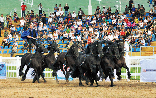 在表演之外,他為人謙遜,說話謹(jǐn)慎,性情寬和,感覺跟站在8匹奔跑的黑色弗里斯蘭馬背上、與風(fēng)浪搏斗時勇猛的他,或者在障礙賽中跳障礙的他實在有點不像??墒牵瑢τ谶@位來自馬術(shù)世家的傳統(tǒng)馬術(shù)表演者 Gabor Szegedi 而言,表演時充分展示自己國家的傳統(tǒng)馬術(shù)力量的興奮和野心,以及表演之后給予馬匹足夠的關(guān)愛和照料都很正常,沒有什么做作,也不帶些許虛偽。他跟許許多多實實在在的馬術(shù)人一樣,只是在用一顆純粹的心面對現(xiàn)代馬術(shù)無數(shù)的挑戰(zhàn)。 《馬術(shù)》:你為何決定要來一個離匈牙利這么遠的國家? Gabor Szegedi:現(xiàn)在想來,這就像是一種命運的安排。在我來中國之前,在匈牙利就曾想跟一個朋友商量一些關(guān)于我個人在馬術(shù)發(fā)展上的問題,這個人叫Vajk Bakaity,因為他當(dāng)時已經(jīng)在中國工作,我沒能跟他聯(lián)系上。他原本并不知道我找過他,但很巧的是過了幾天,他突然給我打了電話。他勸我應(yīng)該來中國,我應(yīng)該跟他合作起來,除了可以在中國參加障礙賽以外,我還可以把我的馬術(shù)秀帶到中國,中國人肯定會很喜歡。 那時候我還在挪威工作,從職業(yè)的角度來看我算是取得了一定成果,我在挪威教的小學(xué)生自己也學(xué)會表演了,而且參賽的表現(xiàn)也很好??墒?,我逐漸意識到應(yīng)該擴大自己的世界,朋友說的話不斷在我的腦中循環(huán),始終放不下。他第二次打電話勸我的時候,我就決定要向待了 10 年的挪威告別了,也要告別匈牙利,把自己的馬術(shù)文化帶到一個有同樣偉大馬術(shù)文化的國家。 《馬術(shù)》:你是如何在中國開始馬術(shù)表演生涯的? Gabor Szegedi:這也源于一個巧合。我來中國原本是要做西部巨人馬術(shù)俱樂部的障礙教練,不過俱樂部的主人駱翔在我還沒來之前買了 6 匹黑色弗里斯蘭馬,他告訴我這些馬以后就是我的責(zé)任了,我想怎么訓(xùn)練他們就怎么訓(xùn)練。我對俱樂部當(dāng)時就對我有這么大的信任和支持深為感謝。剛到北京的第一天,下飛機之后的幾個小時我就認識了一直到現(xiàn)在都在支持我的人娜佳(Nadya Kozinets),因為我將是她兒子的馬術(shù)教練。娜佳作為一個中國文學(xué)的博士、漢學(xué)家和障礙馬馬主教會了我很多東西,就連現(xiàn)在我也有很多事情是在她的幫助下解決的。 我開始訓(xùn)練那 6 匹黑馬,教他們做匈牙利語里名叫“草原 5 匹馬”的表演??闪钗覜]想到的是,訓(xùn)練弗里斯蘭馬做匈牙利傳統(tǒng)的馬術(shù)表演會如此艱難。弗里斯蘭馬跟匈牙利馬不一樣,有時候會突然變得緊張,需要更長時間和更多的練習(xí)才能學(xué)會同一件事情。有一段時間,我差點承認失敗,自己也覺得可能我就是做不到。后來,我花了漫長的 5 個月終于成功將這些馬練出來,并可以進行這個表演。我們從馬場舉辦的表演開始,進而慢慢參加更大的活動,同年 10 月,我們就登上了浪琴表北京大師賽的舞臺?,F(xiàn)在我會帶著 8 匹馬表演,而且近期我們正打算繼續(xù)增加表演馬匹的數(shù)量。 《馬術(shù)》:做這種表演肯定要承受很大的壓力,那你對要參加的活動有什么組織方面的要求嗎? Gabor Szegedi:做表演的時候,我們的目標(biāo)是給觀眾傳達表演的力量,讓他們覺得整件事情很輕松,因此他們并不能看到背后的工作有多重??梢哉f,這是一種藝術(shù),而且為了做到這一點,我們需要組織方在場地和馬匹安置方面給予一點幫助。 我每次跟大家只說一句:如果我的馬睡得不踏實,我也睡得不踏實。意思是,我們表演之前給馬匹提供的條件一定要好,一定要保證他們安全,可以休息好。我爸爸教過我一句話:馬匹是替我們跑在地面上的“同事”。有時候,我們?nèi)サ牡胤奖容^遠,要運輸?shù)臅r間長,需要組織方給馬提供馬房,給我們提供休息的地方。表演的場地最好要夠大,地面要干,且盡可能平整。大家可以想像,從站在馬背上的角度,5 匹馬可能還好轉(zhuǎn)彎,動作還有一定的緩沖度,但是 8 匹或者更多馬的群體隊伍已經(jīng)很長,我需要足夠的地方才能讓他們跑起來。如果場地太小或者太滑,很有可能馬匹會失去平衡,摔倒,甚至發(fā)生更嚴(yán)重的事故。其實這些大家只要用心一想就會明白。 《馬術(shù)》:你對自己的表現(xiàn)有怎樣的要求? Gabor Szegedi:我尊重觀眾,所以我希望每一次都能發(fā)揮出自己最好的表現(xiàn)。我們有時候會為了一個表演跟馬匹一起坐 30-40個小時的車,帶著幾百公斤的設(shè)備,我和助理經(jīng)常只能在夜里或者凌晨洗馬具,因為任何一個小東西,一個小細節(jié)都可以影響到第二天的表演。 表演之前一定要想清楚,這一切要承擔(dān)多么大的責(zé)任,要知道怎么讓馬匹在幾萬或者幾百萬人看他們的時候保持冷靜??刂撇蛔●R的話,情況會變得很危險,而且我不能允許自己表演的時候范這么大的錯誤。你要知道表演的場地哪里可以轉(zhuǎn),哪里可以讓馬匹開始跑,場地哪里有可以嚇唬他們的東西;你要做好一切準(zhǔn)備,在你沒有機會提前排練的情況下,也要能大概看明白會面臨哪些挑戰(zhàn);你要做足夠多的訓(xùn)練,絕對不能讓訓(xùn)練中從馬背上摔倒在地的體驗在表演的時候也發(fā)生。 《馬術(shù)》:在你表演的時候最想向觀眾傳達些什么? Gabor Szegedi:希望可以把兩國的馬術(