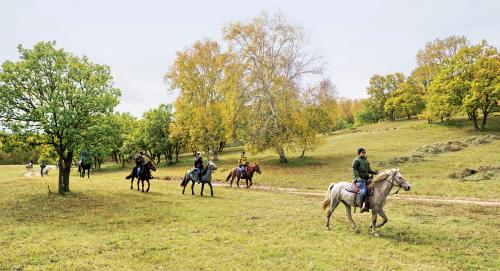 父親曾經(jīng),形容草原的清香, 讓他在天涯海角也總不能相忘; 母親總愛,描摹那大河浩蕩, 奔流在蒙古高原,我遙遠的家鄉(xiāng)。 如今,終于見到這遼闊大地, 站在這芬芳的草原上,我淚落如雨。 河水,在傳唱著祖先的祝福, 保佑漂泊的孩子,找到回家的路。 啊,父親的草原, 啊,母親的河! 雖然已經(jīng)不能用母語來訴說, 請接納我的悲傷、我的歡樂。 我也是高原的孩子啊,心里有一首歌, 歌中有我父親的草原、母親的河! 一首悠揚的歌,把我們帶到這片草原,這條河。 西拉沐淪河,是發(fā)源于內(nèi)蒙古赤峰克什克騰旗境內(nèi)的一條古老河流,其源頭出自烏蘭布統(tǒng)的的薩嶺河,河流全長397公里。這條河的歷史已有8000多年,其河水哺育了流域內(nèi)的各族人民,著名的紅山文化史前文明因早于黃河流域而被史學(xué)界譽為“祖母河”。整條河的海拔落差有1000多米,沿途多河匯流、吸納百川,最終形成了西拉沐淪河“山高谷深,河床迭跳,氣勢萬千”的壯觀風(fēng)貌。 西拉沐淪河的發(fā)源地烏蘭布統(tǒng)草原,地處華北平原和內(nèi)蒙古高原的接壤處,俗稱壩上。塞罕壩北麓,大興安嶺山脈與陰山山脈交匯處,地形地貌變化就很多樣,又處在渾善達克沙地最南端,所以這里濃縮了整個內(nèi)蒙古高原的風(fēng)景,有草原、森林、大山、沙漠、河流、湖泊、丘陵和濕地,林木花卉、野生動物大多保存完好,一派原生態(tài)的自然景觀。 在草原深處,有一處由沙漠中涌出的甘泉形成的湖泊。這湖還有個美麗的傳說:在康熙御駕親征葛爾丹的烏蘭布統(tǒng)戰(zhàn)役結(jié)束后,藍齊兒公主為了陪伴逝去的丈夫,養(yǎng)育兒子,而沒有返京留在了這里,但她思念家鄉(xiāng),思念父母,時間久了,滴淚成湖,就形成了這灣公主湖。公主湖常年地下水涌出成河,流經(jīng)小橋子、葫蘆諾日、透風(fēng)溝,與盤龍峽谷流出的西大河水合流,穿過石門峽谷,再與以樺木溝為源頭的河流一起匯聚成西拉沐倫河的上游——薩嶺河。 每年烏蘭布統(tǒng)草原的金秋時節(jié),來自全國的馬友都會匯聚于此,從西拉沐倫河源頭附近的葫蘆諾日村出發(fā),開啟西拉沐淪河的騎馬探索之旅。馬隊第一天穿過金秋風(fēng)景最美的南井風(fēng)景區(qū),到達薩嶺河后,沿河谷順流而行。 烏蘭布統(tǒng)草原秋色非常濃郁,五彩繽紛,山坡上的紅葉姹紫嫣紅,美不勝收,仿佛天庭的畫師打翻了顏料筒,撒在了這片草地上。草原中彎彎曲曲的小路,構(gòu)成了畫面中的曲線,恰似一幅重彩油畫。陽光照亮了白樺林,白白的樹干上搖曳著金黃色的葉子;橡樹,大大的葉子托著橡果泛著紅色;幾百年的老榆樹,還保留著夏季的翠綠;被打草機打過的草地,在陽光的照射下,平整地鋪在我們腳下;山影、樹影更襯托出亮部畫面的艷麗,使畫面層次感更強。山楊樹、落葉松、杏林、山丁子樹等,還有沙柳、紅柳、檸條等灌木叢,赤橙黃綠青藍紫,把這里裝扮成一個童話般的世界。 過了南井,就是片開闊地,這里被承包出去種了莊稼,有土豆、莜麥、小麥等,這里也是植被被破壞得嚴(yán)重的地方,農(nóng)民在西拉沐淪河上筑壩抽水,澆灌這片開墾過的農(nóng)田。但是景色依舊美麗,收割過的麥田,麥茬一片金黃,遠處層巒疊嶂的山坡,楊樹、樺樹、楓樹、松樹以及灌木等,層林盡染,五彩斑斕,風(fēng)景獨好。 過了這片農(nóng)田,就是薩嶺河下游的峽谷。河谷里,水草豐美,景觀奇特,成群的牛羊,悠閑地漫步在河畔,流動的西拉沐淪河水,與兩岸風(fēng)光秀麗的景色,互相疊加,像一個塞外桃源。這里有一個叫“德勒沁”的村莊,馬隊走到這里,都會不由自主地放慢速度,大約人馬都怕破壞了這安靜祥和的氣氛。 沿著河水流淌的方向前行,漸漸感受到西拉沐淪大峽谷的美,壯闊、雄渾! 有時,河水靜靜流過,像一首歲月的歌,幾千年中,在那洶涌浩瀚之間,溫柔地施予;又像母親的護佑,滋潤并養(yǎng)育著兩岸的生靈。正如歌中唱到:“河水,在傳唱著祖先的祝福,保佑漂泊的孩子,找到回家的路?!庇袝r,像一匹匹契丹戰(zhàn)馬,挾裹著塞外的蒼涼與野性,奔出大興安嶺,馳騁在草原上,匯入遼河,涌進浩瀚的渤海。更多的時候,它像一位久歷滄桑的老人,從遠古走來,緩緩淺淺,閑適平和,那寬大的河床,曲曲折折,訴說著它的興衰與變遷。 《呂氏春秋》、《淮南子》把西拉沐倫河列為“中國六大川”之一?,F(xiàn)代人對這里有很多的形容,比如“草原三峽”,“塞外江南”。 第一天行程結(jié)束,馬隊夜宿西拉沐淪大峽谷。西拉沐淪河里的高原冷水野生魚是晚餐必不可少的美味,旅人們對這一天所有的食色之期至此都得到了滿足。 第二天一早,馬隊再次啟程,穿行山谷之間,馬蹄下,是流淌的河水,兩側(cè)是長滿植被的山坡。內(nèi)蒙古高原的天氣百變,總好像在故意向我們炫耀。時而晴空萬里、白云朵朵,草原像翡翠般清澈透亮;時而大霧籠罩,草原、山巒、樹木,若隱若現(xiàn),朦朦朧朧,神秘莫測,仿佛一天便經(jīng)歷了四季交替。 走出峽谷,前方是需要翻越的海拔 1700 多米的小壩梁。山下是陰天,半山腰已經(jīng)在下雨,快到山頂時卻變成了雪花。到達山頂,眼前豁然開朗,不對,不是開朗,而是驚喜!就在我們腳下,山梁的另一面,正是一處世外桃源。眼前這條長長的峽谷叫小壩溝,金黃色的葉子,鋪滿了整個壩溝,兩面山坡上覆蓋著茂密的白樺林。 這時候的太陽好