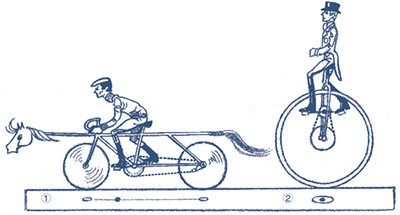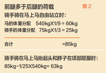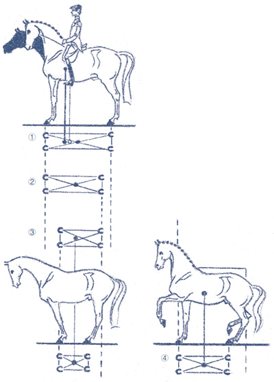 由莫里斯(General Morris)和鮑赫爾將軍(General Baucher)倡導(dǎo)了一個試驗,后來由圣·菲爾上尉 (Captain de SaitPhalle) 完成。其實馬的所有表現(xiàn)都是建立在“肩上”的,當(dāng)馬四條腿自由站立時,前腿上的承載重量平均比后腿多出大約1/9。 當(dāng)一位騎手坐在馬背中間時會加大這種不平衡,騎手體重的2/3將由前腿承載。 因此,馬的先天平衡在前肢。它的支撐面是一個比較窄的長方形,而重心比較靠前,后腿的力量完全是為了推進,這個結(jié)構(gòu)非常有利于發(fā)揮速度。如果騎手完全站在馬鐙上,則前腿承擔(dān)的重量就會超過4/5。這樣,這種二點式騎座姿勢和輕快步的目的就不言自明了(圖1)。 圖1 ①伸長平衡基礎(chǔ):為了加速 ②依靠平衡和動力:不穩(wěn)定平衡可在各方向上機動 越容易調(diào)動的馬,越容易訓(xùn)練。騎手采用不明顯的干預(yù)就能實現(xiàn)信任和各方面追求的結(jié)果。要實現(xiàn)這一點,需要通過整體建立 “不穩(wěn)定平衡”:只有在這些條件下把影響疊加在一起,質(zhì)量大的馬,才容易受到質(zhì)量小得多的騎手的影響。 查爾斯·拉伯 (Charles Raabe) 在《身體疊加的研究》一書中做了如下比喻:雜技演員把孔雀的羽毛垂直地放在他的鼻子上,然后不斷調(diào)整他身體的位置來保持羽毛的平衡。正是因為雜技演員不停地運動,羽毛才能保持這樣的不穩(wěn)定平衡而不至于倒下。 這是騎術(shù)的一個最基本的挑戰(zhàn):建立“不穩(wěn)定平衡”,輕易獲得強烈的機動性,并在需要的時候輕松放棄或重新獲得不穩(wěn)定平衡。這就是騎術(shù)收縮概念的簡單定義。 收縮:建立不穩(wěn)定平衡 抬高脖子,在項部屈服 莫里斯將軍(General Morris)和鮑赫爾(Baucher)的試驗顯示,如果允許頭和脖子完全伸長或盡可能地抬高,可以向前或向后轉(zhuǎn)移約馬匹全部體重的 1/25。一匹馬的體重大約 540kg,騎手的體重約為75kg,計算如(圖2)。 這個動作的調(diào)整明顯把馬的重量向后轉(zhuǎn)移了,但是還遠遠不夠(圖3)。 圖3 重心的位置和支持基礎(chǔ) ①沒有抬起馬頭和在項部彎曲脖子自由站立的馬 ②后腿深踏到身體下面的馬 ③站在前腿前面的馬 ④在正確的皮亞夫上 后腿的深踏 當(dāng)馬的后腿深踏到它的身體下面時,后腿可以承載更多的重量并可減輕前腿的負荷。從后面縮短了支撐的范圍并且重心落到了馬匹身體的中間,通過這種方法可以獲得相對的不穩(wěn)定平衡。 站在前面 如果相同的情況下,馬的前腿站的比胸前垂直線靠后,馬則在前面縮短了它支撐的基礎(chǔ),支撐的范圍變得更短。但是,它的肩會承載得更多,這是一個錯誤的站姿。好像“山羊站在山頂”。 后腿充分深踏的價值是調(diào)整重量分配。這個被稱為鮑赫爾第一種方法的“山羊站在山頂”的姿勢值得懷疑。實際上,它并沒有產(chǎn)生機動性,而是阻礙了馬的運動。 ·這時后腿由深踏受到拉伸會打開所有的關(guān)節(jié),因此封閉了任何向前運動的可能性,成為了一個被過分拉伸的彈簧。 ·因為腿在身體下面都是傾斜的,前腿移動也會非常困難,肩的活動范圍受到了強烈的限制。 ·同時,馬的肩部向后移動了一些,引發(fā)了脖子的過度屈撓,使馬的鼻孔落后于垂直線以后,這樣一來馬可能就會有避銜的危險。 這只是這個不利姿勢的一個方面,從側(cè)面看這需要馬的脊柱極度屈撓,弊大于利。 真正的收縮 真正的收縮才是騎術(shù)的“優(yōu)雅姿態(tài)”,它是允許騎手在不穩(wěn)定平衡下的持續(xù)運動,在“皮亞夫”上實現(xiàn)完美的理想狀態(tài)。
