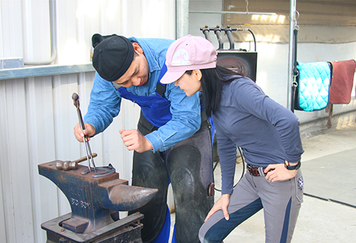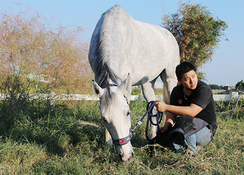 他,透過(guò)雙手雙眼,細(xì)膩表達(dá)著深邃敏感的內(nèi)心…… 在生命的悸動(dòng)里,熟悉硬冷的蹄鐵,將熱情灌注塑型。在生活的軌跡上,自我定位,注入新能量。在無(wú)畏的旅途中,標(biāo)記了百煉千錘的夢(mèng)想! 藍(lán)友謙,一個(gè)從小在馬場(chǎng)翻滾的小孩兒,總是自由自在地在馬房前來(lái)回蹓跶……恣意地與馬對(duì)談交心!由于父親是馬場(chǎng)經(jīng)營(yíng)者,又是資深教練,藍(lán)友謙比任何人更有理由學(xué)習(xí)馬術(shù)。但是,年幼的他,卻不喜歡騎馬,他不愿意見(jiàn)到馬匹身上套著韁繩、備著馬鞍、有著任何裝備,甚至不喜歡見(jiàn)到有人騎乘,他喜愛(ài)馬匹原本的純凈,沒(méi)有束縛的模樣。 由于沒(méi)有學(xué)習(xí)馬術(shù)的興趣,藍(lán)友謙剛上國(guó)中時(shí),嚴(yán)格的父親試圖為他找出發(fā)揮體能的有益運(yùn)動(dòng),將他送往了中國(guó)臺(tái)東的棒球隊(duì),開(kāi)啟他的棒球生涯。直到高中畢業(yè),當(dāng)時(shí) 17 歲的他,只身前往日本,繼續(xù)大學(xué)的學(xué)業(yè)。第一年上了語(yǔ)言學(xué)校,由父母提供學(xué)費(fèi),進(jìn)入大學(xué)之后,所有學(xué)費(fèi)及生活費(fèi)用,全部得靠自己打工賺取。藍(lán)友謙輕輕地說(shuō)著:“當(dāng)時(shí),我住在寄宿家庭,一邊上課一邊工作,靠著自己打工,賺取零用錢(qián),維持生計(jì)以及支付所有學(xué)雜費(fèi)用,連周六、周日也沒(méi)有固定的休息時(shí)間?!?nbsp; 大學(xué)畢業(yè)后,藍(lán)友謙和同齡人一樣奔波于各大單位的面試中,漸漸發(fā)覺(jué)朝九晚五的生活并不是自己想要的。此時(shí)他的腦海中不禁開(kāi)始思考著,對(duì)于“馬”自己始終還是最無(wú)法忘情的?!拔耶?dāng)時(shí)的想法是能夠接觸馬,長(zhǎng)久地跟馬在一起,那么除了‘騎馬’做個(gè)騎手之外,跟馬有關(guān)的就是釘掌修蹄?!彼f(shuō)。因此,在 25 歲時(shí)(一般都是 10幾歲開(kāi)始學(xué)習(xí)釘蹄),藍(lán)友謙不顧大家反對(duì),進(jìn)入日本裝蹄協(xié)會(huì)裝蹄教育中心。 “在日本學(xué)習(xí)釘蹄,跟自己想象中的還是有落差的?!彼硎荆捎谛7絿?yán)格的規(guī)定,每個(gè)人每天上午 6 點(diǎn)必需開(kāi)始清理馬房,依照馬房前黑板上標(biāo)注馬匹的草料份量來(lái)喂馬。每周六每位學(xué)生必須騎馬,主要為的是了解馬匹在行進(jìn)間的動(dòng)態(tài),注意馬匹四肢的伸展以及馬匹全身的重心分布。下馬后,刷洗馬匹,將馬安置回馬房。 在學(xué)習(xí)過(guò)程中,因?yàn)槎际浅鯇W(xué)者,怕傷了活馬,所以,學(xué)校是使用死蹄(馬尸體截取下來(lái)的馬腳)分發(fā)給學(xué)生一人一只,每一只死蹄都有一個(gè)編號(hào),學(xué)生必需自行保管。平時(shí)置于冰箱冷凍,上課時(shí)得事先從冰箱取出退冰,通常是上午取出退冰,下午上課教學(xué)用,上完課再包裝好放回冰箱。藍(lán)友謙說(shuō):“上課時(shí),大家手上都拿著一支馬腳,想象著跟一匹活生生的馬一起工作,真是很特別的經(jīng)驗(yàn)!” 在后期,學(xué)生們必須要了解馬腳的內(nèi)部結(jié)構(gòu),因此要上解剖課。去除馬皮后解剖,以便了解馬腳內(nèi)肌腱的牽引、肌肉的生長(zhǎng),認(rèn)識(shí)第一節(jié)骨、第二節(jié)骨以及蹄內(nèi)神經(jīng)的位置等,最后還要組合成完整形體,制成馬腳標(biāo)本。 在這個(gè)日本的裝蹄教育中心的老師也是出了名的嚴(yán)格!打蹄鐵有幾項(xiàng)要求,基本標(biāo)準(zhǔn)是:1. 在規(guī)定的時(shí)間內(nèi),把原本馬蹄形的蹄鐵,打成一根直挺挺的鐵條,寬、窄、厚、薄必需相等,兩端必須成 1 公分見(jiàn)方的正方形。2. 把蹄鐵打成數(shù)字形狀,0、1、2、3、4、5、6、7、8、9,線條要求平順,不能走樣。3. 一般考試的標(biāo)準(zhǔn)為:以 4 號(hào)蹄鐵為標(biāo)準(zhǔn)規(guī)格,從原本的一根鐵條敲打成馬蹄形的蹄鐵(前腳蹄鐵的鐵條長(zhǎng)度為 28 公分,后腳蹄鐵的鐵條長(zhǎng)度為 27 公分)。通常在 25 分鐘內(nèi)必需完成一個(gè)前腳蹄鐵及后腳蹄鐵。但日籍老師要求學(xué)生在 15 分鐘內(nèi)就必需完成。4. 在學(xué)習(xí)打蹄鐵時(shí),所使用的火爐必須學(xué)習(xí)使用傳統(tǒng)古法,即“焦炭火爐”來(lái)打鐵。由學(xué)生們自己燒煤炭生火,借助鼓風(fēng)機(jī)送風(fēng)讓火的溫度更高,由于高溫下的蹄鐵很容易就被烤熔,所以也讓學(xué)生們學(xué)習(xí)控制打鐵時(shí)的火力及速度。藍(lán)友謙微笑著介紹,據(jù)說(shuō)當(dāng)時(shí)他們這群學(xué)生是歷屆以來(lái)煤炭使用量最多的。因?yàn)槊總€(gè)人上課都非常認(rèn)真,都想把握機(jī)會(huì)學(xué)習(xí)……此起彼伏的敲擊聲,熱鬧得很哩! 在學(xué)校練習(xí)打蹄鐵的工廠(教室)前方 ,有一個(gè)專門(mén)設(shè)置的特殊步道,形似狗骨頭, 兩端為圓形場(chǎng)地,連接兩端圓形場(chǎng)地的是 10 幾公尺長(zhǎng)度的長(zhǎng)形步道,在步道前方另設(shè)有一個(gè)長(zhǎng)方形的凹槽地道,放置一個(gè)往下的階梯。這個(gè)特殊作用是:學(xué)生釘掌前及完成釘掌后,一人牽著馬匹來(lái)回在步道行走,另一人則進(jìn)入凹槽地道沿著階梯上下,眼睛的高度剛好跟步道的高度平行,可以去觀察正在行走的馬匹的腳底部修蹄是否完善?釘?shù)奶汨F是否合適?借著馬匹來