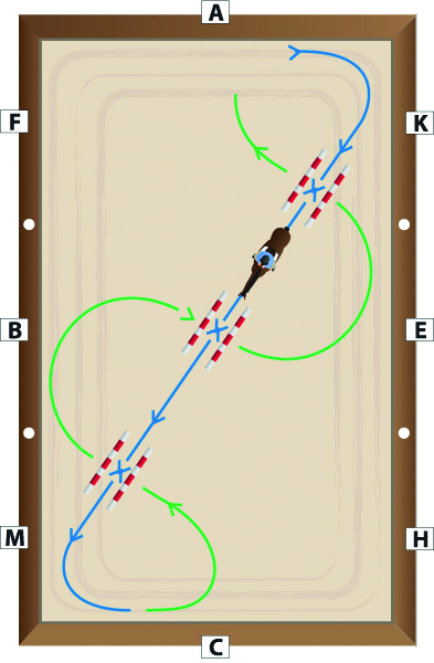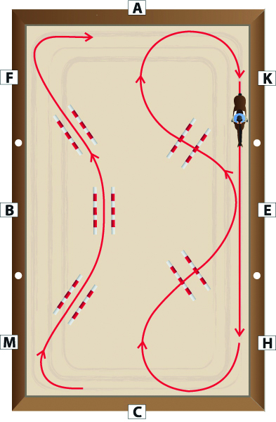 器材: 10根桿或者6根桿在左,4跟“卡瓦來提”在右。 設(shè)置: 沿長邊按單環(huán)蛇形路線擺放出地桿通道。兩桿中間通道寬度為1米。在另一側(cè)長邊擺兩組,每組的兩桿間距為1.3米,它們的位置放在你可以騎半圓進入隅角然后出角。 練習(xí)方法: