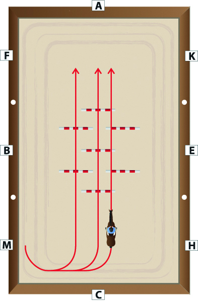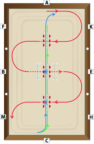 作為一名盛裝舞步騎手,你會習(xí)慣性的想象一個盛裝舞步場地以及各個級別所需的不同動作;你會考慮的是有節(jié)奏的四拍慢步,后肢積極工作的柔軟快步,以及又直又好的三拍步跑這些動作。 為了能達到這些目標(biāo),我們通常借助于不同步態(tài)之間或是同一步態(tài)之內(nèi)的移形轉(zhuǎn)換、曲線、圓和蛇形,對于更高級的馬來說,還有肩向內(nèi)的動作等等。 著名的德國騎手英格麗·克里姆克和杰西卡·范·布理多·韋恩德爾都是“卡瓦來提”進行舞步馬訓(xùn)練的積極倡導(dǎo)者。但是她們還是少數(shù),因為在大多數(shù)的馬房中,我們是很難找到一根地桿或者“卡瓦來提”的。 1.更好的節(jié)奏與平衡 器材: 4根桿,4個“卡瓦來提”或6根桿,4個“卡瓦來提”。 設(shè)置: 在G和D處分別放置2根地桿,形成與中心線平行的間距1.3米寬的胡同。在B和E之間設(shè)置卡瓦來提,間距1.3米。注意確保BE線上最內(nèi)的一對桿與在G和D處的一對桿在一條直線上。 練習(xí)方法: 3環(huán)蛇形,每個環(huán)到達長邊(紅線),輕快步過地桿。頻繁地變換方向可以鍛煉馬的后肢和背部,增強其力量。要求馬和騎手集中注意力,保持總從中間通過地桿。