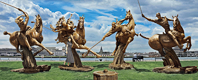 黃劍,全球唯一連續(xù)六屆為奧運(yùn)會(huì)創(chuàng)作永久性大型雕塑、首位被國(guó)際奧委會(huì)授予“奧運(yùn)藝術(shù)使者”的國(guó)際著名雕塑家。她懷著“用藝術(shù)傳播友誼,讓世界更加美好”的藝術(shù)理想,在世界各地創(chuàng)作90多座大型公共雕塑、主辦70多次展覽,榮獲四十多項(xiàng)藝術(shù)獎(jiǎng)。 為增添2020中國(guó)馬術(shù)節(jié)的文化氣氛,助力安平文旅發(fā)展,黃劍受中國(guó)馬術(shù)節(jié)組委會(huì)邀請(qǐng),策劃舉辦了“黃劍奧運(yùn)馬球雕塑國(guó)際巡展”。為祝賀第九屆中國(guó)馬術(shù)節(jié)圓滿召開,黃劍特向組委會(huì)贈(zèng)送雕塑《唐明皇擊球圖》,中國(guó)馬術(shù)協(xié)會(huì)主席張小寧代表組委會(huì)接受作品。此次展出共有來(lái)自北京奧林匹克公園、倫敦奧林匹克公園、西安大明宮的22件精美生動(dòng)的馬球雕塑,且首次集合2008年北京奧運(yùn)會(huì)永久性大型群雕《明皇貴妃馬球圖》、2012年倫敦奧運(yùn)會(huì)永久性大型群雕《中英馬球友誼賽》、西安大明宮群雕《馬球圖》三組馬球群雕,三組馬球雕塑完美詮釋了第九屆中國(guó)馬術(shù)節(jié)的主題“群英薈萃京津冀,飛馬燕趙中華情”,讓人們感受到了中國(guó)馬都悠久璀璨的馬文化歷史和新時(shí)期振興馬業(yè)發(fā)展的雄心壯志。 在第九屆中國(guó)馬術(shù)節(jié)閉幕式上,中國(guó)馬術(shù)節(jié)組委會(huì)特授予黃劍“馬文化傳播獎(jiǎng)”。黃劍表示將繼續(xù)用雕塑藝術(shù)傳播馬術(shù)文化,助力新時(shí)期中國(guó)馬術(shù)文旅產(chǎn)業(yè)的發(fā)展,同時(shí),為中國(guó)馬業(yè)名城安平鑄魂添彩。 《明皇貴妃馬球圖》群雕 《明皇貴妃馬球圖》群雕作品從全球兩千多件雕塑作品中脫穎而出 , 成為北京奧林匹克公園唯一的永久性大型群雕,榮獲2008“中國(guó)環(huán)境藝術(shù)獎(jiǎng)”。作品以唐明皇、楊貴妃等王室貴胄縱馬擊球的場(chǎng)景為創(chuàng)作題材 , 表現(xiàn)了濃郁的唐風(fēng)古韻 , 透露岀強(qiáng)烈的傳承創(chuàng)新的視覺印象 , 彰顯出中華民族矯健豪邁的精神風(fēng)貌。 這組作品使用七彩金和銅作為雕塑材料,高3.05米,共10組。作品在造型上參考了唐代壁畫和古代文獻(xiàn)資料,在造型、服飾、馬具、發(fā)型上都具有盛唐時(shí)期的風(fēng)貌。尤其是雕像中女子的發(fā)髻上的七彩金制作的牡丹花髻,絢麗幻變,光彩奪目,具有極強(qiáng)的藝術(shù)感染力。 《中英馬球友誼賽》群雕 《中英馬球友誼賽》群雕作品以超越現(xiàn)實(shí)的構(gòu)思塑造了兩名古代馬球愛好者(中國(guó)盛唐時(shí)期的唐明皇、楊貴妃)和兩名英國(guó)現(xiàn)代馬球的愛好者(英國(guó)首相丘吉爾、威廉王子), 穿越時(shí)空 , 于倫敦奧林匹克公園內(nèi) , 同場(chǎng)競(jìng)技 , 以球會(huì)友。2012年是中英建交40周年 , 又值倫敦奧運(yùn)之年 , 此雕塑落戶倫敦 , 是為中英友誼之見證、文化交流之盛事。 黃劍把這四位熱愛馬球運(yùn)動(dòng)的人物從各自所處的時(shí)空拉回,使他們穿越時(shí)空,共譜奧運(yùn)之曲。這組群雕,人健馬捷,旋馬唱合,氣韻貫通。在這種構(gòu)造性場(chǎng)域中,觀者可回溯到遠(yuǎn)逝的古風(fēng)和英倫的騎士氣息,心靈得到釋放和快慰,在時(shí)空的對(duì)接中擴(kuò)延著它的文化投射力和文化融合度。 《馬球圖》組雕 《馬球圖》組雕作品是黃劍女士于2010年完成。這組作品高4m,寬26m,長(zhǎng)8m,共6組。 中國(guó)馬球,始于東漢盛于唐,唐明皇酷愛馬球,常攜楊貴妃等妃嬪縱馬戲球。黃劍于大明宮清思殿前,昔日唐宮馬球場(chǎng)上,作雕塑《馬球圖》,再現(xiàn)明皇貴妃聯(lián)袂擊球之英姿。 文、圖/黃劍 |