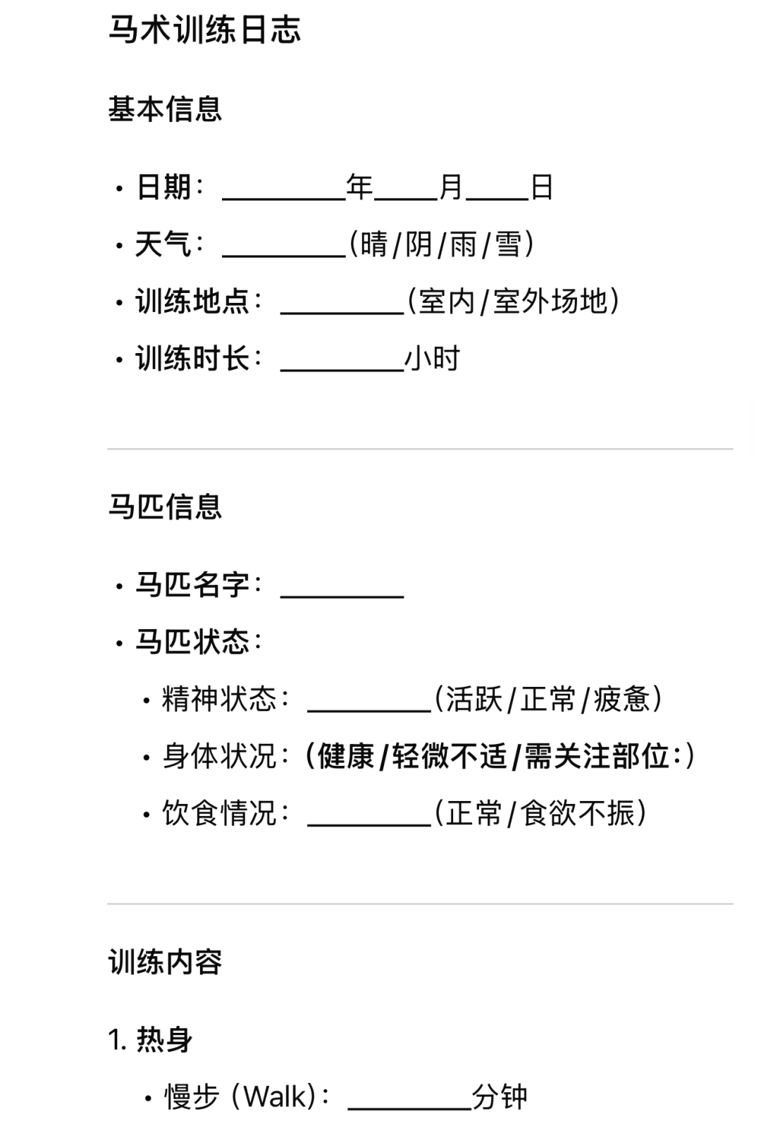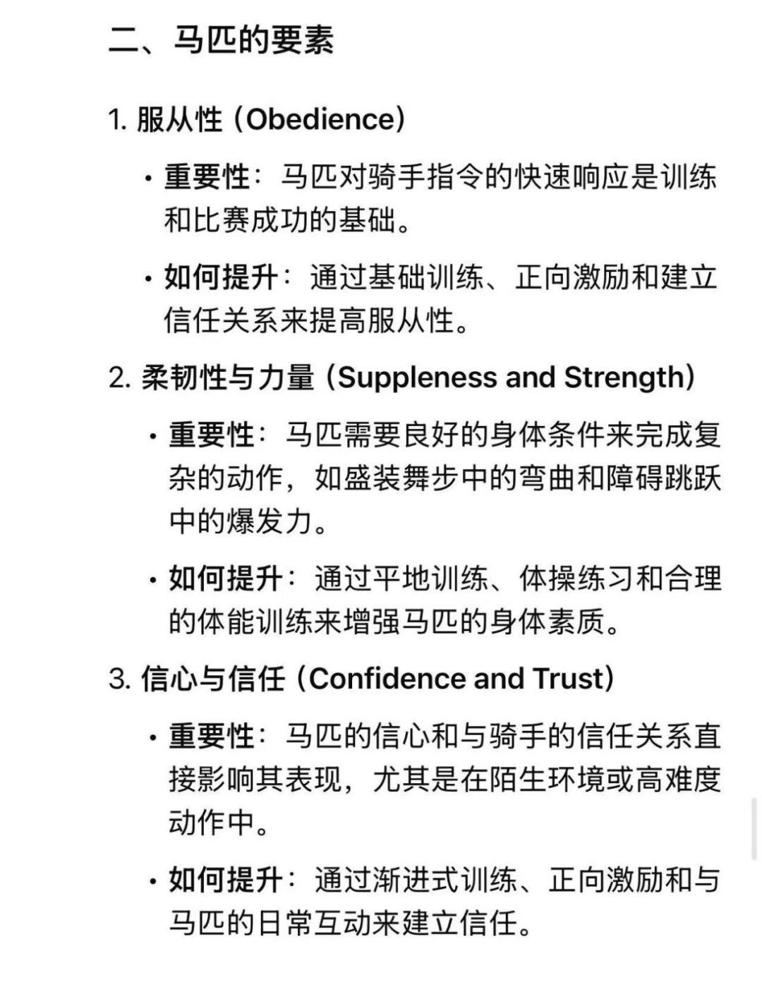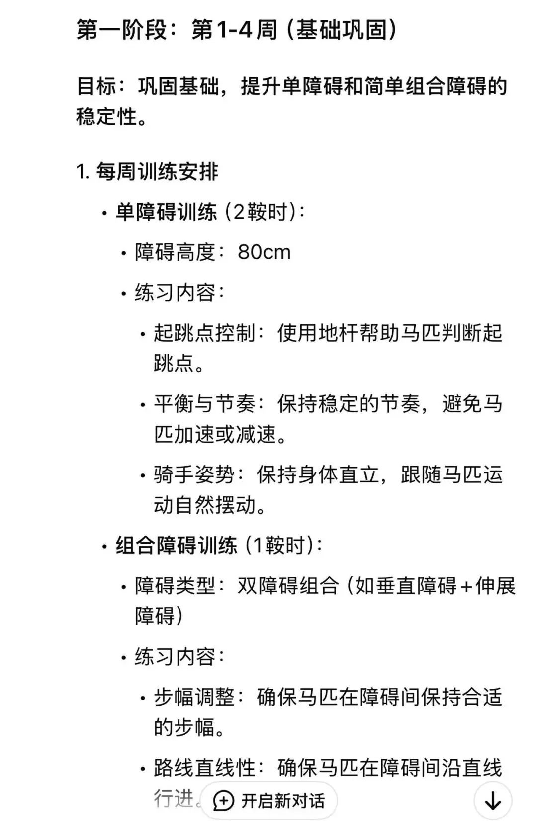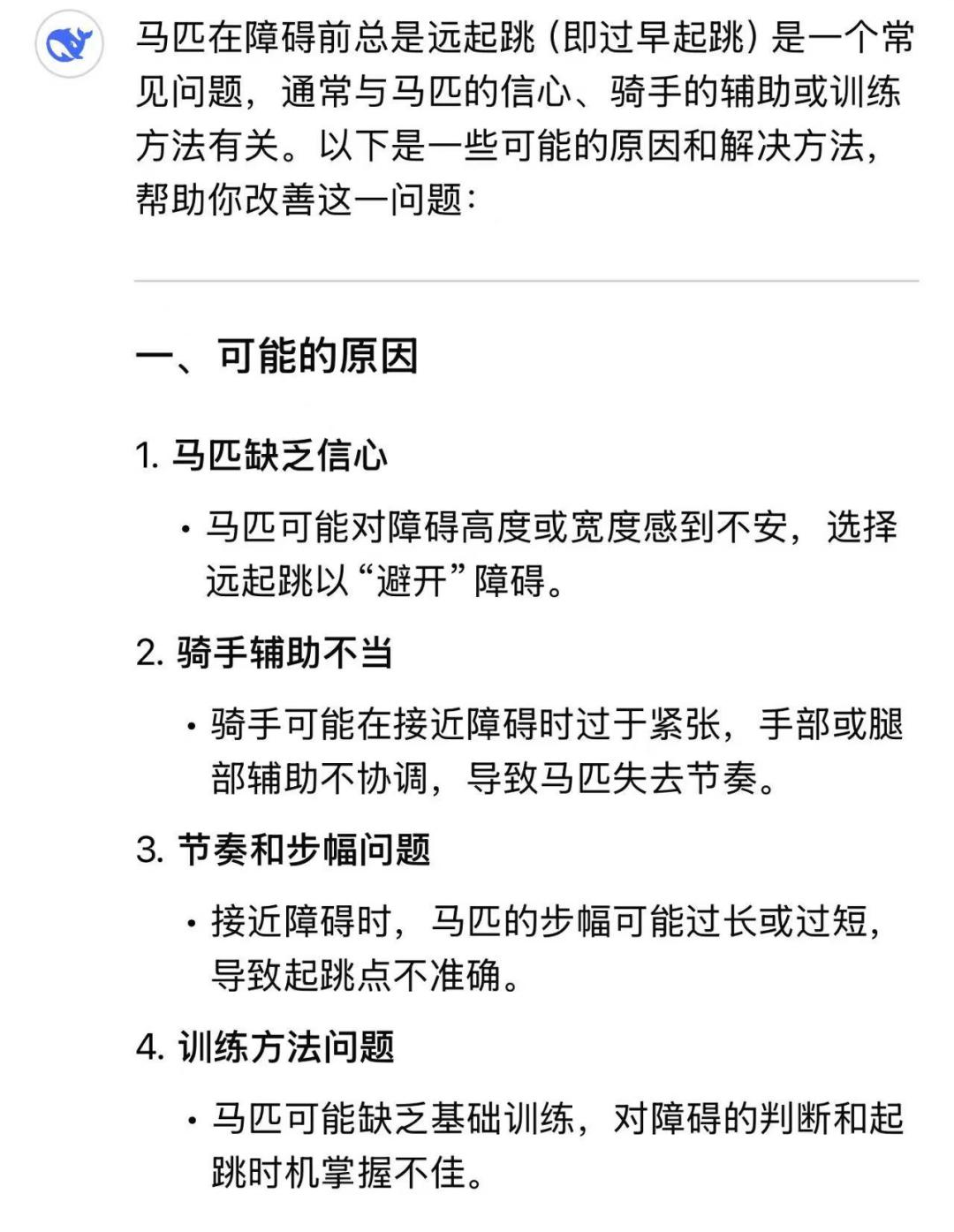 在科技飛速發(fā)展的今天,人工智能技術(shù)正逐步滲透到各個(gè)領(lǐng)域,為我們的學(xué)習(xí)和生活帶來極大便利。 對(duì)于馬術(shù)愛好者而言,如何利用DeepSeek這樣先進(jìn)的人工智能工具,更高效地學(xué)習(xí)馬術(shù),成為了一個(gè)值得探討的話題。 在學(xué)習(xí)馬術(shù)的過程中,DeepSeek可以為我們提供哪些幫助呢?以下有幾個(gè)方向可供大家參考。 1 獲取馬術(shù)基礎(chǔ)知識(shí)、進(jìn)行問題解答 理論是學(xué)習(xí)的基石,而DeepSeek是一座巨大的知識(shí)寶庫(kù),涵蓋了馬術(shù)領(lǐng)域方方面面的內(nèi)容,幫我們?cè)敿?xì)解答困惑。 相比于使用傳統(tǒng)搜索引擎查找資料,DeepSeek能夠讓我們更快速、全面的獲取信息,為之后的提升打下堅(jiān)實(shí)的基礎(chǔ)。 例如: 1. 馬在障礙前總是遠(yuǎn)起怎么辦? 2. 馬術(shù)中最重要的要素是什么? 2 制定學(xué)習(xí)計(jì)劃 只需要向 DeepSeek 提供一些關(guān)鍵信息,例如目前的水平(多少鞍時(shí)的騎乘經(jīng)驗(yàn))、每周能夠投入到馬術(shù)學(xué)習(xí)中的具體時(shí)長(zhǎng)。 DeepSeek 就會(huì)綜合這些信息,規(guī)劃適合不同人群的專屬學(xué)習(xí)計(jì)劃。 3 生成訓(xùn)練日志模板 在馬術(shù)的學(xué)習(xí)過程中,一份清晰規(guī)范的訓(xùn)練日志能幫助我們更好地總結(jié)經(jīng)驗(yàn)、發(fā)現(xiàn)問題,DeepSeek 可以協(xié)助生成一份實(shí)用的訓(xùn)練日志模板。 模板內(nèi)容可以包括基本信息、馬匹信息、訓(xùn)練內(nèi)容、訓(xùn)練表現(xiàn),以及遇到的問題和改進(jìn)措施。 4 其他方向 體能訓(xùn)練建議 設(shè)計(jì)適合騎手的核心力量、柔韌性和耐力訓(xùn)練計(jì)劃。 心理調(diào)整 當(dāng)在訓(xùn)練時(shí)或比賽中感覺緊張的時(shí)候,DeepSeek可以告訴我們?nèi)绾伪3掷潇o和專注。 資源推薦 DeepSeek可以為我們推薦馬術(shù)相關(guān)的書籍、視頻以及國(guó)內(nèi)外賽事信息與參賽建議。 ———————————————————— 提問小技巧 如果你覺得在使用DeepSeek的時(shí)候,總是得不到令自己滿意的回答,感覺用起來有一些力不從心的話,這時(shí)候就需要學(xué)習(xí)一些提問的技巧啦。 ———————————————————— 綜上所述,DeepSeek 可以成為馬術(shù)愛好者的“24小時(shí)馬術(shù)顧問”,幫助我們?cè)诶碚搶W(xué)習(xí)、問題解決和訓(xùn)練規(guī)劃中事半功倍。 需要注意的是,盡管 DeepSeek 能在馬術(shù)學(xué)習(xí)中發(fā)揮重要作用,但它無法完全替代專業(yè)教練的現(xiàn)場(chǎng)指導(dǎo)和自己的親身實(shí)踐。 在學(xué)習(xí)馬術(shù)的過程中,一方面,我們應(yīng)充分利用 DeepSeek 高效便捷的特性,快速積累知識(shí)、優(yōu)化訓(xùn)練方法;另一方面,更重要的還是借助專業(yè)教練的悉心指導(dǎo)和親身實(shí)踐的反復(fù)磨礪,真正掌握馬術(shù)的精髓,盡情領(lǐng)略這項(xiàng)運(yùn)動(dòng)所蘊(yùn)含的獨(dú)特魅力與無限樂趣。 ———————————————————— 文/王夢(mèng)媛 DeepSeek 給你的馬術(shù)學(xué)習(xí)提供過什么幫助呢?請(qǐng)?jiān)谙路皆u(píng)論區(qū)分享給大家吧。 |