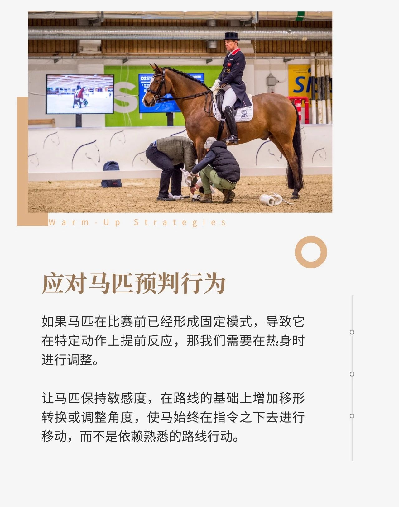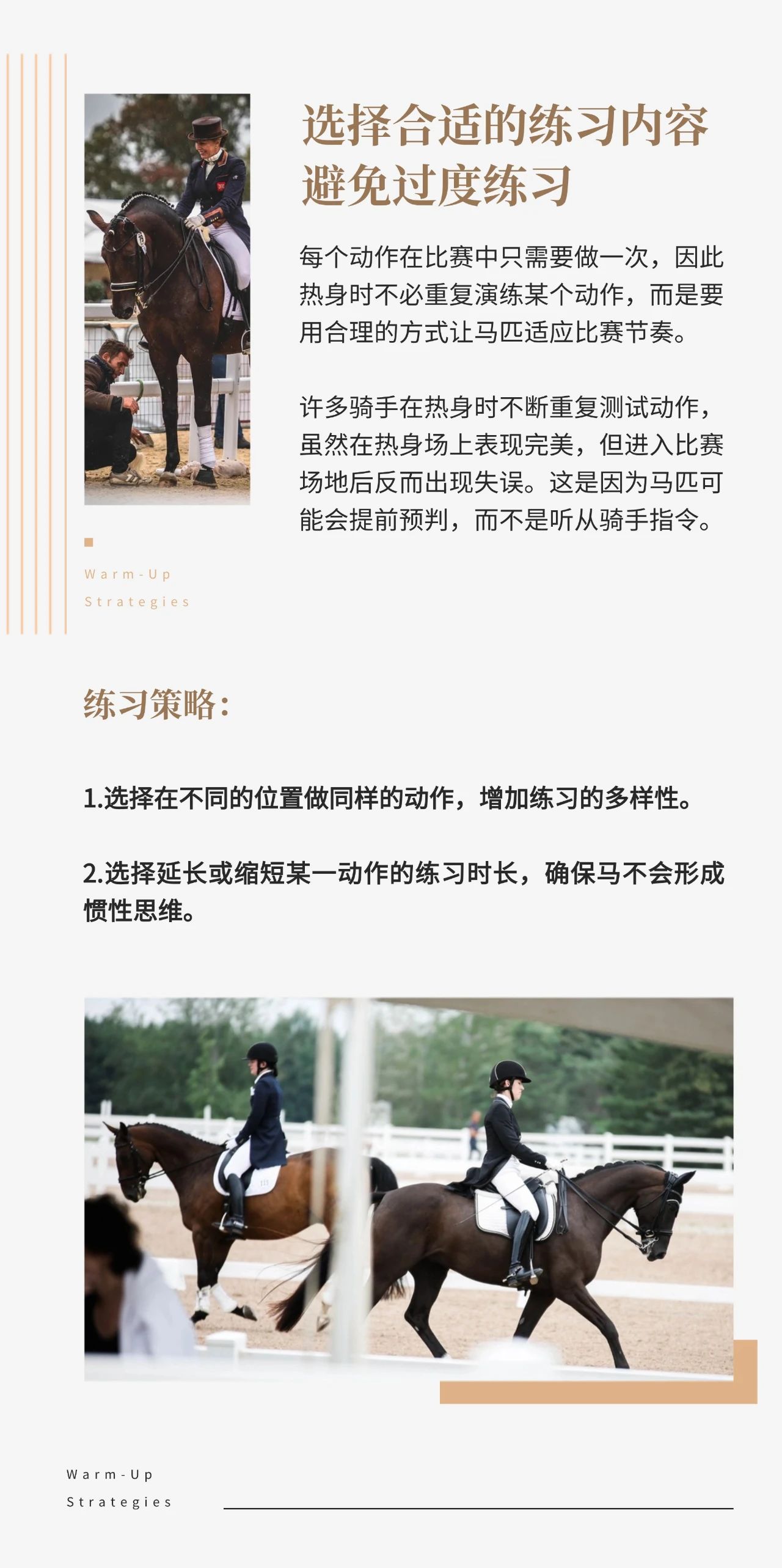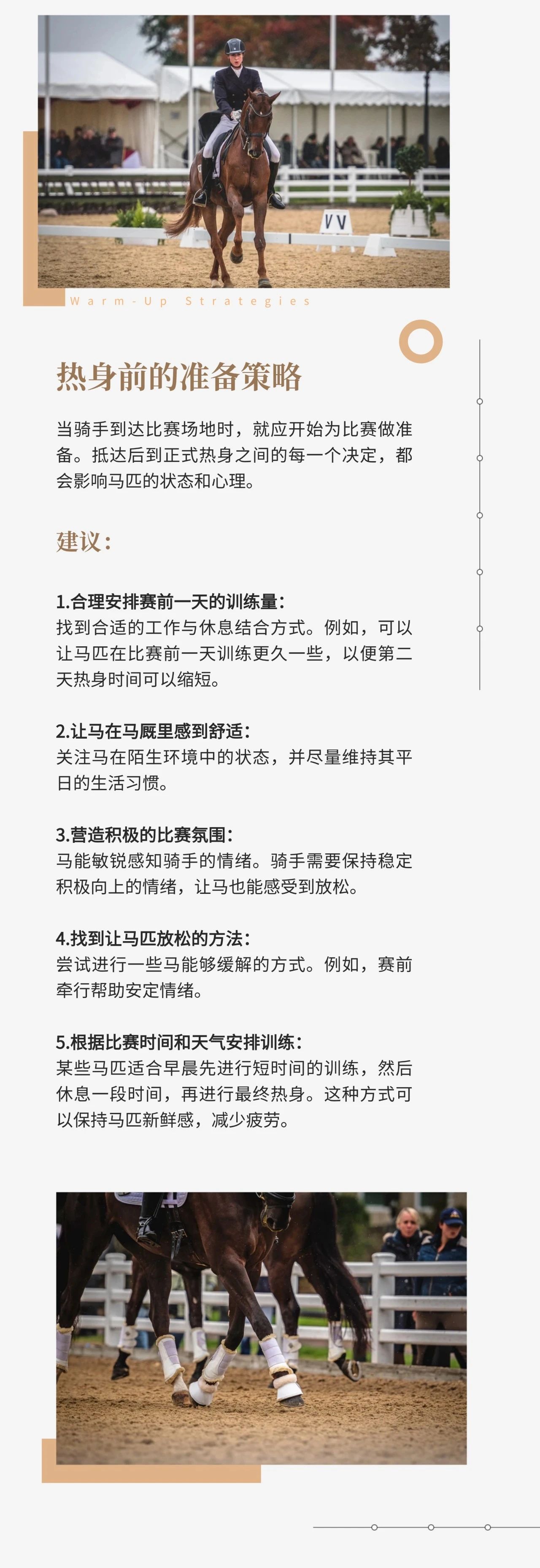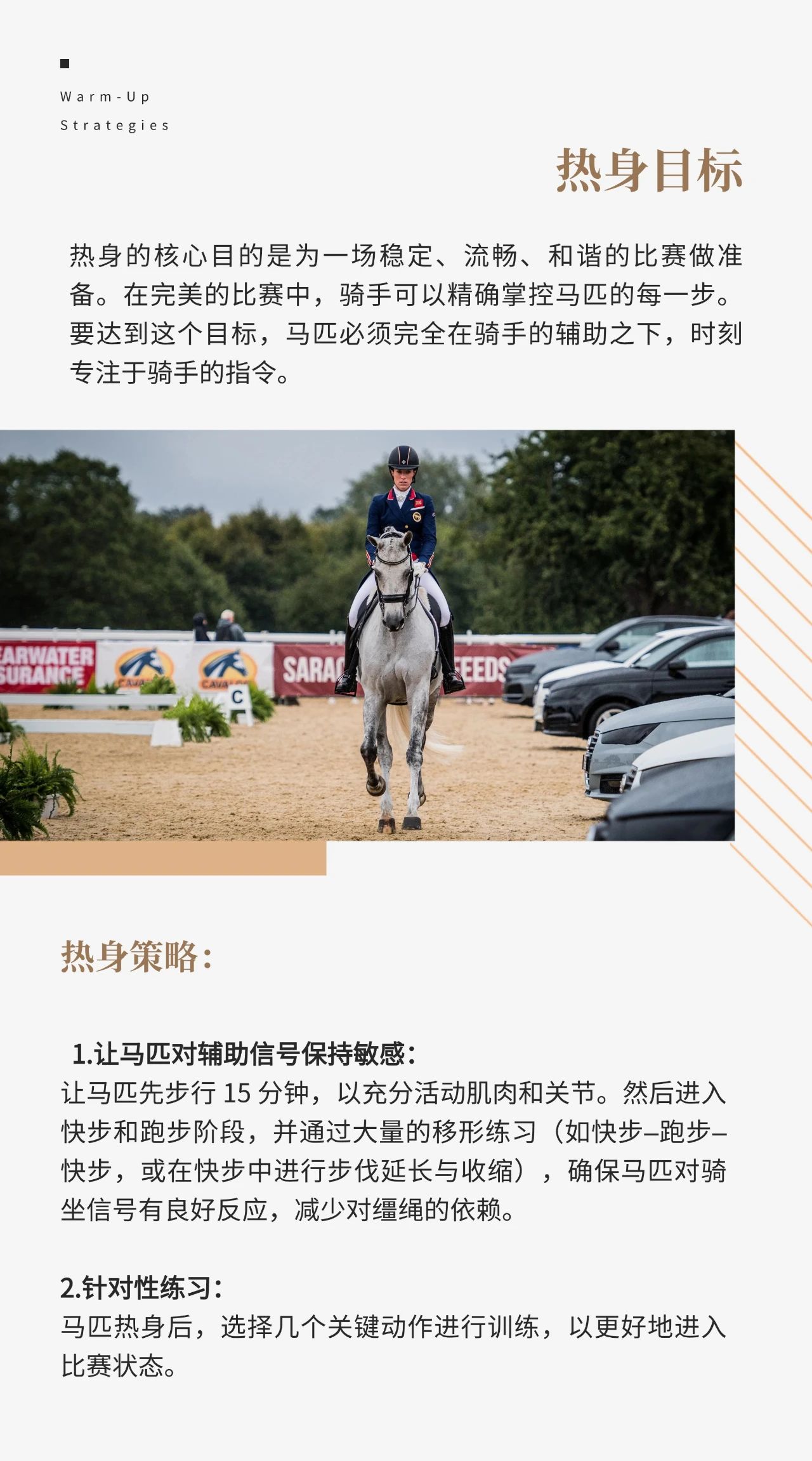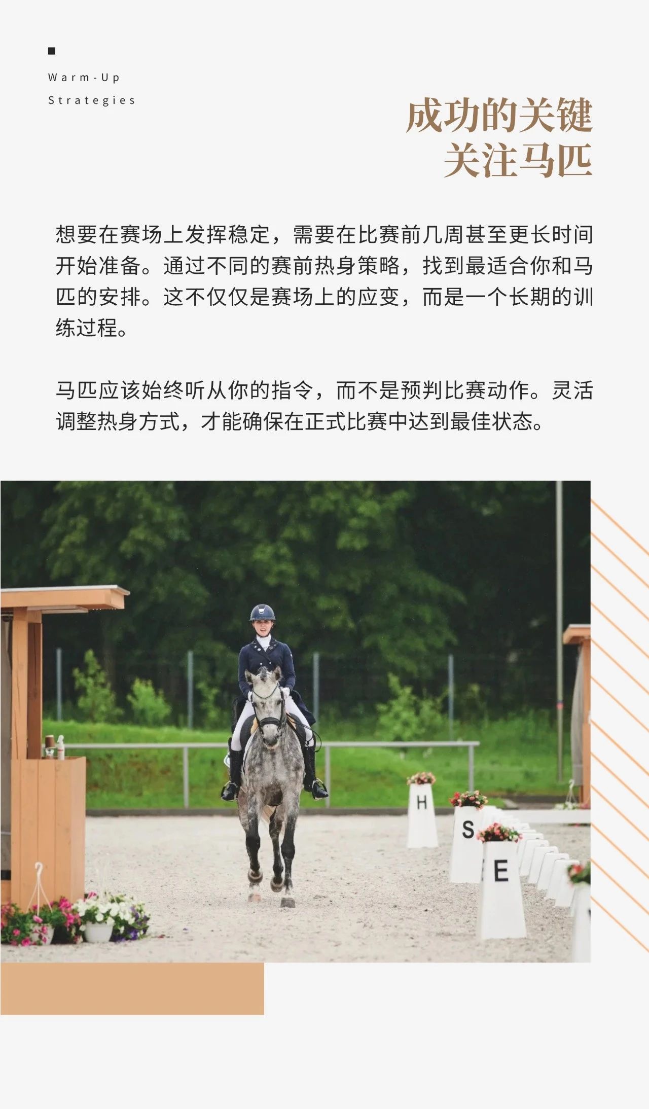 長時間的訓(xùn)練,可能是數(shù)天、數(shù)月,甚至數(shù)年的努力,最終都是為了在賽場上展現(xiàn)最佳表現(xiàn)。但當(dāng)你抵達比賽現(xiàn)場后,該如何規(guī)劃接下來的時間?從進入賽場的那一刻起,到正式比賽前的每一小時,都可以利用得更高效,為成功鋪路。美國盛裝舞步騎手騎手兼教練恩德爾·奧茨(Endel Ots)分享如何在抵達比賽場地后,通過合理的熱身策略,為比賽做好準(zhǔn)備。 |