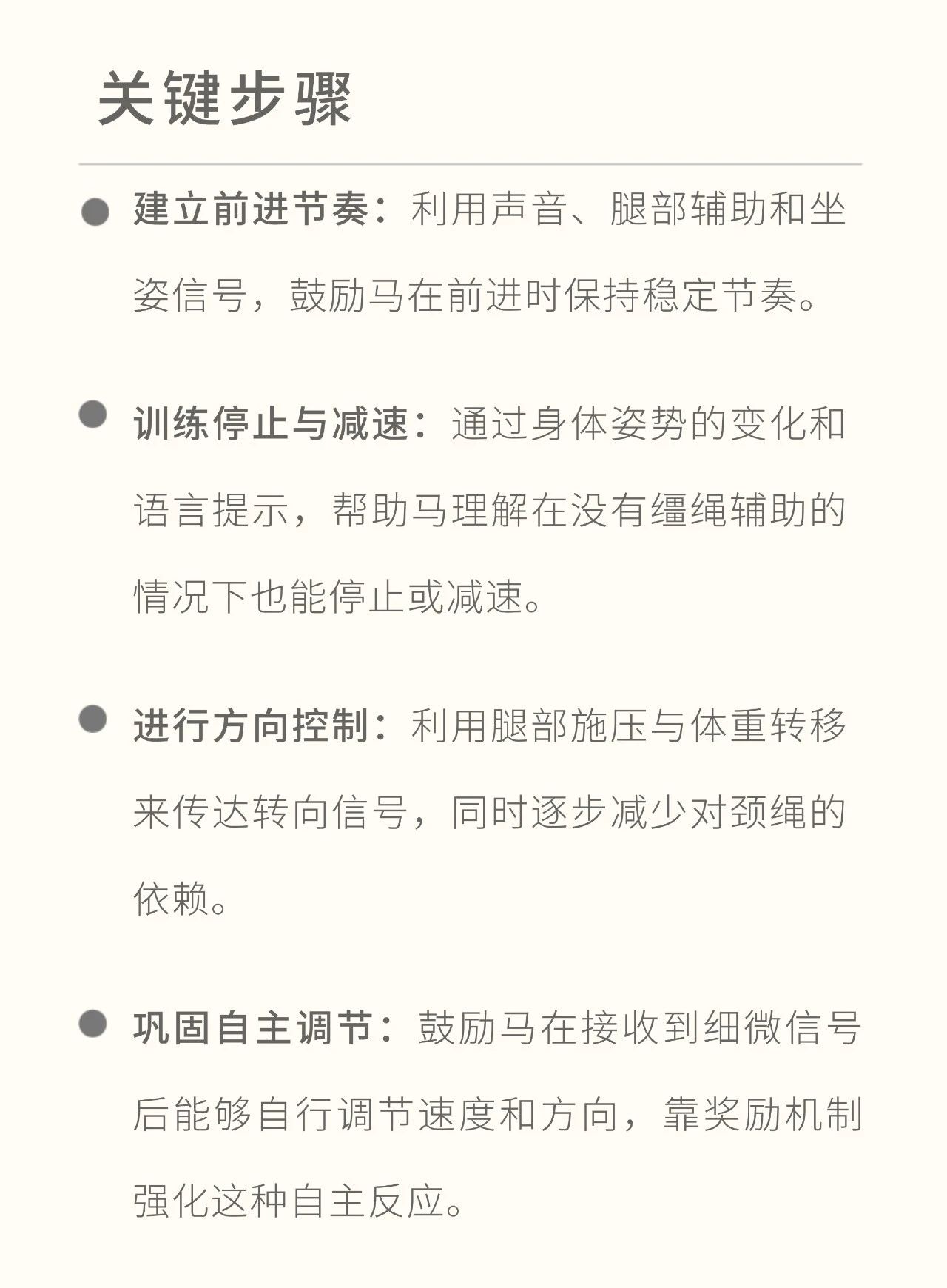 在近幾年的馬術(shù)賽場(chǎng)上,一項(xiàng)革命性進(jìn)步悄然興起:無(wú)韁騎乘。無(wú)韁騎乘在2023年底正式納入比賽規(guī)則,在2024年,三位女騎手在法國(guó)俱樂(lè)部場(chǎng)地障礙錦標(biāo)賽中首次以無(wú)韁騎乘參賽,為這種更貼近馬匹自然狀態(tài)的騎乘方式鋪下了道路。 而這一切在2025年2月6日迎來(lái)了歷史性時(shí)刻:瑪麗昂·佩里西諾托(Marion Perrissinoto)與搭檔“Vanille”在波爾多國(guó)際馬術(shù)場(chǎng)地障礙賽場(chǎng)上,成為該項(xiàng)賽事唯一一對(duì)無(wú)韁騎乘的組合。 賽場(chǎng)新挑戰(zhàn) 對(duì)于瑪麗昂來(lái)說(shuō),這不僅僅是一場(chǎng)比賽,更是一場(chǎng)心理和技術(shù)上的雙重考驗(yàn)。多年來(lái),她習(xí)慣在訓(xùn)練和小型比賽中使用頸繩(cordelette)來(lái)協(xié)助騎乘。然而,站在世界級(jí)賽場(chǎng)上,面對(duì)強(qiáng)烈的視覺(jué)與聽覺(jué)刺激、緊張的熱身環(huán)境以及不斷變換的現(xiàn)場(chǎng)氛圍,她依然感受到了巨大的壓力。 按照規(guī)定,“Vanille”在熱身區(qū)必須佩戴無(wú)銜控制頭具(side pull)。當(dāng)正式入場(chǎng)的那一刻到來(lái)時(shí),她摘掉了所有頭部控制裝置踏上賽場(chǎng),以極高的水準(zhǔn)完成了所有賽段?,旣惏骸づ謇镂髦Z托用行動(dòng)證明了“馬術(shù)可以不一樣”。 無(wú)韁騎乘的核心理念 事實(shí)上,許多國(guó)際知名騎手也早已將頸繩納入訓(xùn)練工具中。例如,德國(guó)騎手英格麗德·克利姆克(Ingrid Klimke)就經(jīng)常使用頸繩進(jìn)行日常騎乘,而法國(guó)馴馬師阿莉澤·弗羅芒(Alizé Froment)更是以在無(wú)韁狀態(tài)下演繹盛裝舞步和馬術(shù)表演而聞名。 德國(guó)騎手英格麗德·克利姆克(Ingrid Klimke) 無(wú)韁騎乘并非是一種“炫技”的手段。這種騎乘方式不僅可以改善騎手的坐姿和身體控制,還顯著提升了馬匹的平衡、前軀輕盈度以及整體姿態(tài)。是建立在多年的基礎(chǔ)訓(xùn)練和對(duì)馬匹深厚信任之上的一種騎乘方式。 無(wú)韁騎乘的核心目標(biāo),是訓(xùn)練馬匹能夠明確聽從騎手坐姿和腿部指令,并且始終保持自我平衡、自主調(diào)節(jié)步伐。換句話說(shuō),當(dāng)一匹馬在沒(méi)有韁繩輔助下能做出準(zhǔn)確反應(yīng)時(shí),這既證明了馬已經(jīng)內(nèi)化了基本動(dòng)作要領(lǐng),也表明了騎手能夠通過(guò)細(xì)膩的身體語(yǔ)言與之溝通。 訓(xùn)練的關(guān)鍵階段 無(wú)韁騎乘訓(xùn)練的第一步是要擁有一匹在傳統(tǒng)韁繩輔助下已表現(xiàn)穩(wěn)定的馬。馬需要在接收到腿部信號(hào)時(shí),能夠維持均衡的節(jié)奏和步態(tài)。不論是前進(jìn)、停止、還是轉(zhuǎn)向,馬都能做出迅速而準(zhǔn)確的反應(yīng)。訓(xùn)練初期常會(huì)借助頸繩來(lái)輔助控制方向,促使馬和騎手建立直接而純粹的溝通渠道。 在訓(xùn)練過(guò)程中, 騎手可以通過(guò)幾個(gè)步驟來(lái)實(shí)現(xiàn)無(wú)韁騎乘: 聆聽馬的反饋 正是這種扎實(shí)的基礎(chǔ)訓(xùn)練,才使得瑪麗昂在國(guó)際賽場(chǎng)上能夠大膽拋開傳統(tǒng)裝備,以完全的信任和默契與“Vanille”并肩作戰(zhàn)。她們的成功不是偶然,而是多年磨礪中對(duì)坐姿、腿部信號(hào)精準(zhǔn)把握與馬匹內(nèi)在理解力的完美呈現(xiàn)。無(wú)銜騎乘不再僅僅是一種“把韁繩松開”的技巧,而是突破傳統(tǒng)控制方式的橋梁。 馬術(shù)不止于依賴韁繩,而在于騎手與馬匹的信任、溝通和默契。正如瑪麗昂的故事所展示的那樣,當(dāng)放下那些可能束縛雙方的輔助工具,傾聽和感受馬的反饋時(shí),也許可以創(chuàng)造出一種全新的、自由的騎乘體驗(yàn)。 不論你是為了提升馬匹的動(dòng)作質(zhì)量、改善自身的平衡感,還是只是想給日常訓(xùn)練帶點(diǎn)新意,無(wú)韁騎乘訓(xùn)練都是一個(gè)值得一試的選擇。它讓騎手在沒(méi)有韁繩依賴的情況下重新建立與馬的信任,用身體與意識(shí)去溝通。騎手會(huì)更加清楚自己的動(dòng)作細(xì)節(jié),也會(huì)更深刻地體會(huì)馬匹的情緒與意圖。 更重要的是,這并非只屬于高級(jí)騎手的“特權(quán)”。任何水平的騎手只要愿意練習(xí)、尊重馬的節(jié)奏,都可以從中收獲輕盈、信任與自由。 |