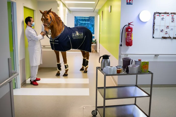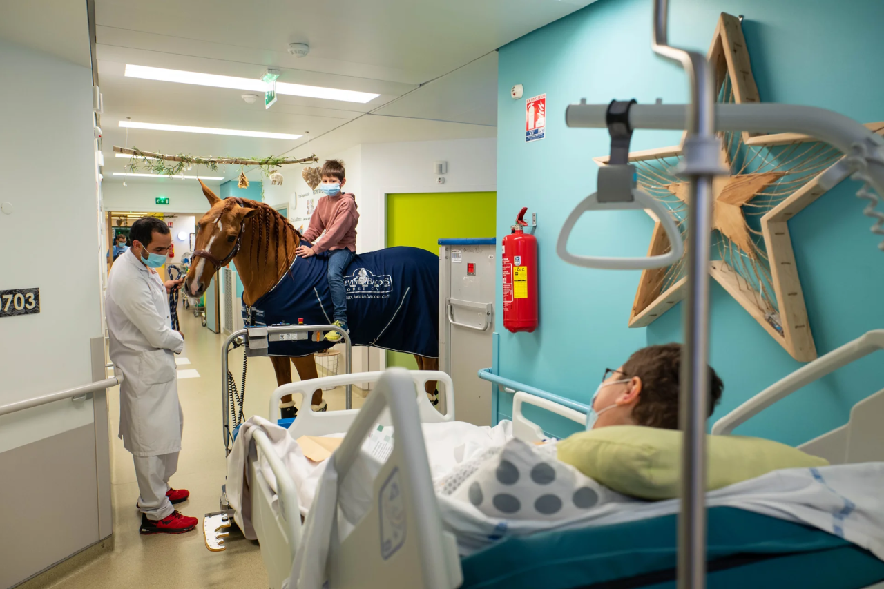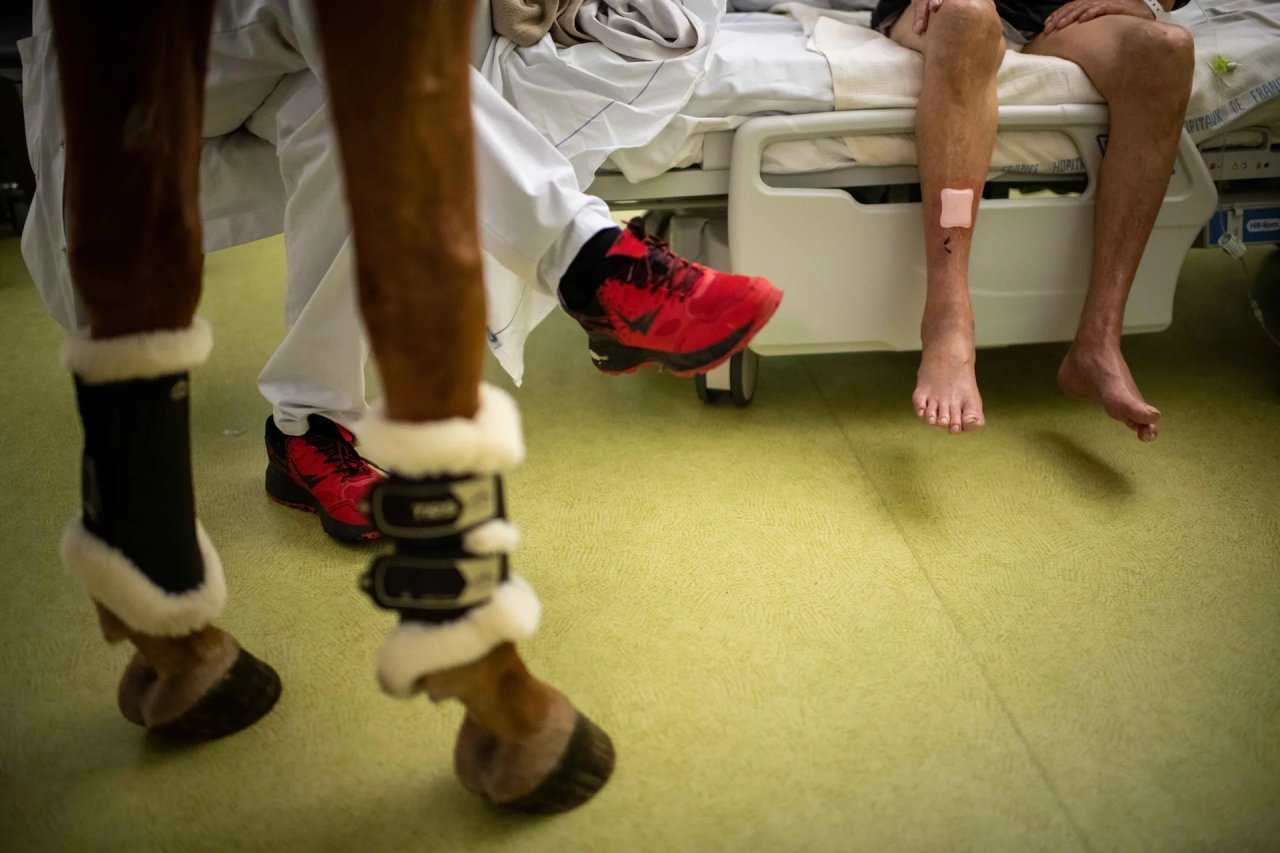 深夜的加萊港海霧漫卷,病房的白熾燈總會(huì)在某個(gè)時(shí)刻突然刺眼?;煴靡?guī)律的滴答聲里,瑪麗昂(Marion)的手指已經(jīng)握不住兒子柔軟的發(fā)梢。止痛藥的效力退去時(shí),她聽(tīng)見(jiàn)馬蹄踏過(guò)水泥地的回聲——那是一匹栗色的馬,睫毛垂落,鼻息溫?zé)崛绱翰璩醴小?/span> 人們說(shuō)它是動(dòng)詞“陪伴”的另一種寫(xiě)法,說(shuō)它是法國(guó)北部城市加萊的“動(dòng)物天使”,它就是一匹在馬術(shù)表演領(lǐng)域曾贏得無(wú)數(shù)掌聲的馬,它的名字叫“Peyo”。 墜落人間的“動(dòng)物天使” 今年19歲的“Peyo”,擔(dān)任“醫(yī)生”一職已經(jīng)9年了。在這9年里,它的身影頻繁出現(xiàn)在加萊的養(yǎng)老院、醫(yī)院的姑息治療病房、兒童病房和精神病房,與眾多病人相遇,又無(wú)奈地與許多病人道別。而“Peyo”能成為一名“醫(yī)生”,離不開(kāi)它的主人哈森?布沙庫(kù)爾(Hassen Bouchakour)。 11年前的“Peyo”尚在云端。在彩燈裝飾的馬術(shù)表演場(chǎng)里,它的四蹄翻涌著銀色的海。旋轉(zhuǎn)、高級(jí)快步、后退、兩步一換,“Peyo”和哈森留下了無(wú)數(shù)精彩瞬間。哈森說(shuō):“‘Peyo’的鬃毛散落著金箔,落幕時(shí)總有小孩想掙脫媽媽的手來(lái)摸摸可愛(ài)的它?!?/span> 哈森?布沙庫(kù)爾和“Peyo”原本是馬術(shù)表演圈里的明星 然而,一次偶然的機(jī)會(huì),哈森發(fā)現(xiàn)訓(xùn)練有素的“Peyo”總會(huì)做出一些令人匪夷所思的舉動(dòng)。比如在演出或散步時(shí),它會(huì)徑直走向同一個(gè)人;在觀眾席上,它會(huì)輕輕扯開(kāi)一個(gè)孩子的假發(fā)……直到某個(gè)雨夜,“Peyo”固執(zhí)地走向觀眾席第三排,頭發(fā)稀疏的老婦人手腕上,滯留針管滲出血珠。哈森突然明白:他的“Peyo”是如此與眾不同,它的眼睛里沉睡著某種巫術(shù)。它能嗅到皮膚下洶涌的黑暗,能聽(tīng)見(jiàn)癌細(xì)胞分裂時(shí)的私語(yǔ)。 這些被“Peyo”關(guān)注的人,幾乎都是身體脆弱的病患。經(jīng)過(guò)長(zhǎng)時(shí)間的觀察和確認(rèn),哈森雖然花了很長(zhǎng)時(shí)間才接受這個(gè)事實(shí),但深思熟慮之后,他毅然放棄了馬術(shù)表演事業(yè),選擇成為“Peyo”的伙伴,與它一起去幫助更多的人。 三千次臨終的月光 為了讓“Peyo”能夠安全、有效地幫助病人,哈森與“心之蹄”協(xié)會(huì)(Les Sabots duC?ur)合作,和神經(jīng)病學(xué)家、精神病學(xué)家、動(dòng)物行為學(xué)家等眾多科學(xué)家共同制定了嚴(yán)格的衛(wèi)生規(guī)程。從此,“Peyo”正式踏入了兒科、精神病學(xué)、老年病、阿爾茨海默癥和姑息治療等多個(gè)領(lǐng)域,成為了醫(yī)院里的特殊“醫(yī)生”。 盡管“Peyo”成為“醫(yī)生”的過(guò)程看似順其自然,但真正實(shí)踐起來(lái),無(wú)論是對(duì)“Peyo”還是哈森來(lái)說(shuō),都充滿了挑戰(zhàn)。每次前往醫(yī)院之前和之后,哈森都要花費(fèi)兩個(gè)小時(shí)對(duì)“Peyo”進(jìn)行全面的清洗和消毒。值得慶幸的是,“Peyo”非常乖巧懂事,它不僅享受這個(gè)過(guò)程,還十分樂(lè)于配合。 “Peyo”在去醫(yī)院前后都要進(jìn)行清洗和消毒 而當(dāng)?shù)竭_(dá)醫(yī)院之后,哈森就會(huì)真正放手,將一切決定權(quán)都交給“Peyo”。沒(méi)錯(cuò),是“Peyo”自己去選擇進(jìn)入哪個(gè)房間,與哪一位患者相遇。哈森只需靜靜地陪伴在它身邊,讓它自由地做自己想做的事情。神奇的是,“Peyo”挑選的,永遠(yuǎn)是病情最重、最需要安慰的那些患者。原來(lái),它認(rèn)得所有疼痛的形狀。 它曾與24歲患有轉(zhuǎn)移性惡性腫瘤的瑪麗昂相遇。那時(shí)的瑪麗昂骨瘦如柴,卻依然拼盡全力擁抱著自己7歲的兒子。“Peyo”輕輕地低下頭,用鼻子溫柔地?fù)崦旣惏?,表達(dá)著自己的愛(ài)意。當(dāng)醫(yī)生為瑪麗昂治療,減輕她的疼痛時(shí),“Peyo”就安靜地站在一旁,仿佛在為她加油打氣。 24歲的瑪麗昂身患癌癥,懷抱著7歲的兒子,接受著“Peyo”治療 9歲的艾薩克(Isaac)和“Peyo”是好朋友,他們的關(guān)系好到艾薩克可以騎在“Peyo”身上去看望剛做完手術(shù)的母親。在“Peyo”的陪伴下,艾薩克不再對(duì)醫(yī)院感到恐懼,反而感受到了前所未有的溫暖。 9歲的艾薩克騎著“Peyo”向剛走出手術(shù)室的媽媽介紹他的新朋友 64歲的羅杰(Roger)與“Peyo”心有靈犀。有一天,羅杰剛到姑息治療病房輸血,就驚喜地看到了“Peyo”。他開(kāi)心得像個(gè)孩子,迫不及待地跟妻子炫耀:“我看見(jiàn)我最愛(ài)的醫(yī)生了,真開(kāi)心,今晚我肯定能做個(gè)好夢(mèng)。不僅如此,“Peyo”還一直陪著老朋友羅杰坐上救護(hù)車,目送他回家,并滿心期待著下一次相聚。 “Peyo”陪著羅杰坐上回家的救護(hù)車 然而,并不是每一位朋友都能有再次見(jiàn)面的機(jī)會(huì)。67歲的丹尼爾(Daniel)曾經(jīng)也是一位馬術(shù)愛(ài)好者。他與“Peyo”第一次見(jiàn)面就有一種相見(jiàn)恨晚的感覺(jué),此后每次談起“Peyo”,他的眼睛里都會(huì)閃爍著光芒,開(kāi)心得仿佛要哭出來(lái)。一人一馬相互陪伴,走過(guò)了生命的最后一程。2021年1月,丹尼爾去世,他的家人特意邀請(qǐng)“Peyo”和哈森一起參加了葬禮。小鎮(zhèn)里陰雨綿綿,“Peyo”的眼神中滿是悲傷,它仿