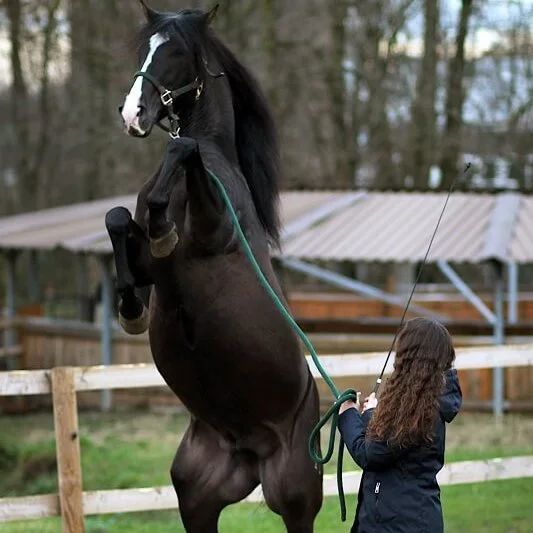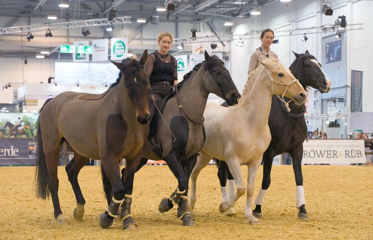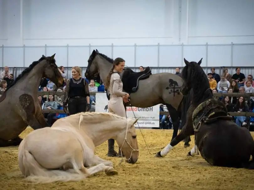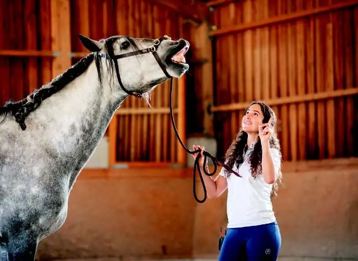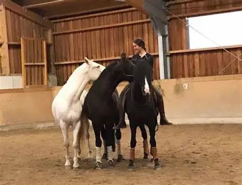 在2025年3月的德國(guó)埃森世界馬術(shù)博覽會(huì)上,《馬術(shù)》雜志記者目睹了肯齊·迪斯利(Kenzie Dysli)展示她那獨(dú)特的自由馬術(shù)技藝。她與多匹駿馬共同舞動(dòng),每一次輕盈的步伐和靈動(dòng)的指令,都是心靈與馬匹之間深刻對(duì)話(huà)的演繹。 本文是她在調(diào)馴馬匹方面的見(jiàn)解與理念,揭示了人應(yīng)如何通過(guò)無(wú)形的默契與堅(jiān)實(shí)的信任,建立起與馬匹之間的完美連接。 1. 自由訓(xùn)練的基礎(chǔ) 要與兩匹馬一起訓(xùn)練,它們當(dāng)然都應(yīng)該已經(jīng)各自學(xué)會(huì)了自由訓(xùn)練的各種基本要素。每匹馬都有自己的天賦,并非每個(gè)練習(xí)都適合所有馬。但“引導(dǎo)練習(xí)”的基礎(chǔ)和反射點(diǎn)應(yīng)該已經(jīng)能夠在自由狀態(tài)下很好地執(zhí)行。 如果你的馬總是想著走自己的路,那它肯定還沒(méi)有準(zhǔn)備好與第二匹馬一起訓(xùn)練。因?yàn)榕c兩匹馬訓(xùn)練意味著你必須分配你的注意力——你不能像單獨(dú)訓(xùn)練時(shí)那樣完全專(zhuān)注于每匹馬。 ? Kenzie Dysli 如果你的馬會(huì)在你疏忽的時(shí)候趁機(jī)偷懶,那你就需要加強(qiáng)你們之間的聯(lián)系,以此讓它跟隨在你身邊。和其他訓(xùn)練一樣,基礎(chǔ)打得越扎實(shí),后續(xù)訓(xùn)練就會(huì)越容易。 因此,確保你的馬能夠自己保持在一個(gè)“使其舒適的位置”,特別是當(dāng)馬處在右側(cè)引導(dǎo)位置的時(shí)候,它的頭應(yīng)始終保持在肩部的高度,自然放松。為了檢查馬的這一狀態(tài),你最好不斷地變化步伐。因?yàn)轳R必須與你一起思考并適應(yīng)你的速度。 最好在有干擾的情況下進(jìn)行這項(xiàng)訓(xùn)練。因?yàn)榈诙ヱR也會(huì)成為一個(gè)干擾因素。如果你想第一次訓(xùn)練時(shí)盡可能簡(jiǎn)單,建議不要讓兩匹馬都精神飽滿(mǎn)地開(kāi)始訓(xùn)練。 它們應(yīng)該能夠集中注意力并保持動(dòng)力,但做一些預(yù)熱的運(yùn)動(dòng)(例如在牽引機(jī)上、場(chǎng)地內(nèi)或長(zhǎng)韁訓(xùn)練等)有助于讓它們冷靜下來(lái),因?yàn)橛行R對(duì)適應(yīng)一些新規(guī)則會(huì)有困難。 2. 遵守管理規(guī)則 ?Laura Graves 對(duì)馬而言,群體成員之間的等級(jí)關(guān)系必須明確。這是確保和平與和諧的唯一方式。畢竟,大規(guī)模的爭(zhēng)斗會(huì)消耗這類(lèi)動(dòng)物不必要的精力。 但在開(kāi)始時(shí),馬與馬之間偶爾可能還是會(huì)有點(diǎn)爭(zhēng)執(zhí),而我們不希望這種情況出現(xiàn)在我們的訓(xùn)練中。 一方面,我們希望將馬和人受傷風(fēng)險(xiǎn)降到最低,另一方面,我們希望馬能集中精力一起活動(dòng),而不是互相爭(zhēng)吵。因此,確保你作為“主導(dǎo)動(dòng)物”的位置對(duì)你的馬來(lái)說(shuō)是明確的,這一點(diǎn)極為重要。 肯齊·迪斯利(左)與助手在 2025 年 3 月德國(guó)埃森世界馬術(shù)博覽會(huì)上為觀眾展示引領(lǐng)多匹馬的自由馬術(shù) ? 何亦紅 當(dāng)然,如果這兩匹馬已經(jīng)互相認(rèn)識(shí)并且相互喜歡,那就更容易一些。但即使是互不認(rèn)識(shí)的馬,只要讓它們遵守一個(gè)規(guī)則——訓(xùn)練期間不得發(fā)生爭(zhēng)斗,并且所有馬都接受這一規(guī)則,自由調(diào)馴工作也是可以進(jìn)行的。但請(qǐng)勿冒險(xiǎn)! 你的馬能夠感知你的疑慮,并在猶豫時(shí)利用這一點(diǎn)。直到你有了經(jīng)驗(yàn)和整體把握,知道哪些事情最重要時(shí),最好站在安全的一方?!鞍踩谝弧钡脑瓌t永遠(yuǎn)沒(méi)有錯(cuò)! 但如果兩匹馬相處融洽,并且自由調(diào)馴工作已經(jīng)有了基礎(chǔ),那么你就可以開(kāi)始真正的訓(xùn)練了。 3. 兩匹馬,雙倍的快樂(lè)! ? Kenzie Dysli 開(kāi)始自由工作時(shí),最好從馬的左側(cè)開(kāi)始。對(duì)大多數(shù)馬來(lái)說(shuō),這一側(cè)更加直觀,因?yàn)槲覀儙缀跛胁僮鞫际菑倪@一側(cè)進(jìn)行的,而你的馬也已經(jīng)很熟悉這種帶領(lǐng)位置。 現(xiàn)在,只需將第二匹馬放在第一匹馬的右側(cè),這樣兩匹馬仍然保持通常的舒適位置。一如既往,剛開(kāi)始時(shí)要多加表?yè)P(yáng),以便從一開(kāi)始就對(duì)每一個(gè)正確的動(dòng)作產(chǎn)生積極反饋。和單獨(dú)訓(xùn)練一樣,剛開(kāi)始時(shí),你應(yīng)該牽引兩匹馬,便于更好地影響它們。 哪匹馬在內(nèi)側(cè),哪匹馬在外側(cè),取決于它們的性格。外側(cè)的馬在開(kāi)始時(shí)自然承擔(dān)了稍重的任務(wù),因?yàn)槟愕倪B接變得更寬了。因此,確保沒(méi)有馬開(kāi)始打架。 ? Kenzie Dysli 剛開(kāi)始時(shí),先練習(xí)一只手,建立安全的“停止”和“來(lái)”指令,以確保在任何情況下都能有一個(gè)“停機(jī)”按鈕。之后,你也可以換手進(jìn)行訓(xùn)練。記住,剛開(kāi)始時(shí)的目標(biāo)不是速度,而是確保每個(gè)動(dòng)作的執(zhí)行都干凈利落。 步伐和隨之而來(lái)的更大動(dòng)力是隨著時(shí)間而逐漸發(fā)展的。你還可以讓兩匹馬彼此跟隨,而不是并排行走。但要注意,它們必須已經(jīng)在單獨(dú)訓(xùn)練中與你的位置保持一致,并在你靜止時(shí)能繞你走圈。 三匹馬一起做一些聯(lián)合的馬術(shù)技巧(如西班牙步同步進(jìn)行)也能非常有趣!實(shí)際上,你的想象