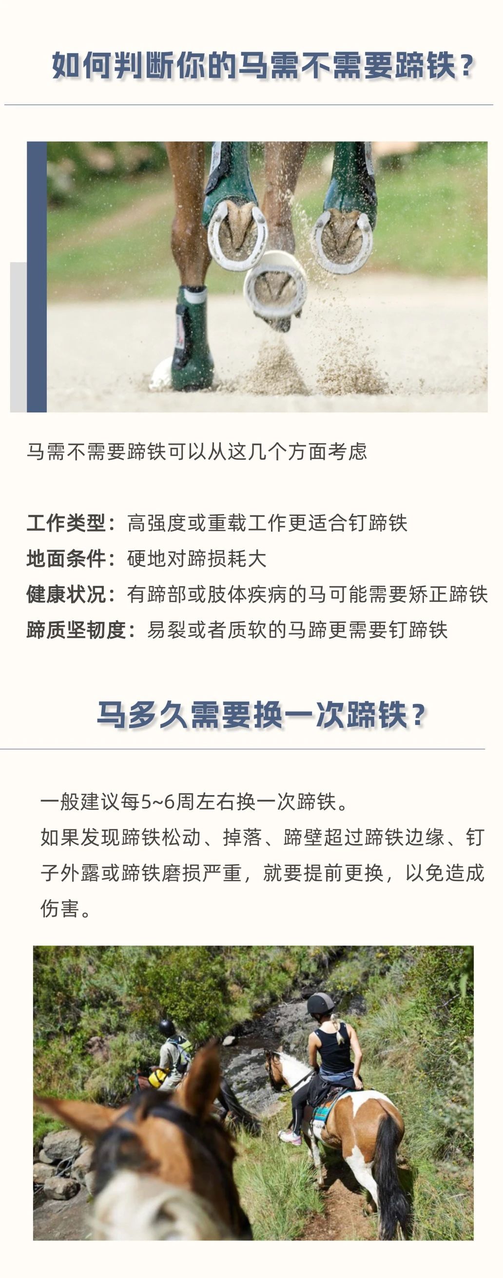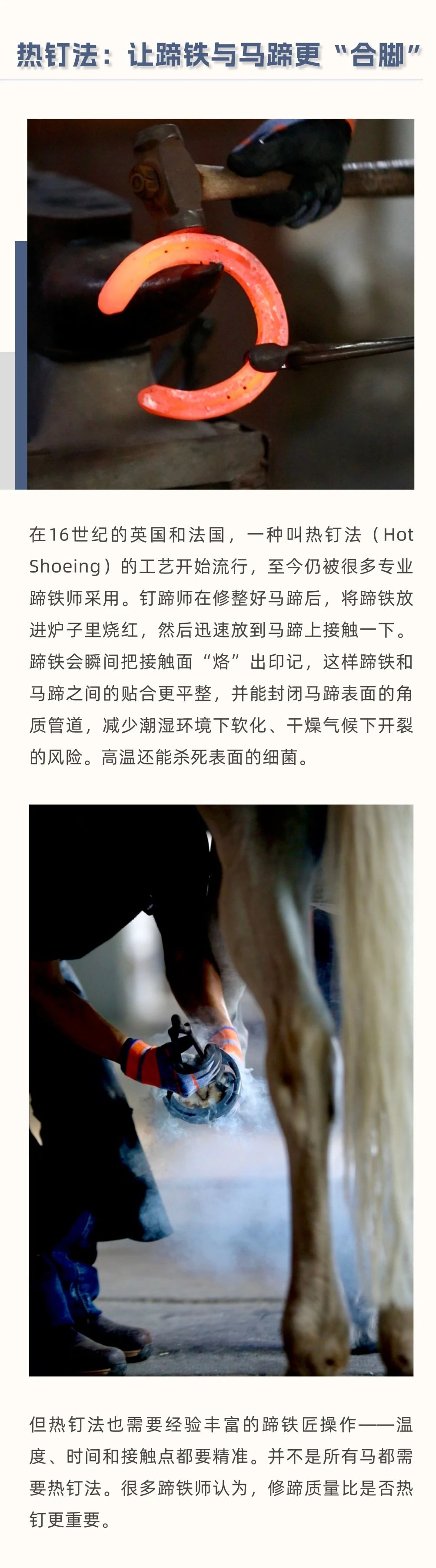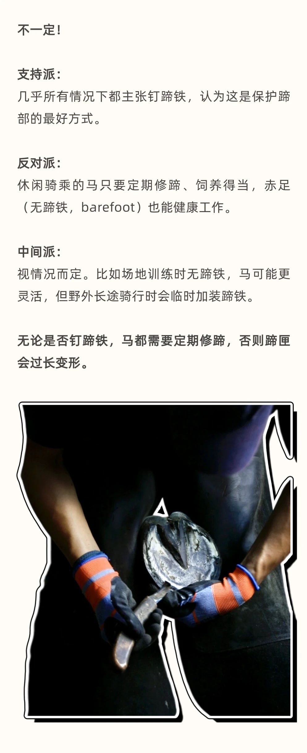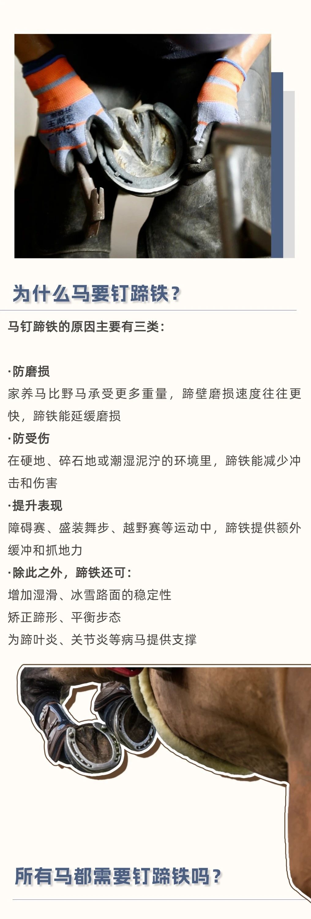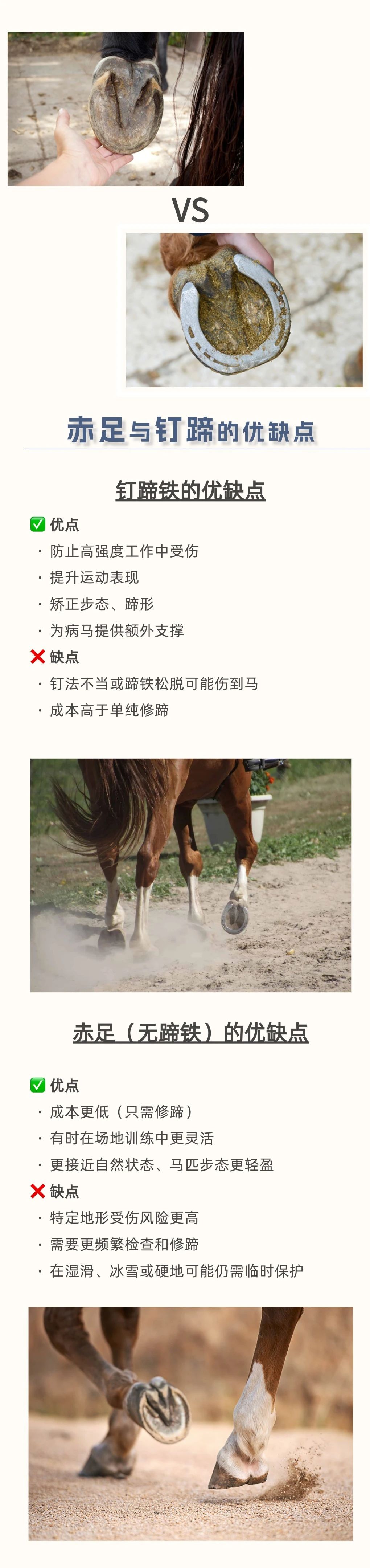 馬天生就有堅(jiān)硬的蹄子,真的還需要穿“鞋”嗎? 在馬場(chǎng),你可能見過(guò)這樣一幕:鐵匠將燒紅的蹄鐵按在馬蹄上,空氣中彌漫著一股焦味。有人說(shuō)這是保護(hù)馬蹄的必備工序,有人覺得沒必要。那么,釘蹄對(duì)馬來(lái)說(shuō),到底是“必需品”還是“可選項(xiàng)”? 本文將帶你了解馬蹄鐵的歷史、釘蹄鐵的原因與方法、熱釘法的原理,以及釘與不釘蹄鐵各自的優(yōu)缺點(diǎn),幫你判斷自己的馬是否真的需要蹄鐵。 蹄鐵不是“必須”也不是“多余”,它是根據(jù)馬匹實(shí)際情況量身決定的。無(wú)論選擇赤足(無(wú)蹄鐵)還是釘蹄鐵,定期修蹄 + 專業(yè)檢查才是保持馬蹄健康的關(guān)鍵。 |