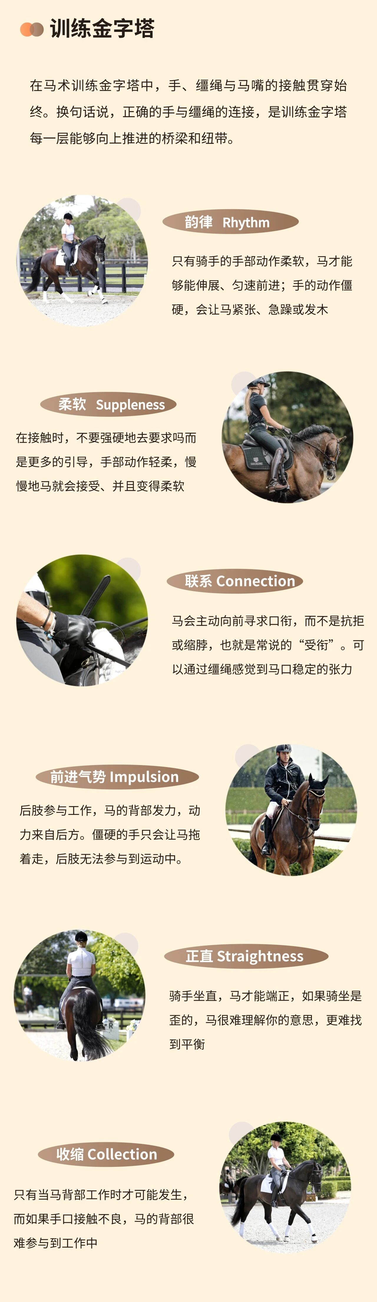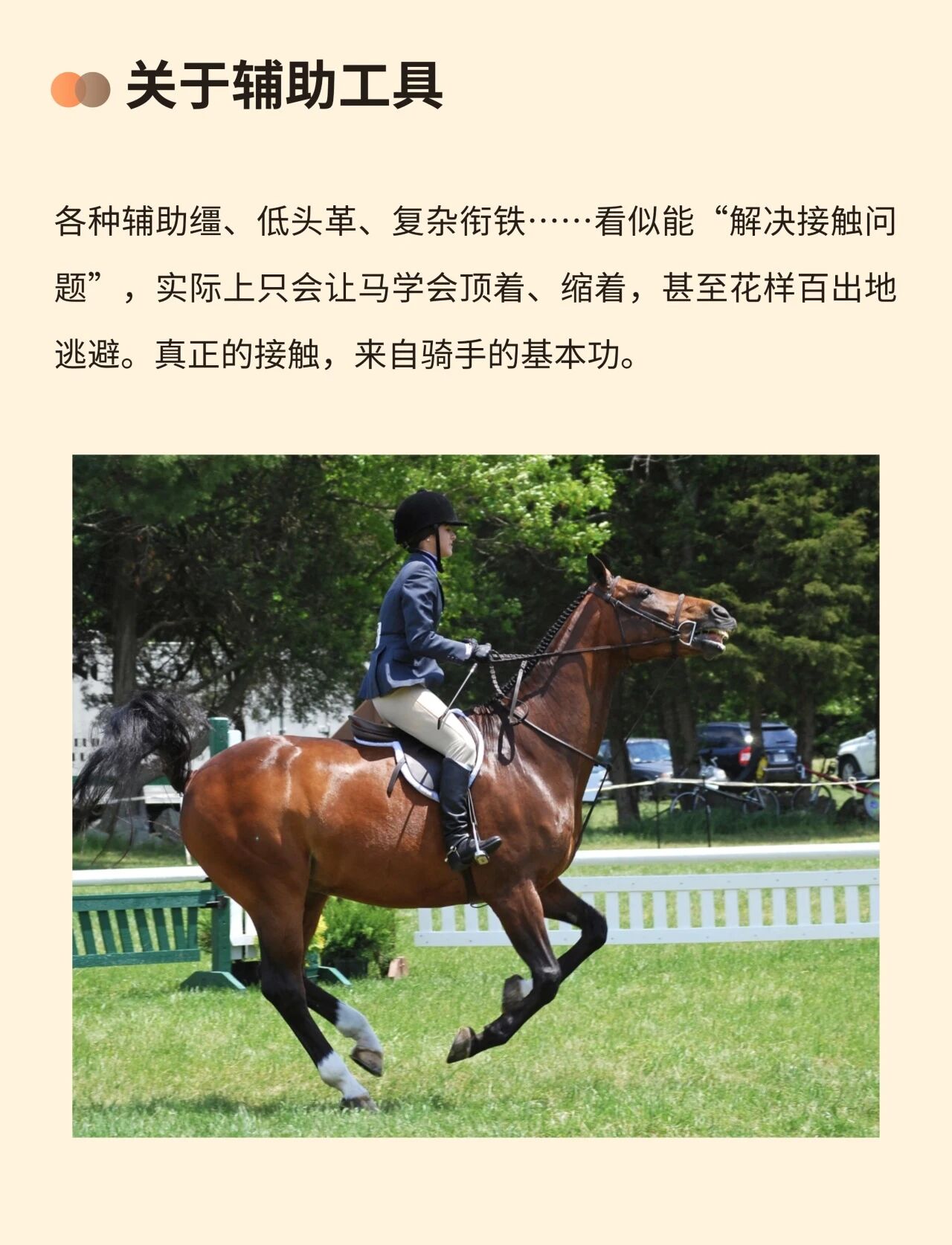 真正的接觸,應(yīng)該是柔和、穩(wěn)定、有彈性的,而不是把馬“推”得像一輛不情愿前進(jìn)的小推車。