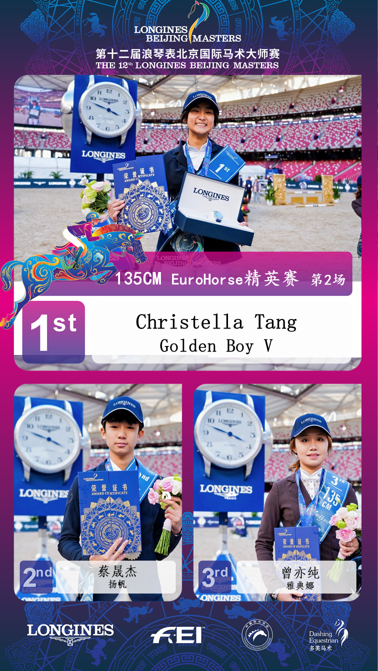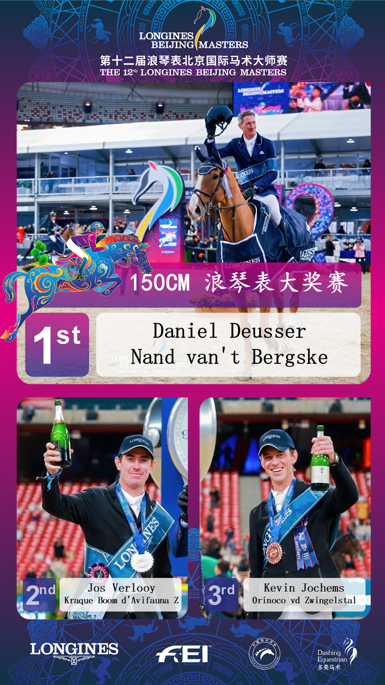 [2025年10月19日]第十二屆浪琴表北京國際馬術(shù)大師賽圓滿完成收官日的爭奪戰(zhàn)!從100CM團(tuán)體賽的默契協(xié)作,到105CM公開賽的精準(zhǔn)爭時(shí);從135CM EuroHorse精英賽決賽的激烈角逐,到150CM浪琴表大獎(jiǎng)賽的壓軸對決,賽場上每一次呼吸都交織著信任的共振,每一個(gè)跨越都標(biāo)記著信念的刻度。 上午8:00的100CM團(tuán)體賽中,悅林馬術(shù)憑借三位騎手的出色發(fā)揮成功登頂!騎手侯僑軒策騎擎天柱、翁敬涵搭檔念月、顧馨悅與吉爾協(xié)同發(fā)力,以4罰分、176.29秒的成績奪冠。海外騎際馬術(shù)以4罰分、179.85秒獲得亞軍,中聯(lián)騎士聯(lián)盟以4罰分、194.85秒摘得季軍!每支戰(zhàn)隊(duì)的人馬同心,都是賽場最動(dòng)人的風(fēng)景。 上午12:45,105CM公開賽圓滿完賽!騎手張羽翔策騎“辰美麗”憑借精彩表現(xiàn)以零罰分、48.60秒的出色表現(xiàn)奪得冠軍!安佳琪策騎“恩九拉”以零罰分、49.24秒的成績獲得本場比賽亞軍;沈紫昕策騎“小灰灰”以零罰分、50.22秒收獲季軍。 下午13:50開賽的EuroHorse精英賽135CM中,澳大利亞騎手Christella Tang與策騎Golden Boy V以零罰分、48.20秒的驚艷表現(xiàn)斬獲冠軍,人馬配合如行云流水,每一次躍起都是力與美的極致展現(xiàn)。蔡晟杰與“揚(yáng)帆”以4罰分、45.64秒收獲亞軍,曾亦純搭檔“雅典娜”以4罰分、50.23秒的成績位列季軍。 下午16:40,壓軸的150CM浪琴表大獎(jiǎng)賽更將賽事推向巔峰,爭奪激烈!11對人馬組合成功晉級附加賽,不僅展現(xiàn)了馬術(shù)運(yùn)動(dòng)的獨(dú)特魅力,更讓現(xiàn)場及屏幕前的觀眾全程熱血沸騰!德國騎手丹尼爾·杜瑟(Daniel Deusser) 策騎“Nand van't Bergske”歷經(jīng)一輪爭時(shí)賽與附加賽的極致考驗(yàn),最終以0罰分、46.39秒的完美表現(xiàn)力壓群雄,加冕冠軍!這場終極較量不僅是對技術(shù)的淬煉,更是對心態(tài)的頂級考驗(yàn),丹尼爾·杜瑟的勝利完美詮釋了人馬合一的巔峰境界。喬斯·維羅伊(Jos Verlooy)與戰(zhàn)駒Kraque Boom d'Avifauna Z以0罰分、47.59秒的出色成績斬獲亞軍;凱文·喬赫姆斯與(Orinoco vd Zwingelstal) 以0罰分、47.82秒收獲季軍。 當(dāng)最后一道騰躍劃過賽場,2025第十二屆浪琴表北京國際馬術(shù)大師賽正式落下帷幕!這場匯聚頂尖騎手的馬術(shù)競技盛宴,以速度與優(yōu)雅的極致碰撞、人馬同心的默契,為所有觀眾留下了諸多直擊人心的震撼瞬間。 圖|150CM 浪琴表大獎(jiǎng)賽頒獎(jiǎng)典禮 圖|150CM 浪琴表大獎(jiǎng)賽冠亞季軍慶祝儀式 讓我們共同期待明年十月再度相聚鳥巢,共同見證新傳奇的誕生,續(xù)寫馬術(shù)運(yùn)動(dòng)的璀璨篇章 |