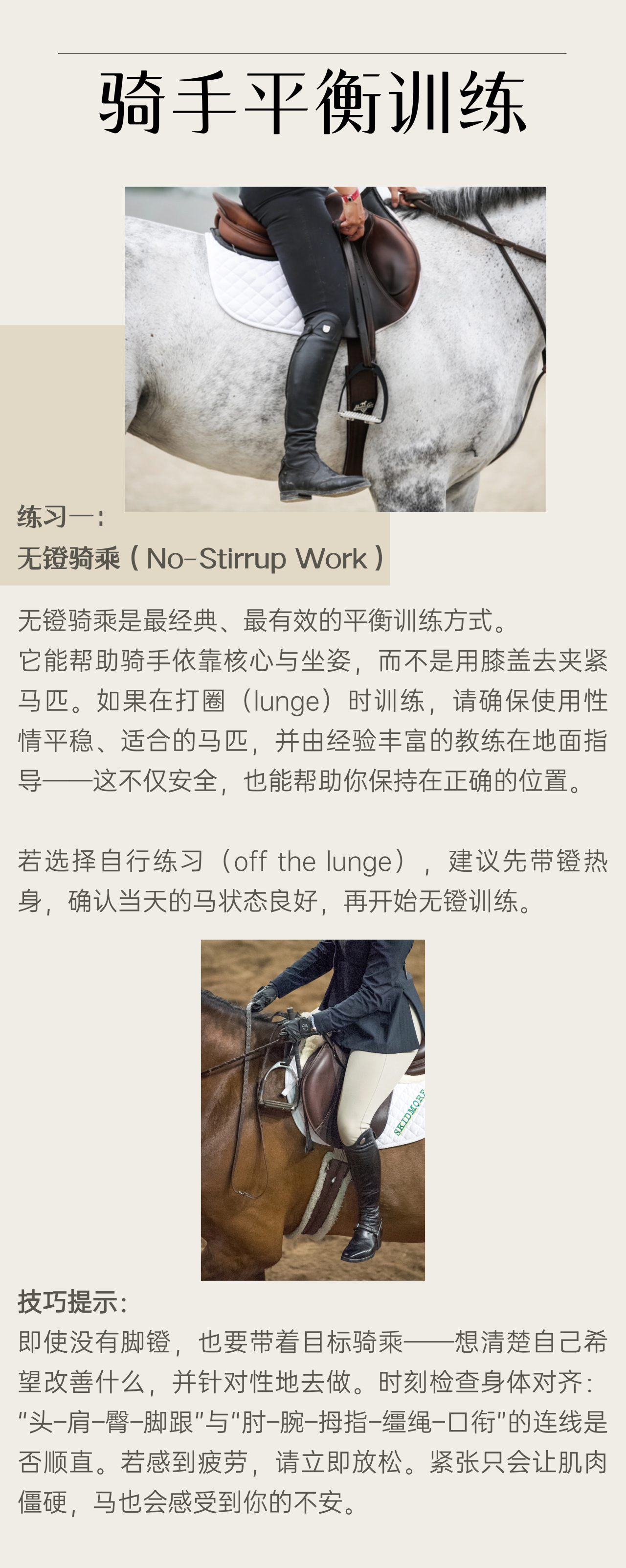 學(xué)習(xí)如何在騎乘中改善平衡,是成為一名高效騎手的基礎(chǔ)。無論是在復(fù)雜的障礙賽場上追求高度與精準(zhǔn)、在盛裝舞步中追求優(yōu)雅動作,還是只是享受一段輕松的林間騎行,騎手能否保持身體居中、穩(wěn)定、與馬匹相連,是實(shí)現(xiàn)人與馬溝通的關(guān)鍵。 然而,真正的平衡并非一蹴而就,即使對經(jīng)驗(yàn)豐富的騎手來說,這也是一個持續(xù)探索的過程。 平衡訓(xùn)練的核心,不是追求某個標(biāo)準(zhǔn)姿態(tài),而是培養(yǎng)“感知力”。當(dāng)騎手學(xué)會通過核心去穩(wěn)定、通過腿去引導(dǎo)、通過騎坐去溝通,馬匹也會在你的身體信號中獲得安全感與方向感。 |
