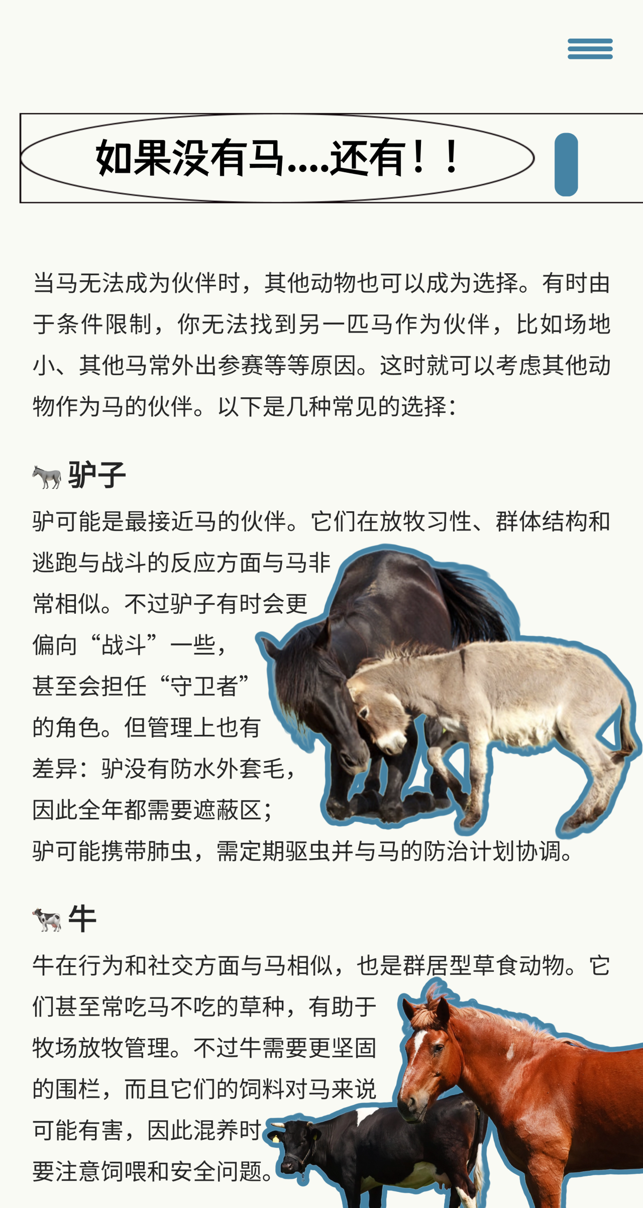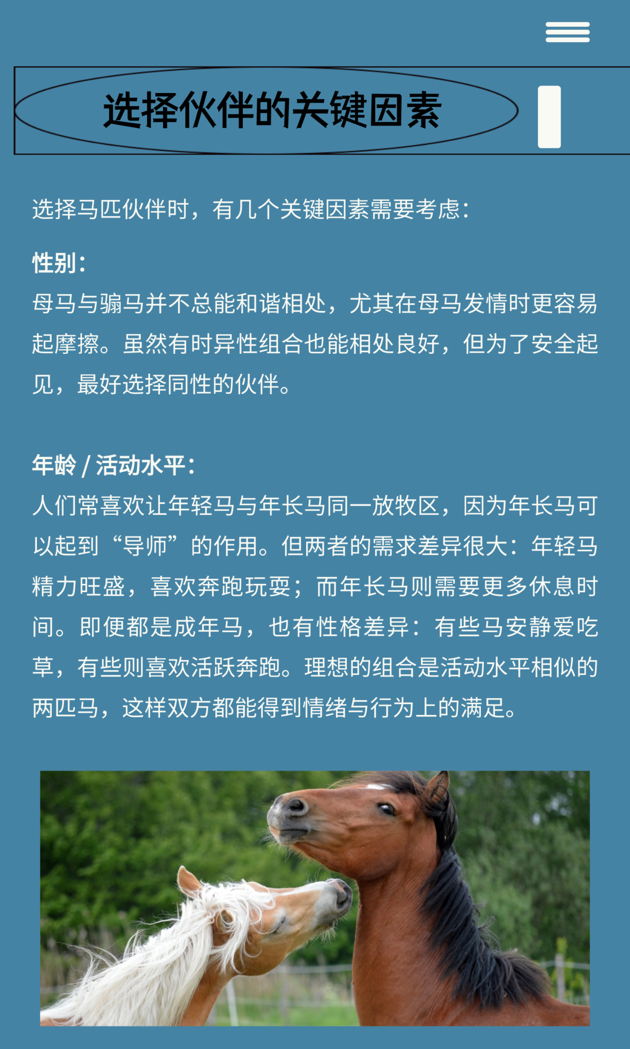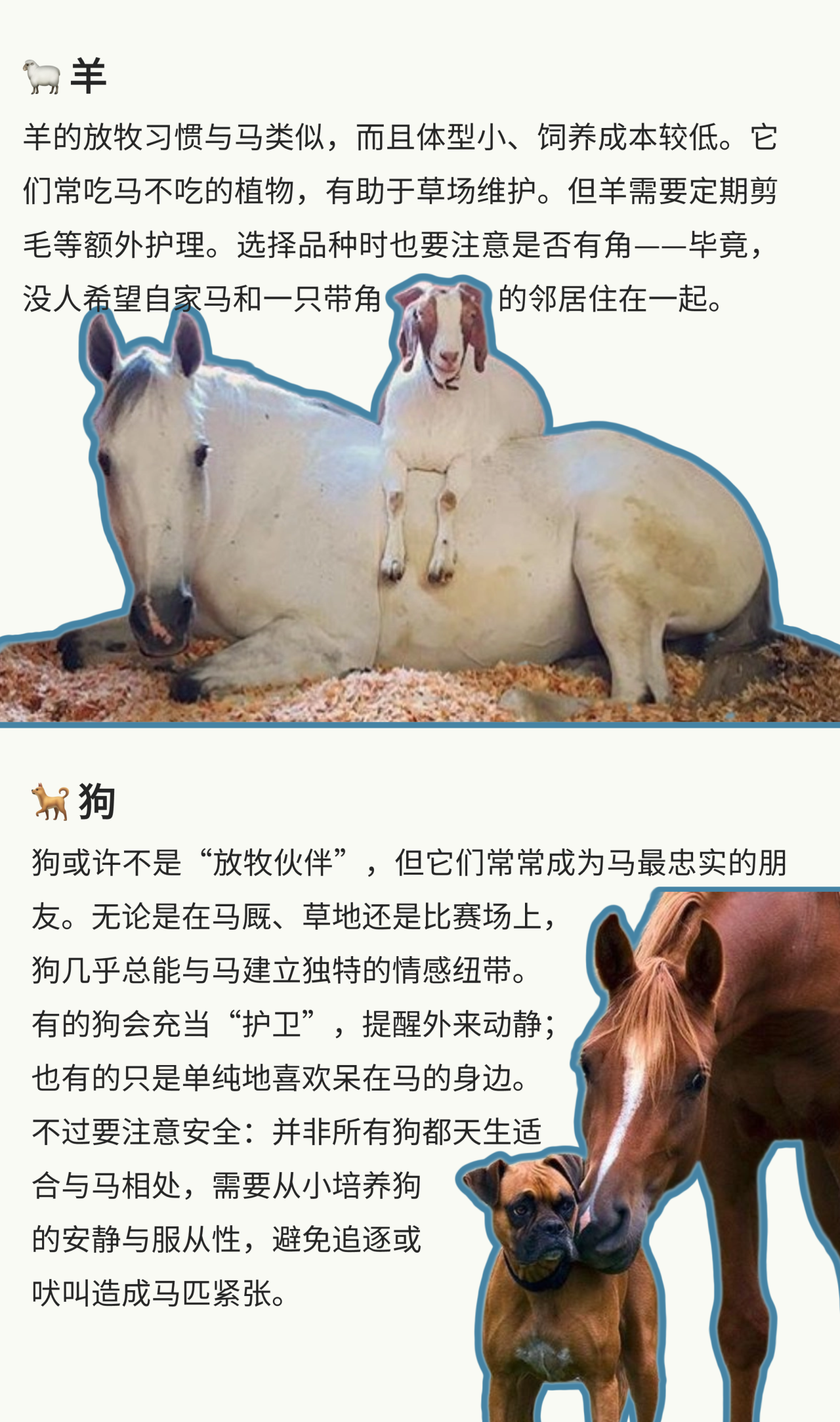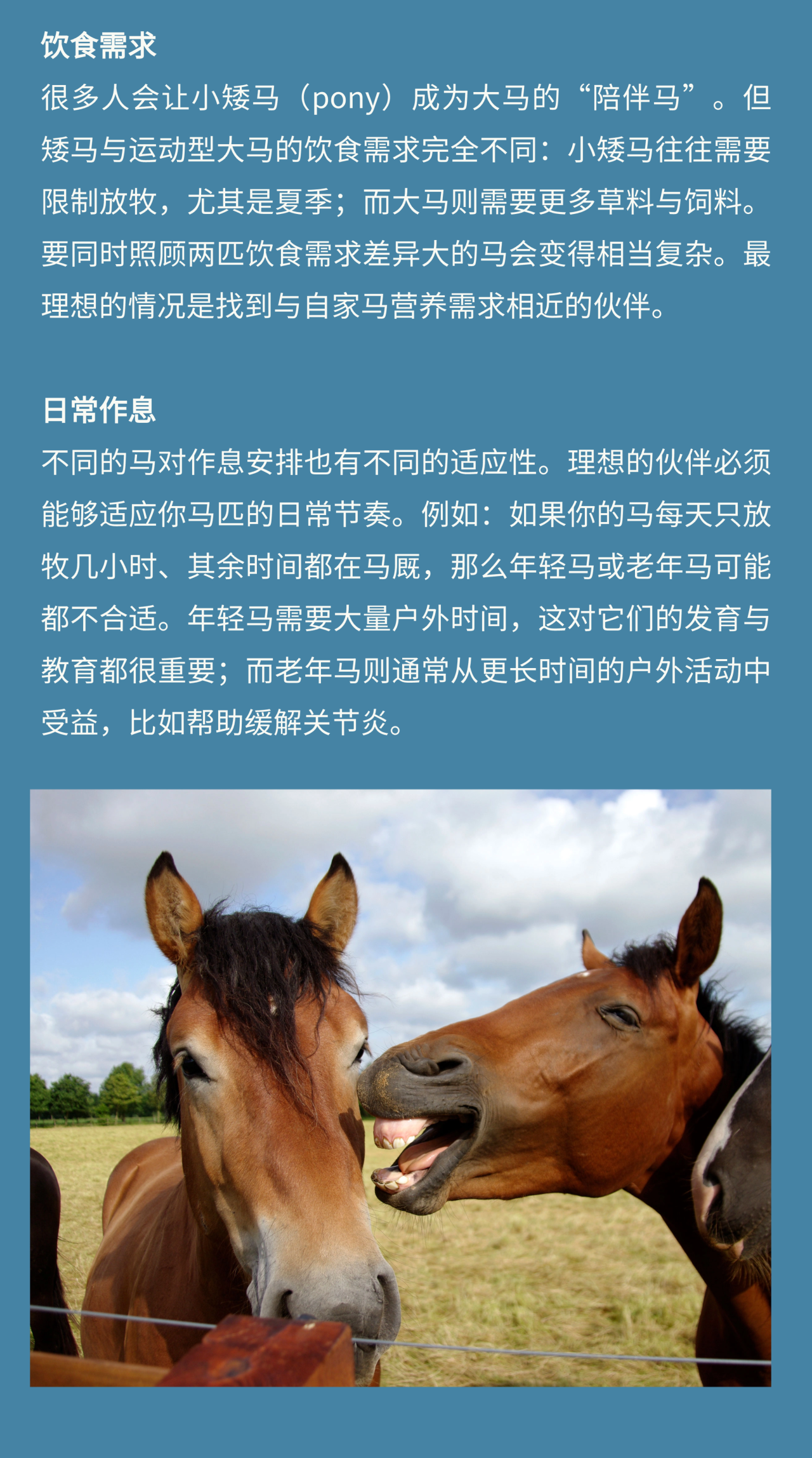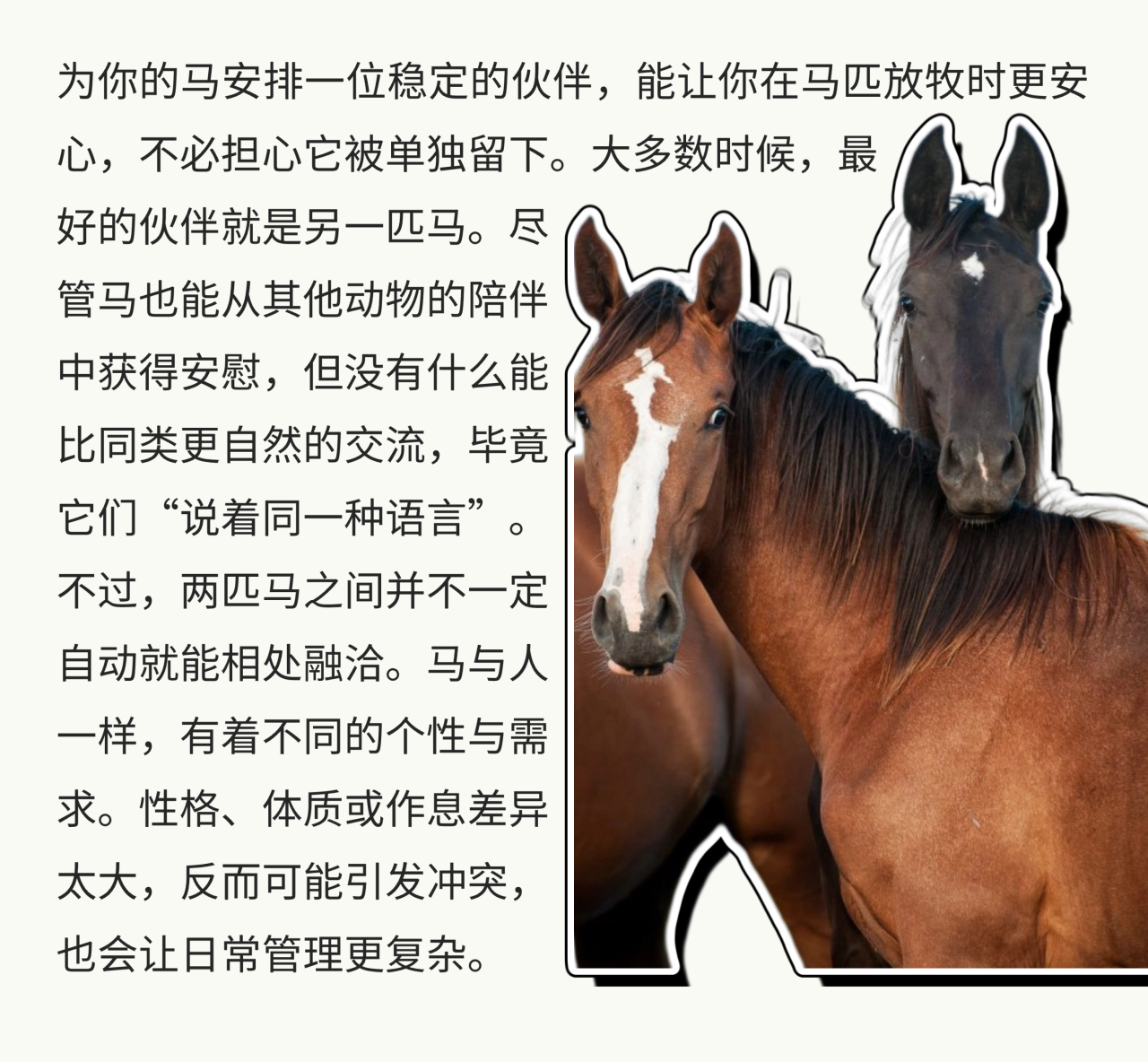馬是高度群居的動(dòng)物,它們需要同伴。 如果無法滿足其社交需求,馬的壓力水平會顯著上升,表現(xiàn)出緊張、易驚甚至“頑皮”的行為。然而,雖然你的馬需要朋友,但并不是任何一匹馬或動(dòng)物都能成為理想的伙伴。要找到合適的“馬友”,你需要仔細(xì)思考。 為馬選擇伙伴看似簡單,實(shí)則需要很多的考量。理想的搭檔不僅能讓你的馬情緒更穩(wěn)定、生活更快樂,還能讓日常管理更輕松。無論你選擇另一匹馬、還是其他動(dòng)物,只要理解并尊重它們各自的天性,讓它們安全、舒適、被陪伴,就是最好的選擇。 |