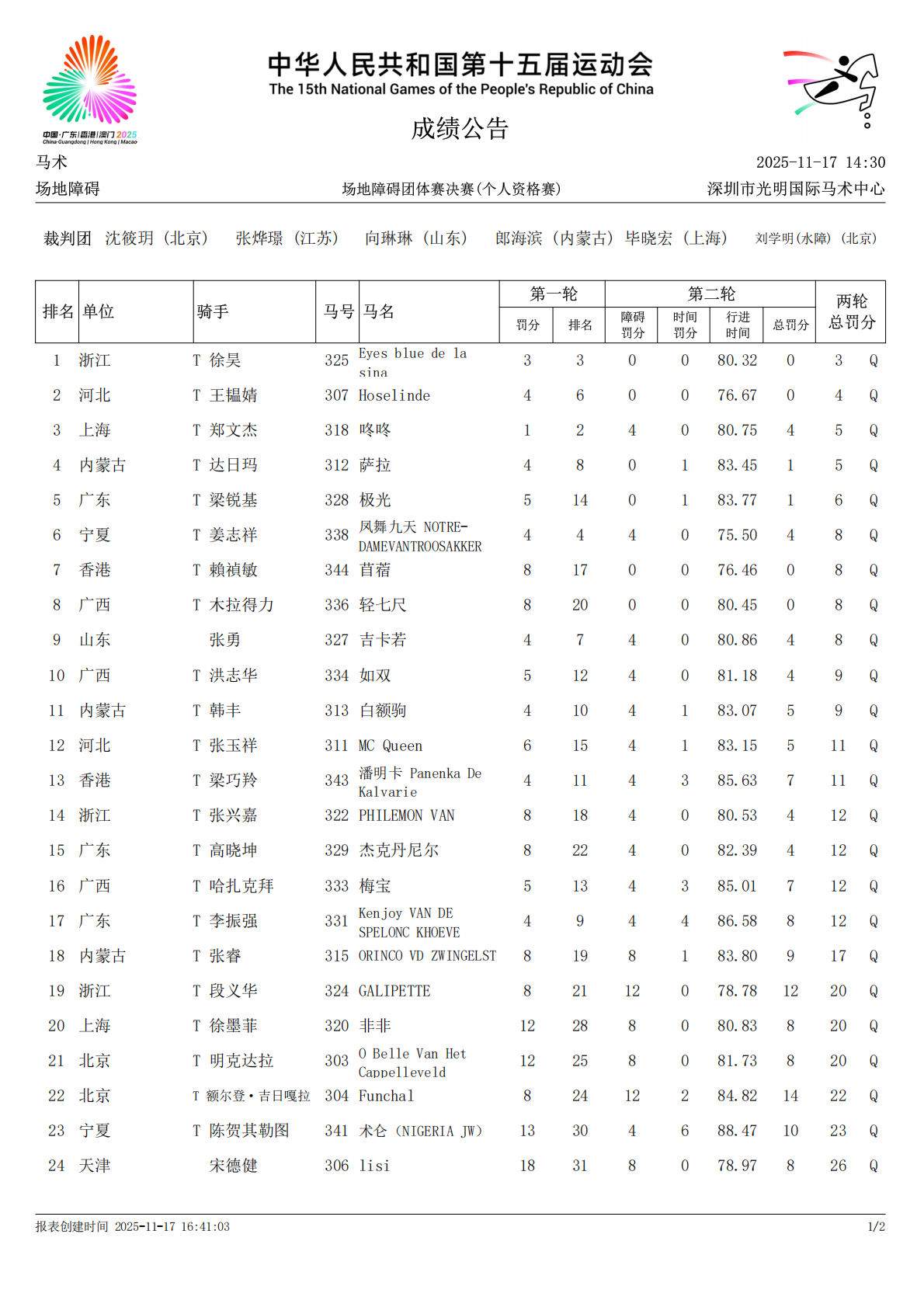11月17日,中華人民共和國第十五屆運(yùn)動會馬術(shù)場地障礙團(tuán)體賽暨個人資格賽在深圳光明國際馬術(shù)中心順利舉行,書寫了一場充滿變數(shù)的賽場故事。 從第一輪上海隊(duì)13罰分領(lǐng)跑展現(xiàn)的精準(zhǔn)操控,到第二輪廣西隊(duì)以29分總罰分逆襲登頂?shù)姆€(wěn)健發(fā)揮,九支隊(duì)伍在障礙間的每一次起跳、每一次落地,都既藏著人馬協(xié)作的默契,也帶著競技體育的未知。 這場賽事不僅誕生了新的冠軍,也讓觀眾看到了不同隊(duì)伍在挑戰(zhàn)面前的堅(jiān)守與突破。 第一輪:上海隊(duì)驚艷領(lǐng)跑,傳統(tǒng)強(qiáng)隊(duì)暫居中游 團(tuán)體賽成績計(jì)取每輪最佳3對人馬組合總罰分,兩輪累計(jì)罰分低者勝出。 上海隊(duì)以 13 分的超低罰分驚艷全場,強(qiáng)勢占據(jù)榜首位置。騎手楊華搭檔馬匹 “CARRICK” 以完美表現(xiàn)拿下全場唯一的零罰分,同隊(duì)騎手鄭文杰搭檔馬匹“咚咚”僅因速度稍慢獲得了1分時間罰分。 緊隨其后的是河北隊(duì),人均僅打落一桿,得到14分的罰分,暫列次席。排名第三的內(nèi)蒙古隊(duì)則穩(wěn)扎穩(wěn)打,首輪先獲得16罰分。 內(nèi)蒙隊(duì)騎手張睿搭檔“ORINCO VD ZWINGELST” 圖/何亦紅 最終的冠亞軍在首輪并未展現(xiàn)出絕對優(yōu)勢,廣東隊(duì)以17罰分暫列第四,廣西隊(duì)18罰分排名第五。 第二輪:廣西隊(duì)逆襲,上海隊(duì)遺憾止步 廣西隊(duì)在第二輪強(qiáng)勢反擊:木拉得力與“輕七尺”率先交出零罰分,兩名隊(duì)友雖各落一桿,但全隊(duì)仍以 11 分的單輪罰分(總罰分 29)實(shí)現(xiàn)大逆轉(zhuǎn),從首輪第五一路沖到冠軍位置。 這枚金牌,是廣西馬術(shù)隊(duì)參加全運(yùn)會以來的第一枚金牌,也為他們寫下了真正意義上的歷史時刻。 “上屆全運(yùn)會我也代表廣西隊(duì)出戰(zhàn),但因1分時間罰分,隊(duì)伍遺憾無緣前三。這一屆非常非常幸運(yùn),能夠與三位首次來到全運(yùn)會賽場的隊(duì)友一起贏得金牌,創(chuàng)造屬于我們的歷史。”賽后接受馬術(shù)在線記者采訪時,廣西隊(duì)騎手木拉得力激動地說道。 廣西隊(duì)騎手木拉得力搭檔馬匹 “輕七尺” 圖/何亦紅 廣西隊(duì)騎手洪志華(左)哈扎克拜(右) 圖/何亦紅 作為全運(yùn)會上的常年勁旅,廣東隊(duì)本輪依舊發(fā)揮穩(wěn)健。梁銳基搭檔“極光“輕盈完賽,獲得1分時間罰分,全隊(duì)總罰分30,僅以1分之差惜獲亞軍。 廣東隊(duì)騎手梁銳基搭檔馬匹“極光“ 圖/何亦紅 廣東隊(duì)騎手李振強(qiáng)搭檔馬匹“Kenjoy VAN DE SPELONC KHOEVE” 圖/何亦紅 內(nèi)蒙古隊(duì)緊隨其后,全隊(duì)最后登場的騎手達(dá)日瑪搭檔“薩拉”頂住壓力,只因速度稍慢獲得1分時間罰分。最終隊(duì)伍成功保持住了第一輪的排名,以31分總罰分收獲季軍。 內(nèi)蒙古隊(duì)騎手們進(jìn)行勝利騎乘 圖/何亦紅 內(nèi)蒙古隊(duì)騎手達(dá)日瑪搭檔“薩拉” 圖/何亦紅 而首輪領(lǐng)跑的上海隊(duì),在第二輪遭遇了意外挑戰(zhàn):在僅有三對人馬組合參賽的情況下,首輪唯一一位零罰騎手楊華的搭檔馬匹“CARRICK“在場上兩次不服從,根據(jù)規(guī)則被判罰淘汰,最終隊(duì)伍因有效成績不足三人,未能計(jì)入總排名。 在個人資格賽中排名前30的人馬組合晉級決賽,將于11月19日展開對決,晉級名單如下。 十五運(yùn)馬術(shù)項(xiàng)目的壓軸之戰(zhàn)即將登場,場地障礙個人決賽的勝負(fù)往往在瞬息之間定奪。賽事看點(diǎn),不容錯過!關(guān)注馬術(shù)在線公眾號,第一時間獲得戰(zhàn)報(bào)速遞! 文/劉桐溪 圖/何亦紅 |