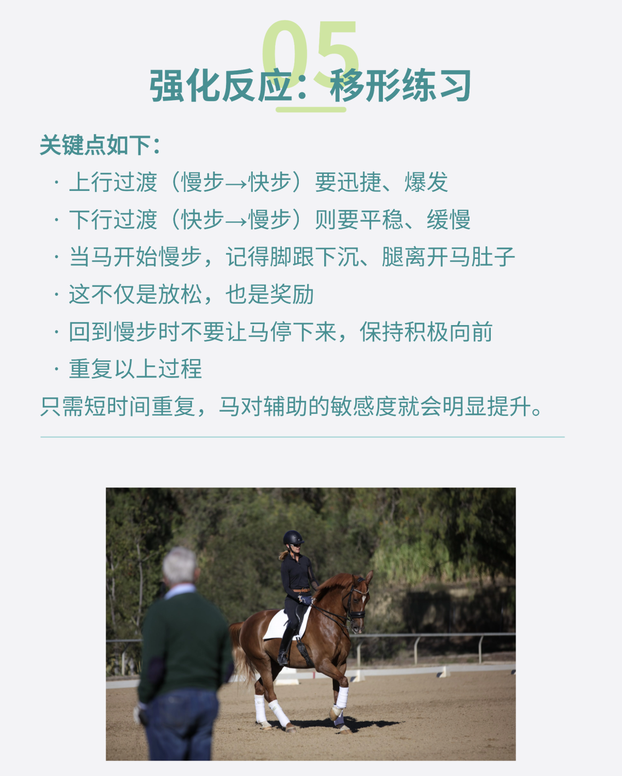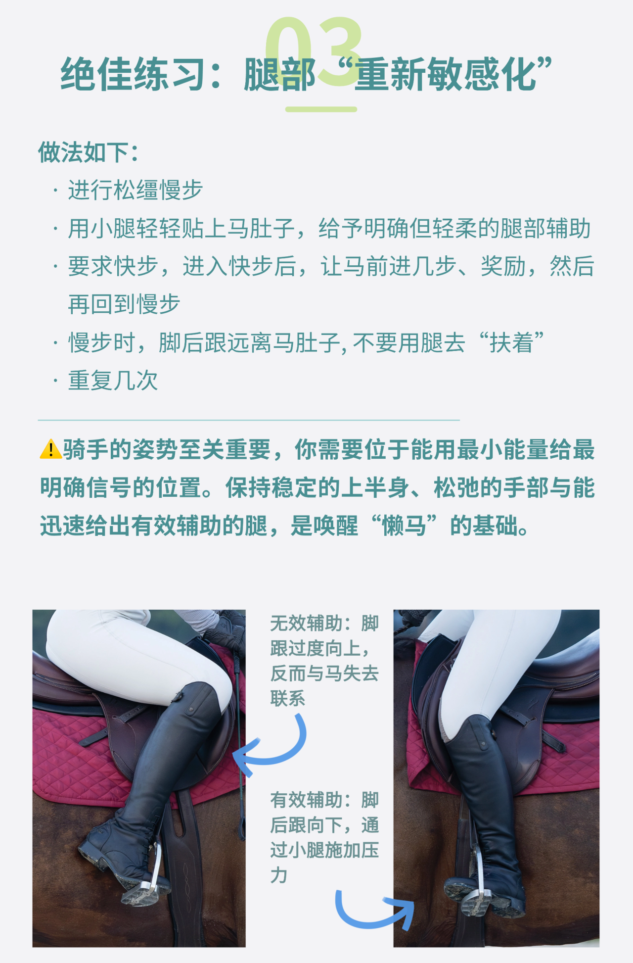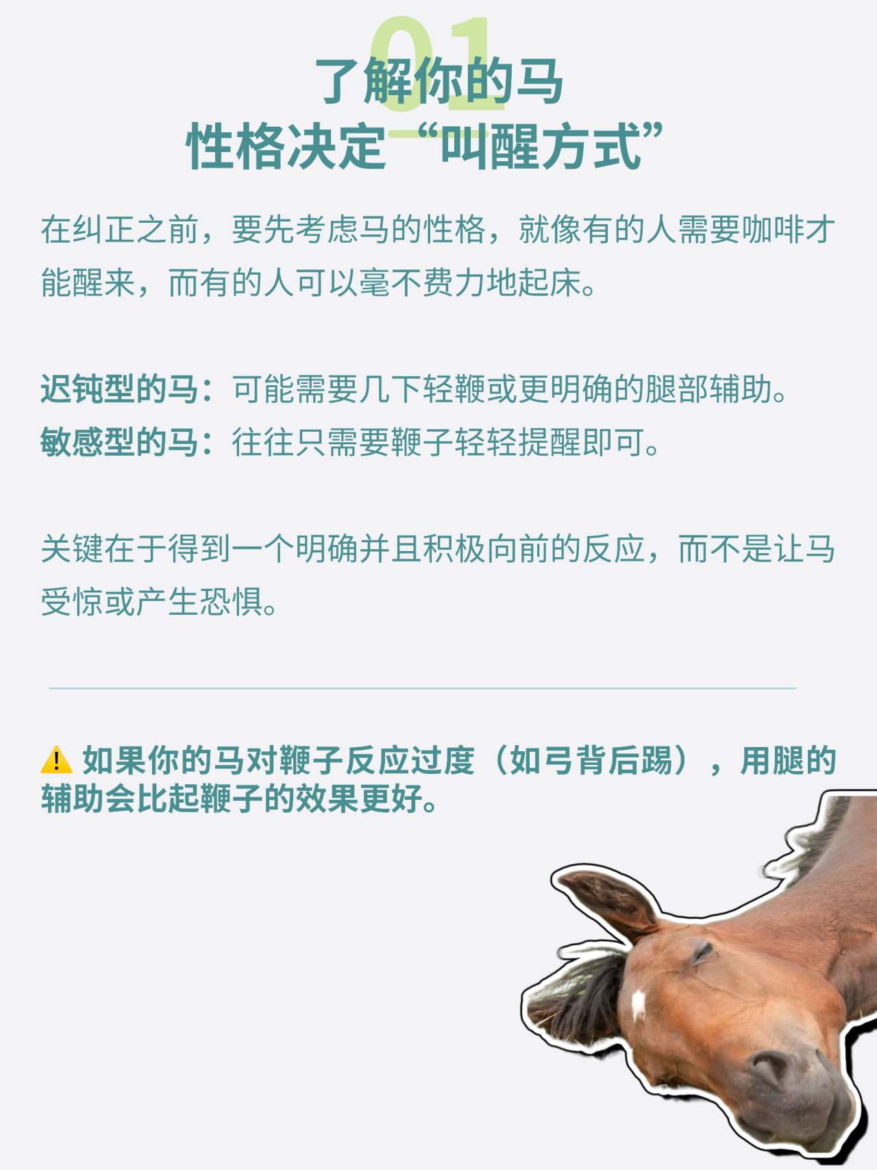 你是否常覺得自己拼命想讓馬“向前”,而你的馬卻步伐慢吞吞、反應(yīng)懶洋洋?事實上,馬天生并不懶,它們非常敏感,就連蒼蠅落在身上都能感受到。所以對騎手的輔助(Aid)遲鈍并非天性,而是訓(xùn)練中逐漸形成的習(xí)慣。通過正確的方法,你完全可以重新喚醒馬對輔助的敏感性。 喚醒馬,也是在喚醒騎手的訓(xùn)練思維。通過讓輔助更清晰、獎勵更及時,你不僅能讓馬重新敏感、有動力,也能讓整個騎乘過程變得輕松愉快。訓(xùn)練目標不是“讓馬變快”,而是 讓馬愿意回應(yīng)你。 |