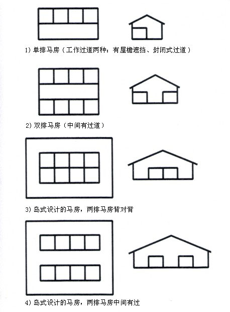 (二)馬廄布局選擇 (圖一) 根據(jù)馬廄和過道的位置,馬房平面圖(如圖一)一般認(rèn)為有三種設(shè)計:單排、雙排或島式設(shè)計。若當(dāng)?shù)貧夂虮容^溫和,單排馬房(如圖二)比較常見,而且外面的過道對馬匹護理員來說是舒適的工作環(huán)境。當(dāng)馬匹大多時間在室外,而且可自由出入馬房,也會用到單排馬房。在美國,雙排馬房(如圖三)常用做寄養(yǎng)私人馬匹和比賽設(shè)施,封閉的過道對于馬匹護理工作很重要。島式設(shè)計多用于馬匹集中訓(xùn)練時,如速度賽馬,馬房周圍的“環(huán)形走道”是為了讓馬匹盡快降溫或是訓(xùn)練馬匹。 (圖二) (圖三) (1)單排馬房的構(gòu)造