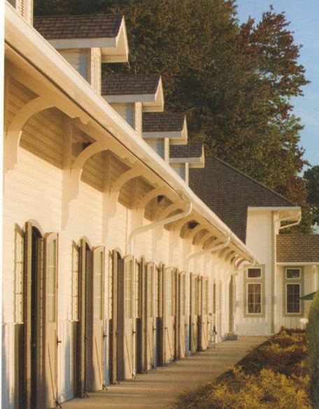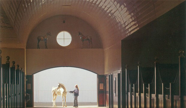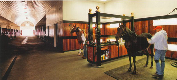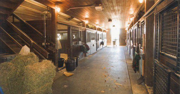 與其他兩種設(shè)計相比,單排馬房的構(gòu)造很漂亮,它最大程度地減少了封閉空間。馬匹和自然環(huán)境更接近,每匹馬都可以有稱心的馬廄。不過,除非馬房是部分封閉,否則這種馬房設(shè)計難以保護馬匹護理員免受天氣的影響。 (2)雙排馬房(過道在兩排馬廄中間)的構(gòu)造