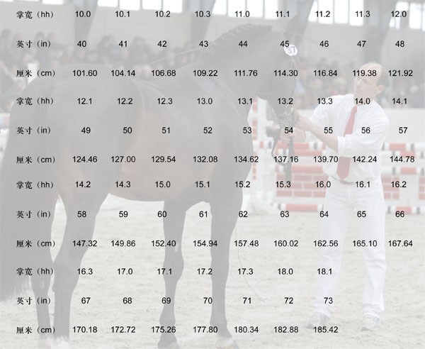 要點(diǎn)提示 古英國(guó)時(shí)期因?yàn)闆]有國(guó)際公認(rèn)的度量單位,所以人們往往用自己的腳來測(cè)量實(shí)地的面積,用自己的手掌來測(cè)量馬的體高。 Hand是指手掌的長(zhǎng)度,還是寬度? 14.2掌寬(hh)等于144.27cm,對(duì)嗎? 為何說16.5掌寬(hh)的說法是錯(cuò)誤的? 問:什么動(dòng)物有“手掌”多于“腳”? 答:當(dāng)然是馬。比如純血馬就有16個(gè)“手掌”,四個(gè)“腳”。 問:世界上最高的馬有多高? 2010年吉尼斯世界紀(jì)錄世界上最高的馬“大詹克”(Big Jake,品種:比利時(shí)挽馬,29歲騸馬,測(cè)量時(shí)未掛掌,地面到鬐甲高),體高:20.2- 3/4掌。那么這個(gè)值準(zhǔn)確點(diǎn)說是多少呢?(見后文的換算) 難改的習(xí)慣 俗話說“人有大小,馬有高低”。因此測(cè)量馬的體高顯得很重要,尤其在馬匹登記、馬市交易等場(chǎng)合。以歐洲為主導(dǎo)的世界多數(shù)國(guó)家都用cm作測(cè)量的標(biāo)準(zhǔn)單位。但是在英國(guó)、美國(guó)、加拿大、澳大利亞等國(guó)仍然有沿用“掌寬”(以下亦簡(jiǎn)稱“掌”)的習(xí)慣,在很多有關(guān)馬的書籍、雜志、報(bào)刊中使用“掌寬”的頻率依然較高。在實(shí)際應(yīng)用中,包括以英語為母語的國(guó)家的人們對(duì)這個(gè)概念常常會(huì)產(chǎn)生誤解。故有在此說一說的必要。 在英國(guó)、美國(guó)、加拿大的過去,愛馬、養(yǎng)馬、賽馬、騎馬是一個(gè)傳統(tǒng)。在過去,養(yǎng)馬人沒有體尺,如何測(cè)量馬的體高呢?他們發(fā)明了用手掌,即用手掌的寬度從地上沿著馬的前腿到馬的鬐甲,測(cè)量的時(shí)候用兩手交替地測(cè)量和數(shù)數(shù),數(shù)到多少個(gè)就是多少“掌”。 養(yǎng)馬人之間,互相盤問馬的體高時(shí)經(jīng)常會(huì)問:“多少掌?”回答也很簡(jiǎn)單,比如“15掌”,一目了然,這個(gè)習(xí)俗一直延續(xù)到了現(xiàn)在。不但對(duì)馬、矮馬,就是對(duì)驢、對(duì)騾子也是這樣,因?yàn)樗鼈兌际且粋€(gè)馬屬的動(dòng)物。 習(xí)慣成自然。你若是跟美國(guó)人用厘米說馬的體高,他還要轉(zhuǎn)換到“掌寬”才能明白。但是,不同男人手掌寬度的大小也是不相同的,所以,最后大家做了一個(gè)統(tǒng)一規(guī)定,即以標(biāo)準(zhǔn)男人的手掌寬度為一個(gè)掌寬,亦即1個(gè)掌寬等于4英寸,即等于10.16cm。在這里,再一次提醒,掌寬和英寸的關(guān)系是4進(jìn)制的。 掌寬的表示法 字母h代表掌“hands”,或者h(yuǎn)h是“掌高”(hands high)。 矮馬與大馬的區(qū)分標(biāo)準(zhǔn) 關(guān)于矮馬(Pony)和馬(Horse)世界的區(qū)分標(biāo)準(zhǔn)是按掌寬的高度來劃分的,而不是以厘米來劃分的。矮馬的標(biāo)準(zhǔn)就是體高小于14.2hh,而高于此值的就叫馬(Horse)。有一些國(guó)家可能略有不同,如澳大利亞的標(biāo)準(zhǔn)就是14.0 hh。 手和腳 英國(guó)的長(zhǎng)度單位“掌寬”是用來測(cè)量馬的體高,還有另一個(gè)單位“英尺”,即一個(gè)腳(foot)的長(zhǎng)度,是用來測(cè)量鞋的標(biāo)準(zhǔn),很明顯最初這些都是一個(gè)自然尺度。 1掌寬(hands)=4英寸(inches) = 10.16cm 1英尺(foot)=12英寸(inches) = 30.48cm 英寸也是一個(gè)“自然”度量單位,原為盎格魯—撒克遜的長(zhǎng)度單位,來源于三顆大麥粒(馬很喜歡吃大麥)的長(zhǎng)度,約合2.54cm。 如何讀? 14.2hh英語怎么讀?應(yīng)讀作“fourteen two”(十四,二)或者“fourteen and a half”(十四,一半掌寬),或者讀作“fourteen two hands high”。 如何寫? 掌寬的正確表示法 下面就是幾個(gè)例子,請(qǐng)牢記小數(shù)點(diǎn)前是“掌寬”,小數(shù)點(diǎn)后是“英寸”。 15.0 hh (或?qū)懽?5 hh)——代表15馬有掌寬的高度。 15.1 hh——代表15馬有掌寬,加上1英寸的高度。 15.2 hh——代表15馬有掌寬,加上2英寸的高度。 15.3 hh——代表15馬有掌寬,加上3英寸的高度。 15.4 hh——這樣寫是錯(cuò)誤的,因?yàn)?掌寬等于4英寸,應(yīng)該進(jìn)位,寫作16.0hh。 15.5 hh——這樣寫是錯(cuò)誤的,如果你是指15掌加上0.5掌,正確的寫法是15.2。 如何換算? 14.2hh如何換算成厘米(cm),有兩種方法: (1)小數(shù)點(diǎn)前用掌寬,小數(shù)點(diǎn)后用英寸。1掌寬=10.16cm,14×10.16=142.24,另外再加上2英寸,1英寸等于2.54cm,則2英寸等于5.08cm。故14.2hh=147.32cm。 (2)全部換算成英寸,1掌寬等于4英寸,14掌寬等于56英寸,另外加2英寸,共計(jì)58英寸,1英寸等于2.54cm,故14.2hh=147.32cm。 如果遇到分?jǐn)?shù)的情況,則基本原理相同: 14.1-3/4 hh ,此值介于14.1和14.2之間,先換算成英寸:14×4+1.75=57.75(英寸),轉(zhuǎn)換為146.69cm。 20.2- 3/4hh,即20掌,2.75英寸,20×4+2.75=80.75英寸,合210.19cm。 廣告上的幽默 什么是矮馬(Pony)?就是用運(yùn)輸過來的精液對(duì)你的母馬進(jìn)行人工授精所生出的馬,廣告說提供精液的種公馬有15掌。 廣告:這匹馬到成年的時(shí)候據(jù)推算肯定有16掌。 原因:現(xiàn)在是13掌,母親是14.2掌,父親是14.3掌,系譜上往前推18代都在15掌以下,然而這匹馬逆反,會(huì)公然反抗它自己的DNA,肯定會(huì)長(zhǎng)到16掌。 掌寬、英寸、厘米轉(zhuǎn)換表 |