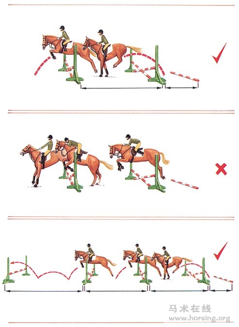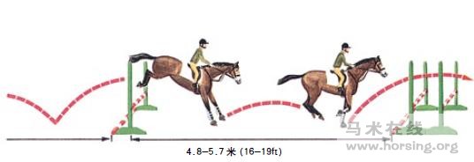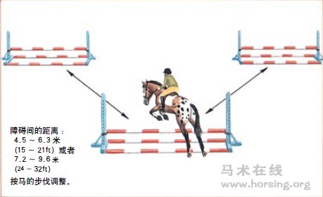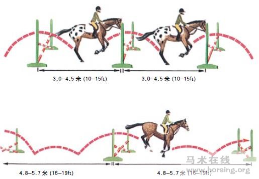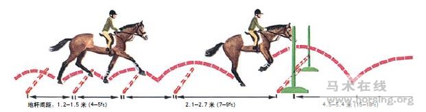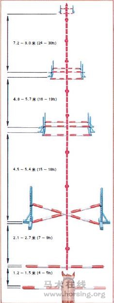 連跳 連跳是騎手和馬匹的一種有效的體能和柔軟性訓(xùn)練。根據(jù)障礙的大小,一個連跳的距離從3.0-4.5 米不等,當(dāng)障礙比較小,在訓(xùn)練中適合比較短的距離。如果用小的障礙練習(xí),在不出現(xiàn)問題的情況下,可調(diào)整距離以適合馬匹。如果距離不合適你的馬,遇到一個大的復(fù)合障礙,馬匹就要很努力地去跳躍,這樣馬匹就會害怕并失去信心。如果障礙高度為45厘米,馬就容易跳躍而不會害怕了。 在障礙前放置一個快步桿作為定位桿引導(dǎo)馬匹去跳躍??觳綏U距第一個交叉桿1.8-2.7 米,2 個交叉桿間的距離為3.0-3.6 米。交叉桿可使馬匹保持在障礙中間正直連跳。馬跳躍時可能犯的一個錯誤是斜著跳躍第二個障礙,交叉桿可防止發(fā)生這樣的錯誤。騎手的姿勢很重要,在連跳時騎手不能趴在馬的頸部上(這樣就不能跳躍每一個障礙,你必須多加注意避免這樣做)。在馬躍起跳躍第二個或第三個障礙時,馬的前驅(qū)必須是輕的,如果騎手的重心太向前,馬起跳就很困難。騎手必須保持重心落于頭和腳跟形成的直線位置,必須始終與馬保持著聯(lián)系。馬在連跳時需要騎手的支持,平衡是十分重要的。 雙連跳到垂直欄 這是上一個練習(xí)的擴(kuò)展,這時馬必須做2 個連跳,然后跑一步再跳躍4.5-5.4 米遠(yuǎn)的另一個障礙。這種訓(xùn)練可提高馬的運(yùn)動能力和反應(yīng)能力,也是對騎手平衡性一個很好的測試。 快步桿有助于馬匹到達(dá)正確的起跳位置,騎手必須確保馬匹是平衡的,并有一個好的節(jié)奏和推進(jìn)力。 騎手要牢記一點(diǎn),不能與馬失去聯(lián)系;上身不能突然前傾,但允許從髖部以上略向前移動;應(yīng)引導(dǎo)并允許馬跳躍,不要試圖用自己的身體影響跳躍或用手向上提馬。盡可能保持不動,幫助馬在落地和起跳時調(diào)整其平衡。在連跳時,大多數(shù)騎手明顯移動他的身體,騎手的身體越平穩(wěn)不動,馬就越容易跳躍。設(shè)想如果騎手拱著背來回扭動身體,那么馬能輕松跳躍嗎? 為測試馬是否正直跳躍,可以更換交叉桿,但騎手必須確保不讓馬匹偏向一側(cè)。最后一個障礙由于馬匹有一步跑步,故比較容易跳躍。連跳障礙是依據(jù)比賽路線設(shè)置的,所以掌握技巧非常重要。不要太頻繁地做這個練習(xí),在馬跳躍復(fù)合障礙時,可以每隔一段時間練習(xí)一次,經(jīng)常交替練習(xí)很重要。 跑步連跳 這是一個跑步跳越練習(xí),開始時障礙可以設(shè)計得小一些,然后再逐漸增大到適合于騎手和馬的標(biāo)準(zhǔn)。跑步跳越訓(xùn)練很有用,因?yàn)橛靡粋€快步桿跳越只是一種方法,最后你必須用跑步跳越。大多數(shù)馬適合于跳3.4-4.5 米的距離,在必要時這個距離可作調(diào)整。在這個練習(xí)中馬的步伐、節(jié)奏和平衡沒有明顯的改變,應(yīng)該比較容易去做。 2 個障礙之間的距離會影響跑步接近的步幅,距離比較長,這就需要用較大的步幅。根據(jù)不同的距離判斷所需要的步幅很重要,這樣在越野賽中你就能正確地跳越每一個障礙。你經(jīng)常會看到一些騎手的連跳動作非常快,以致馬匹要努力收縮身體才能成功跳越。因此,平時練習(xí)跳越這種類型的障礙很重要,這樣會增強(qiáng)跳越的信心。 跑步連跳必須保持節(jié)奏和平衡,用強(qiáng)勁有力的推進(jìn)力跳越。騎手必須始終保持平衡,保持一個正確的姿勢,上身不做過多的動作,必須與馬的口部保持著聯(lián)系,但不能有任何影響馬匹跳越的限制,必須允許馬用它的頭和頸保持平衡。騎手應(yīng)從模擬越野賽的步伐到適合連跳的步伐變換練習(xí)。 復(fù)合障礙排列1 這是做了改變和增加了難度的一種較復(fù)雜的復(fù)合障礙。對新馬和騎手障礙可設(shè)計得小一些,對有經(jīng)驗(yàn)的騎手和馬匹可設(shè)計為要求的高度。4 個快步桿之間的距離為1.2-1.5 米,第4 個桿與垂直欄之間的距離為2.1-2.7 米(多數(shù)依馬的步幅長度而定,如果快步桿的間距縮小,第4 個桿與垂直欄的間距也應(yīng)減?。T诰嗟谝粋€垂直欄4.5-5.4 米處放置第二個垂直欄,然后在距第二個垂直欄4.8-5.7 米遠(yuǎn)處放置一個平行欄。在這3 個欄的后面都放一個地桿,這樣可防止馬匹太接近障礙起跳。 這種訓(xùn)練對節(jié)奏和平衡是個很好的測試。騎手必須確保馬從快步桿的中央到達(dá)障礙,并且馬是正直的。這時沒有交叉桿來保持馬在障礙欄的中間跳越,所以要依靠騎手。馬必須保持一個好的節(jié)奏、平衡和推進(jìn)力,在整個訓(xùn)練中都必須保持這樣。馬不能失去推進(jìn)力,但同時騎手也不能催促馬,馬應(yīng)不慌不忙平衡地跳越,不是用力猛沖跳越。 騎手必須集中精力保持自身的姿勢,保持平衡,在馬起跳時身體不過多前傾,應(yīng)保持抬頭向前看著最后一個障礙欄,重心必須落于腳跟,這樣在不改變騎姿的情況下能使馬匹輕松跳越。 這是一個很好的訓(xùn)練。 復(fù)合障礙排列2 這是前一個復(fù)合障礙的另一變化形式,在距交叉桿2.1-2.7 米處放置2 個快步桿(間距1.2-1.5 米),在距交叉桿4.5-5.4 米處放置第一個平行欄,然后在距此欄4.8-5.7 米遠(yuǎn)處放置第二個平行欄,再在距此欄7.2-9.0 米遠(yuǎn)處放置一個垂直欄。這是讓馬伸展跳越2 個平行欄,然后用一個短步跳越垂直欄測試馬的技術(shù)。在所有障礙欄(除交叉桿)前都有一個地桿,垂直欄