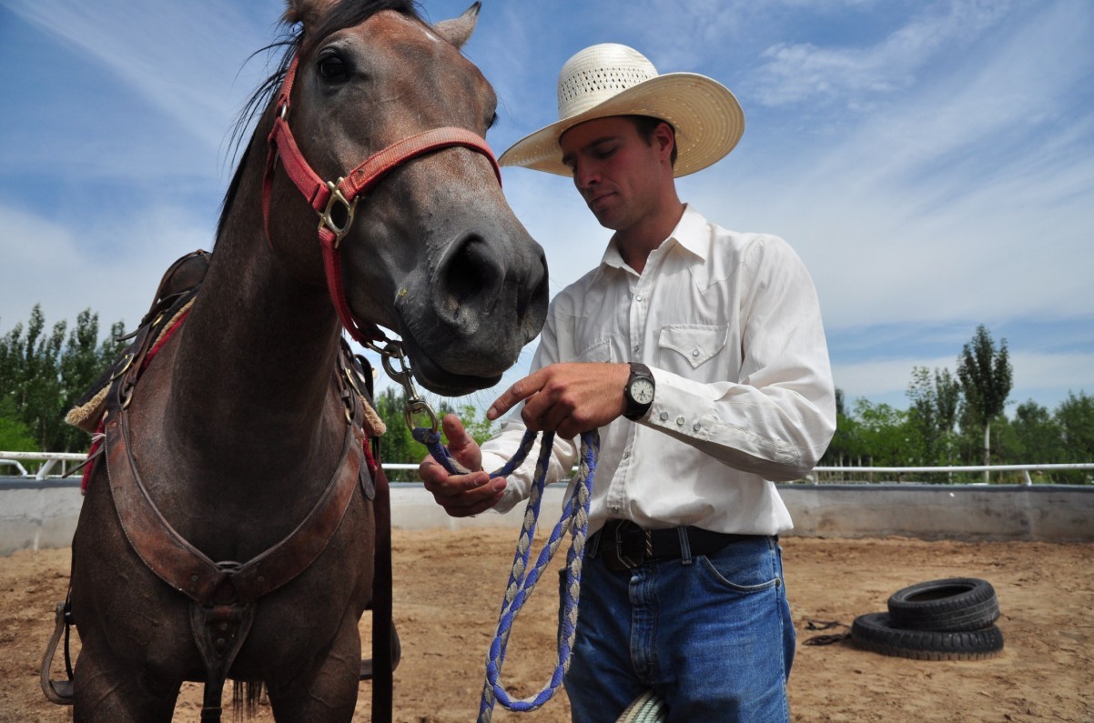 當(dāng)你剛開始學(xué)習(xí)調(diào)訓(xùn)一匹生馬的時(shí)候,首先你要選擇一匹個(gè)性溫和且樂意學(xué)習(xí)的馬。所以我們從馬房選擇了一匹已經(jīng)較為穩(wěn)定的馬匹來作為教學(xué)示范。這是一匹美國夸特馬,也是牛仔們在工作中最常見的馬種,它的體格粗壯、肌肉厚重、外形緊湊,以擅長短距離沖刺而著稱??涮伛R性格敏感而溫順,它將非常樂意配合你完成一系列的訓(xùn)練。 準(zhǔn)備工作 準(zhǔn)備工作在這里顯得尤為重要,你必須預(yù)先整理好需要用到的馬具,包括草籠頭、牽馬繩、汗屜、西部水勒韁及西部鞍。選擇一個(gè)合適的場地——一個(gè)圓形的調(diào)教圈(直徑)就是不錯(cuò)的選擇。馬是群居動物,對周圍的環(huán)境很敏感,如果場地周圍有其他自由活動的馬匹則可能會影響調(diào)訓(xùn)計(jì)劃,盡可能找到一個(gè)相對安靜、安全的地方,并將準(zhǔn)備好的汗屜、水勒及西部鞍置于場地中央。 由于現(xiàn)在沒有適用的繩索,我選擇了很普通的草籠頭來代替用繩索打的籠頭,這同樣很好用。將馬匹打理干凈后帶進(jìn)場地,為它戴上護(hù)腿,防止它在訓(xùn)練中受傷。 “介紹”鞍具 你在調(diào)教圈內(nèi)要做的第一件事,就是向馬匹“介紹”鞍具。馬匹對于顏色鮮艷、造型奇特的鞍具會相當(dāng)警覺,此時(shí)你需要引導(dǎo)它走近鞍具,同時(shí)安撫它,消除它的恐懼。 接下來,你可以動作緩慢的拿起汗屜,站在馬的左側(cè),像我這樣,用汗屜輕輕拍打馬的身體。如果它反應(yīng)激烈,那么停下動作安撫它,然后繼續(xù);慢慢地它會接受這樣的輕拍,這時(shí)就可以將汗屜放到它的背上。再到馬的右邊做同樣的動作,直到可以將汗屜放在它背上為止。 當(dāng)馬匹接受汗屜時(shí),我們就可以進(jìn)行下一步——從馬的左側(cè)將鞍子直接放到汗屜上,當(dāng)然,動作還是要輕柔。如果是小馬,有的可能就這樣安靜的站著,有的可能會跳,想甩掉鞍子,或者不安靜地扭動身體,這種情況都是很正常的。我們直接將鞍子放上去是為了讓馬匹知道,這個(gè)重量它是可以承受的。它很聰明,當(dāng)感覺背上的東西對自己沒有任何威脅時(shí),它就會慢慢去習(xí)慣。這時(shí)可以扣起肚帶,但不必太緊。 解開牽馬繩,讓馬匹在調(diào)教圈里活動一下。你需要利用牽馬繩來趕圈,讓它習(xí)慣帶著鞍子運(yùn)動,左右里懷各幾圈,同時(shí)嘴里聲音,使它注意力集中,并能理解你動作的意義——讓它動起來。 清楚指令 馬匹會很快適應(yīng)鞍子的重量,停止趕圈,讓它自己安靜下來,接下來我們教它一些簡單的指令。想要抓住它,你可以緩緩靠近,注意它的眼睛是否在觀察你,如果它看你,那么你就往后退一些,如果它不看你,就繼續(xù)靠近。它在觀察你的舉動是否對它有危險(xiǎn),當(dāng)它完全信任你時(shí),就可以抓住它的籠頭,帶上牽馬繩。 我現(xiàn)在將要教你做幾件事,注意這些動作之間的聯(lián)系: 站在馬匹的左側(cè),雙手拿著牽馬繩,往它后方走,同時(shí)左手輕輕拉一下繩就松,重復(fù)幾遍,右手持繩頭輕拍它的身體。 這樣做的目的是讓它明白指令并且向左轉(zhuǎn)。由于牽馬繩很短,它只能繞著你走,看起來有些像是原地轉(zhuǎn)圈,如果它左側(cè)做的很好,那么右側(cè)也需要同樣的練習(xí)。 訓(xùn)練馬匹做交叉步伐有些類似上面的動作,請注意: 此時(shí)你可以站在馬匹的右邊,雙手輕拍它的頸部,這時(shí)右手較左手稍高,好讓它的眼睛注意到你的動作,左手可以拍著它的頸部并稍用力將它往一邊推。 馬匹擁有長而靈活的頸部,它會將頭扭向左側(cè)并往左側(cè)邁步,注意它的前肢是否做到了交叉步伐,如果它做的很好,撫摸它獎(jiǎng)勵(lì)它,并且換邊再做幾次,讓它清楚你這樣做的目的是在教它新的步伐。 方向訓(xùn)練 打圈是教會馬匹識別方向指令的一個(gè)很直接的舉措,動作和我們之前讓它原地轉(zhuǎn)圈有些類似: 站在它的右側(cè)面對它,右手持牽馬繩(稍放長一些,約一米),左手較右手更高,好讓馬匹注意到后方你的動作,這時(shí)拿著繩頭向它的后軀輕輕揮動一下,口中發(fā)出“嘖嘖”的聲音。 馬匹會明白你是要它向前,但由于你的牽引,它只能順時(shí)針繞著你走。另一側(cè)用同樣的方式做幾次,讓馬匹知道你的動作和聲音是要它有所行動,是前進(jìn)的指令,而繩索正是引導(dǎo)它前進(jìn)的方向。 這是訓(xùn)練一匹生馬時(shí)你必須要做的事情,并且要反復(fù)去做,令馬匹印象深刻。當(dāng)你騎在馬背上的時(shí)候,你會需要讓馬匹往各個(gè)方向去——而這個(gè)訓(xùn)練的目的正是教會馬匹不管是向左右轉(zhuǎn)、前進(jìn)還是退后,它都能夠服從。 當(dāng)馬匹安靜的站在你身邊時(shí),它會自覺尊重你們之間這樣的一個(gè)距離,同時(shí)注意你的指令,隨時(shí)愿意服從你去行動。你不必緊緊地抓住牽馬繩并將繩子收得很短,因?yàn)槲医棠愕氖亲岏R能夠順從你的引導(dǎo)去不同的地方,而不僅僅是牽好一匹馬這么簡單。 初次上馬 當(dāng)你準(zhǔn)備訓(xùn)練馬匹接受人騎在它的背上時(shí),第一天的訓(xùn)練這樣做: 站在馬的左側(cè),左手拿著牽馬繩并撫著馬頸,左腳前腳掌踩上腳蹬同時(shí)右手抓住樁頭借力一蹬,立于馬鞍一側(cè)。 此時(shí)還不要急于騎上去,因?yàn)轳R匹可能受驚,