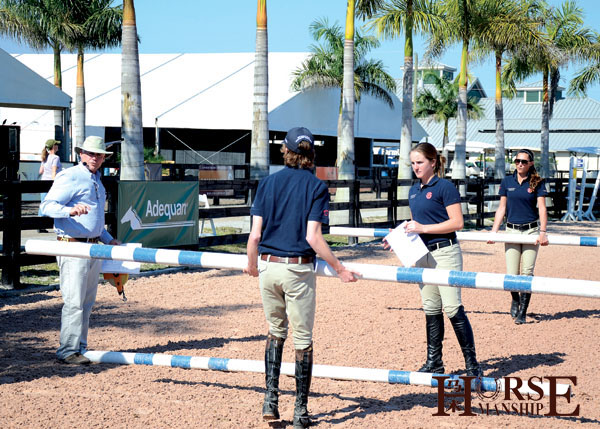 當(dāng)你專(zhuān)心致志于比賽過(guò)程的時(shí)候,也許并沒(méi)有留意賽場(chǎng)的路線設(shè)計(jì)中融入了多少心思。事實(shí)上,設(shè)計(jì)師需要精心考慮每一道障礙的高度、寬度、形狀、顏色和造型以及這道障礙與其他幾道障礙和賽道整體布局的相對(duì)位置關(guān)系,在搭建安全、合理、流暢的路線的同時(shí),考查你和馬的能力和技巧。2011 年1 月,在美國(guó)佛羅里達(dá)州惠靈頓市舉辦了一場(chǎng)為期一周的George H. Morris 馬術(shù)訓(xùn)練營(yíng),作者Anthony D'Ambrosio 以訓(xùn)練營(yíng)期間最后一天由他親自設(shè)計(jì)的路線為例,引領(lǐng)讀者跟隨路線順序走場(chǎng),體驗(yàn)每道精心設(shè)計(jì)的障礙。 本路線設(shè)計(jì)的初衷是檢驗(yàn)這些參加訓(xùn)練的積極進(jìn)取的年輕障礙賽騎手們?cè)谝恢軐W(xué)習(xí)時(shí)間里所掌握的技巧。比賽采用國(guó)家杯的賽事形式,也就是說(shuō),參賽者被分成若干隊(duì),每位隊(duì)員均進(jìn)行兩輪比賽,這有助于騎手們從第一輪比賽中汲取經(jīng)驗(yàn)教訓(xùn),并在第二輪中做出改進(jìn)。 本文將逐步引導(dǎo)你如何像路線設(shè)計(jì)者一樣思考,明確考官的“出題意圖”。 路線設(shè)計(jì)并不一定都是從第一道障礙開(kāi)始的。在Anthony 設(shè)計(jì)這一路線的時(shí)候, 考慮到George 想要在比賽場(chǎng)地中加入一道水障,所以他最先著手從水障(它和這一周訓(xùn)練課程所用的水障相同)開(kāi)始。特別有挑戰(zhàn)性的障礙,比如說(shuō)水障和大型的三橫木障礙,會(huì)改變整個(gè)賽場(chǎng)路線的走向。你為了讓馬零失誤跨越這種障礙,或者防止其在障礙前停下來(lái)或逃避障礙(特別是當(dāng)馬對(duì)這種障礙心存恐懼的時(shí)候),往往會(huì)調(diào)動(dòng)馬的興奮點(diǎn),但這也會(huì)使它的注意力在接下來(lái)的比賽中稍有下降,也會(huì)讓你在跨越剩余障礙的時(shí)候調(diào)整騎乘方式。因此,一般說(shuō)來(lái),在場(chǎng)地中越早設(shè)置水障,比賽的難度也就越高。在本文的路線圖中可以看到,本場(chǎng)比賽的水障設(shè)置在了第7 道,幾乎是在整場(chǎng)比賽的中間時(shí)刻出現(xiàn)這種難度較大的障礙。此外,設(shè)計(jì)師還通過(guò)在水障前后設(shè)置其他障礙向騎手提出各種考驗(yàn)。 第1道障礙 任何比賽的第一道障礙都需要付出一定的努力,這取決于馬的經(jīng)驗(yàn)和障礙的難度。經(jīng)驗(yàn)較少的馬需要騎手更多的幫助以專(zhuān)注于當(dāng)前的任務(wù),而不被場(chǎng)地上的其他景象分散注意力。經(jīng)驗(yàn)較為豐富的馬則熟悉整個(gè)流程,對(duì)第一跳充滿(mǎn)了期待。第一道障礙十分特殊,它迫使你向遠(yuǎn)離進(jìn)場(chǎng)口的方向行進(jìn),相當(dāng)于是讓習(xí)慣群居的馬做出非本能的行為。除此之外,本場(chǎng)比賽的第一道障礙是道伸展障礙(雙橫木障礙),這就需要馬付出更多的努力。而且這是一道上升式伸展障礙,前面的橫桿高度低于后面的橫桿,比兩道等高橫桿的方形伸展障礙更能激起馬跨越障礙的欲望??偠灾@些因素都需要你激起馬的干勁,在接近第一道障礙的時(shí)候,你有充足的時(shí)間調(diào)整步伐,手和腿要與馬保持緊密的聯(lián)系,引導(dǎo)它正直地跳過(guò)這道障礙。 第2道障礙 在第一跳之后,要在左轉(zhuǎn)的同時(shí)保持住良好的狀態(tài)去面對(duì)第二道高大而堅(jiān)固的磚墻障礙。時(shí)間有限,大幅度的轉(zhuǎn)彎是不可能的,因此你不需要繞過(guò)第5 道障礙,只需要做個(gè)簡(jiǎn)潔的小轉(zhuǎn)彎,讓馬保持好平衡并且積極向前。許多騎手和馬不會(huì)在平日練習(xí)這種磚墻障礙,而是選用頂部放置了若干橫桿的較矮的磚墻障礙來(lái)訓(xùn)練,所以在比賽的時(shí)候騎手和馬要果斷并充滿(mǎn)信心。 注意:在平日讓馬練習(xí)跨越盡可能高的磚墻不失為一個(gè)好主意。 第3道障礙 從第2 道障礙向下一道障礙行進(jìn)的時(shí)候,需要從第8 道障礙的左側(cè)繞過(guò)去,這一路程稍長(zhǎng),所以你有幾秒鐘的時(shí)間稍事放松。但在右轉(zhuǎn)過(guò)后,隨即將迎來(lái)第3 道障礙,而且這道障礙本身是純棕色的,非常容易讓馬把它與場(chǎng)地的顏色相混淆,所以在轉(zhuǎn)彎之后你需要立即讓它將注意力集中在障礙桿上。比起鮮艷色調(diào)的障礙桿,馬給予溫和色調(diào)的障礙的重視更少,因?yàn)闇睾偷念伾珜?duì)馬眼睛的刺激不夠強(qiáng)烈。同樣地,相對(duì)于單純顏色的障礙桿,馬對(duì)富有圖案的障礙更加重視。本場(chǎng)比賽中,第3道雙橫木障礙的跨度為4.6英尺(1 英尺=0.3048 米),馬需要有足夠的動(dòng)力充分伸展軀體去跨越。如果能漂亮地完成這一跳,騎手和馬在接下來(lái)的比賽過(guò)程將更為流暢。 第4a/b道障礙 從第3 道障礙到第4 道障礙的距離是整個(gè)路線中第一段考驗(yàn)相對(duì)距離的路程。Anthony認(rèn)為兩道連續(xù)障礙的間距至少小于9 個(gè)馬匹跑步步幅的情況下就屬于“相對(duì)距離”(本文另有關(guān)于測(cè)量障礙間距的詳細(xì)介紹)。這段距離約為99英尺,需要馬向前7 步完成。設(shè)計(jì)師的本意是鼓勵(lì)騎手跨過(guò)這個(gè)由伸展障礙(雙橫木障礙)和垂直障礙(單橫木障礙)組成的復(fù)合障礙,因?yàn)閮傻