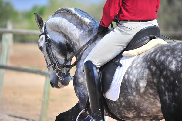 在面對(duì)初級(jí)舞步訓(xùn)練人和馬的時(shí)候,可以讓騎手先使用快步和跑步騎行幾分鐘,找出騎手和馬之間的誤區(qū)和不足,有針對(duì)性地解決馬匹與人之間的問(wèn)題。比如,可以在騎乘中發(fā)現(xiàn)騎手是否由于裝備原因造成的身體失衡;馬匹的性情是否乖巧,動(dòng)作不夠柔順等。 很多人在認(rèn)識(shí)上存在一個(gè)誤區(qū),那就是盛裝舞步騎手的腳鐙皮帶必須很長(zhǎng),然而事實(shí)上你應(yīng)該讓腳鐙皮帶的長(zhǎng)度調(diào)整到能讓你坐在馬鞍中央、并保持你的身體平衡的程度。 這是一匹看上去很靈巧的馬,但頭、頸部缺乏柔順。另外,騎手在騎乘時(shí)總是傾向于一直用腿不斷地輔助,讓它總是向前。馬同人一樣,有一種習(xí)慣性,如果不停地輕輕碰它,那么它習(xí)慣了這種觸碰后就不會(huì)引發(fā)它的注意力。但是如果隔5 分鐘用力碰它一下,那么它就會(huì)關(guān)注到你的動(dòng)作,這樣這匹馬就會(huì)學(xué)著保持向前而不用依賴(lài)于騎手的動(dòng)作。 跑步輪乘 如果跑步是騎手和馬匹比較難配合的,那么騎手不妨先放松雙腿,當(dāng)馬匹的腳步變慢時(shí)輔助一下讓它加速,之后再次放松雙腿。 在做這個(gè)練習(xí)時(shí),還需要讓馬兒更加放松頭部,方法是讓它稍向外側(cè)彎曲,之后是再向內(nèi)側(cè)曲撓。在讓它彎曲時(shí)你要用手腕的力量而不是手臂,否則你就會(huì)拉扯到他嘴中的銜鐵,這樣做會(huì)讓它低下頭并有可能傷到它的嘴。 在馬放慢步伐時(shí)輔助它一下,之后稍向外側(cè)彎曲它的身體,之后再向內(nèi)側(cè)彎曲以提高它的順從。當(dāng)你這樣讓馬曲撓身體時(shí),你要確認(rèn)它以適當(dāng)?shù)姆绞綇澢i部,而不是傾斜他的頭。在這樣做時(shí)需要打開(kāi)韁繩,不要向后拉;之后要半減卻以防止它的頭下垂過(guò)低并用前軀奔跑。記住要用半減卻的方法而不是拉緊韁繩。你想要達(dá)到的是讓馬的后軀深踏,以便于它把更多體重移向后軀,從而使前軀變輕。 這樣做的結(jié)果是更加順從和更加想著向前的馬,和一位不必總是用腿的騎手。作為騎手我們總是應(yīng)該思考如何改善馬的步伐。你可以問(wèn)問(wèn)自己“它向前足夠嗎?它夠圓潤(rùn)嗎?它的前軀輕嗎?或許我應(yīng)該用半減卻或輪乘來(lái)恢復(fù)平衡?”永遠(yuǎn)不要認(rèn)為:“這樣就行了?!币?yàn)樽鳛橐幻粩鄬W(xué)習(xí)的騎手,我們總是可以做得更好。 很多人在認(rèn)識(shí)上存在一個(gè)誤區(qū),那就是盛裝舞步騎手的腳鐙皮帶必須很長(zhǎng),然而事實(shí)上你應(yīng)該讓腳鐙皮帶的長(zhǎng)度調(diào)整到能讓你坐在馬鞍中央、并保持你的身體平衡的程度。 讓能量從后向前傳遞 騎手們一定要注意,騎馬時(shí)讓馬的后軀發(fā)力向前是多么的重要,特別是在向下移行和半減卻的過(guò)程中,從馬的后軀獲得動(dòng)力是非常重要的。 在休息之后再度持韁繩并開(kāi)始慢步時(shí),騎手要注意一件事,那就是拉韁繩時(shí)動(dòng)作應(yīng)有一個(gè)逐漸的過(guò)程。動(dòng)作過(guò)猛她會(huì)讓口銜突然間接觸,這會(huì)讓馬的下巴縮回到頭部豎線(xiàn)后并讓它的腿后退。 提高快步壓浪 快步也可以幫助騎手改善騎坐和身體平衡??梢韵茸隈R鞍上深呼吸,讓身體放松,之后逐漸加快節(jié)奏提高馬的速度。如果你一開(kāi)始快步壓浪動(dòng)作,你的馬就放慢了速度,那么你就必須用腿輔助要它再次振作起來(lái);如果你覺(jué)得馬在放慢速度,可以嘗試使用馬鞭,之后就可以集中注意力于快步壓浪了。 騎手可以從一個(gè)較為向前的快步壓浪做向跑步的移行,并在移行過(guò)程中保持向前的動(dòng)作節(jié)奏。這樣做可以訓(xùn)練騎手和馬匹的節(jié)奏感。 另外,還有一點(diǎn)需要注意,那就是如果你要做的是圈乘,那么仔細(xì)觀察你所繞的圈會(huì)不會(huì)看起來(lái)像方的。圓圈是沒(méi)有角的,所以在繞圈時(shí)不要走直線(xiàn),想著你總是在讓馬稍稍地向圓圈的軌跡行進(jìn),這樣你便可以不停地讓它轉(zhuǎn)彎。 彎曲和伸展 在結(jié)束練習(xí)之前,我們可以做一些伸展運(yùn)動(dòng)。在收尾階段放長(zhǎng)韁繩,這樣有助于馬輕柔地放松肌肉。在這里要建議騎手不要讓馬過(guò)分彎曲,那樣會(huì)讓馬失去平衡,它的肩部就會(huì)下垂試圖穩(wěn)定后軀。相反,你需要做的只是用輕微的手腕動(dòng)作來(lái)向場(chǎng)地中央打開(kāi)內(nèi)側(cè)手。當(dāng)你的馬匹身體放松而柔軟地繼續(xù)行進(jìn)時(shí),祝賀你,你的馬已經(jīng)真正地向你表示順從了。 TIPS 1. 腳蹬的皮帶過(guò)長(zhǎng)會(huì)讓你的腳深陷在腳鐙里,影響騎手的身體平衡,并有時(shí)會(huì)讓造成身體前傾。 2. 如果跑步是和馬之間最難配合做好的,那么騎手不妨放松雙腿,當(dāng)馬的腳步變慢時(shí)再用腿輔助它一下讓它加速,之后再次放松雙腿。 3. 基礎(chǔ)非常重要,如果基礎(chǔ)不好那你就不能想別的了,即使是頂尖騎手也要花很多時(shí)間進(jìn)行基礎(chǔ)練習(xí)。 向前進(jìn)入跑步和角落 在場(chǎng)地內(nèi)練習(xí)時(shí)先從慢步用正確的領(lǐng)先步做跑步移行,騎手身體正直,眼睛向前看,放低雙手,讓馬匹向內(nèi)側(cè)稍稍彎曲,以保持它的身形圓潤(rùn),之后再做跑步。在馴馬時(shí)你需要