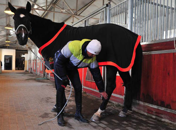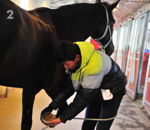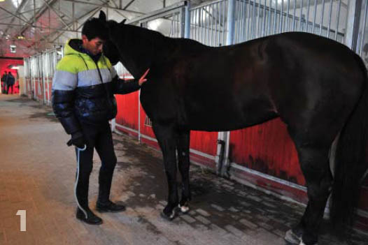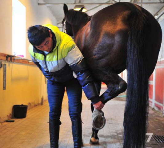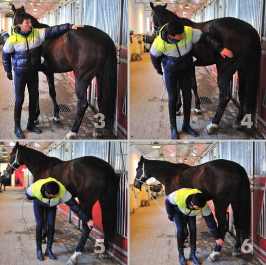 不管是搬馬的前蹄還是后蹄,你有沒有曾經(jīng)為這件事為難過?本文不僅要告訴你為什么搬蹄困難,還要教你正確的搬蹄步驟。 有經(jīng)驗的人知道,若想搬起年幼馬或者是未經(jīng)調(diào)教的馬的蹄子,是不容易的。自古以來,逃跑是馬的本能和天性,它習(xí)慣在遇到危險的時候拔腿就跑。因此,試想當(dāng)你困住了馬的一條腿,阻礙了它的自由移動,它自然會感到害怕。明白這其中的道理尤為重要,這樣你就會更加理解馬,就能學(xué)會溫柔地去接近它們,樂于耐心地引導(dǎo)它們?nèi)バ湃文?,而不是一個人為此疑惑不解甚至是生悶氣。 如果是從零開始去調(diào)教年輕馬,包括怎樣抬起馬蹄并讓它允許你握住它的腿,相對來說比較容易,但是大多數(shù)情況下,我們生活中遇到的是成年馬匹,而它們又不是都能幸運地接受過正確的早期教育。然而,不管年齡多大,調(diào)教好它們并沒有多難,你所需要的就是時間和耐心。 為什么要搬馬蹄? 馬需要學(xué)會如何抬起馬蹄,并允許別人握住蹄子或者馬腿一段時間,這很重要。如果馬足夠配合,這將有利于釘蹄師和騎手為馬進(jìn)行日常的護(hù)理,甚至在馬不幸受傷的情況下,獸醫(yī)能更快地找到病因,更好地進(jìn)行診斷和治療。 搬蹄步驟 教授馬匹任何事情,都要按照程序一步步來。在馬匹還不能良好地掌握平衡、節(jié)奏和正直之前,就算是頂級的盛裝舞步騎手,也不會在這個時候教它們做跑步后肢旋轉(zhuǎn)(Canter Pirouettes, 舞步里的一種高難度動作)。這與教授馬匹學(xué)會并允許你抬起它的蹄子和腿是一個道理。你的最終目標(biāo)是讓馬配合地站在那里,允許你抬起它的蹄子并持續(xù)這個動作一段時間,但是你所需的第一個步驟是讓它自然地接受你的靠近或者是你碰觸它的四肢。 如何接近馬匹也很重要。如果你操之過急,興沖沖地朝它走過去,它會本能地向后退,不能怪它不配合你。所以,你要自信且慢慢地走近它,如果它還是躲閃,不要沖動地試圖把它拉向你,這樣只會適得其反。正確的辦法是允許它在你身邊小范圍地走動,而且你要跟著它走動,讓它明白躲避是沒有任何用處的。在這個過程中,它會明白其實你對它并無惡意,它對你的信任感也會加深。 當(dāng)你靠近馬匹時它表現(xiàn)得很自然的時候,就可以進(jìn)行下一個步驟了。但請記住,有些馬還不能在三足站立的時候保持平衡,所以你要考慮周到,事先想好需要馬腿抬多高、抬到什么位置、抬多長時間等。還有一點請注意,馬匹有時也會用脖子保持平衡,所以手中的韁繩不應(yīng)牽得太緊,要留給馬匹足夠的活動空間,或者可以選擇不牽著它。 搬馬前蹄 如圖1、2 所示,在搬馬前蹄的時候,站到馬匹肩部旁邊的位置,把手輕輕地放到它肩部隆起的位置上,手慢慢向下,朝著馬蹄的方向撫摸,在這個過程中,保持手始終接觸馬的身體。你也許會發(fā)現(xiàn),當(dāng)手快要接近馬蹄的時候,它自然而然地就把蹄子抬了起來;但也會發(fā)生相反的情況,馬會向前邁步,它這樣是在企圖擺脫你。 如果馬很配合,可以把它的蹄子放下當(dāng)做獎勵,然后再重復(fù)這一練習(xí),每次完成動作后都記得要鼓勵它。無論是搬馬前蹄還是后蹄,如果馬不愿意,不要握著它的蹄子不放手,這樣會讓馬產(chǎn)生恐懼感??梢宰屇愕鸟R先后退幾步,以便搬起它的前蹄之后,可以更好地保持三足平衡站立。 如圖3,搬馬后蹄的時候,站到馬的側(cè)身,并將手輕輕地放在馬的后臀部上。 如圖4、5、6 所示,手慢慢向下,朝著馬后蹄的方向撫摸。年輕的小馬可能會很快地從你手中抽回腿或蹄子,如果遇到這種情況,不要試圖強硬地抓住它的腿或蹄子,應(yīng)該讓它自然地把馬蹄放回到地上,鼓勵它,并讓它再嘗試一次。 如圖7,如果重復(fù)練習(xí)這個動作,你的馬會慢慢學(xué)會配合地抬起后蹄,而不會試圖擺脫你,接下來它會慢慢允許你握住它的蹄子或者是馬腿。當(dāng)你可以做到這步的時候,不要把馬蹄拽向自己,要保證馬腿抬起的方向是向前的,這樣既安全,又能幫助它保持站立的平衡。等你的馬兒開始順從并配合你抬起腳的時候,你就可以為它準(zhǔn)備蹄鐵工了。 無拘無束 本文教練愿意讓馬在做平地訓(xùn)練的時候只給它佩戴籠頭和調(diào)教索。這樣可以讓馬放松并且感到較為安全。另外,如果馬匹想要遠(yuǎn)離你,你應(yīng)該給予它這種自由。無論是在給馬裝車、牽引馬、備馬,還是做其他事情的時候,你都應(yīng)該尊重它。如果它想躲避,比如說在裝車的時候想從車上下來,那就讓它下來,但是要把它重新帶回到它逃避的那個環(huán)節(jié),引導(dǎo)它去思考這樣做的意義。遇到馬匹逃避這種情況,最好的方法就是退回一步重新做。但是你要友好地引導(dǎo)它,馬在年輕的時候越早接觸并嘗試新鮮的事物,不管是騎術(shù)還是平地訓(xùn)練,日后的工作就越得心應(yīng)手。 編譯/趙穎 圖/李艷陽 |