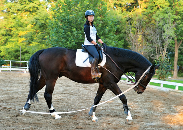在馬匹進(jìn)行大部分的動作時,騎手都應(yīng)有所感覺,并反應(yīng)到他的腿部,臀部和下側(cè)腰肢。騎手所要做的便是去感覺它,而不是去阻撓。 在脫蹬慢步時,閉上眼睛,去感覺馬匹后肢的每一步移動:左,右,左,右,左,右…… 想象每一個動作就像是每一次彈簧的彈起,或是兩個車輪向后滑動。然后,將你所選定的景象與坐骨相聯(lián)系,在感受“左右”的同時,去聯(lián)想。睜開眼睛也是一樣的道理。 現(xiàn)在,延續(xù)這種感覺,去伸長馬匹的步子。利用騎坐的力量,讓車輪盡可能的大。讓它的步子慢慢在變長,變快。 接著,縮短馬匹的步子。這里,就要記住,如果動作過小的話,就好比剎著手剎開車。不過,這也恰恰說明了騎手的騎坐和背部作為輔助,是多么的重要,而且在伸長或縮短馬匹步子的時候,是多么的有效。 常見的錯誤 1.騎坐不等平 騎手的騎坐是與馬匹之間的主要溝通。如果你向右傾斜,你的左側(cè)坐骨便會抬起,從而導(dǎo)致馬匹向左偏移。反方向同理。 2.身體前傾,肩膀收攏 馬匹在自然狀態(tài)時,身體的三分之二重量是在肩膀上,只有三分之一的重量在后肢上,因此,作為騎手,不應(yīng)該再給馬匹的肩膀施加壓力。畢竟,你的頭也要有10-15磅呢。 3.身體空懸 肩膀后擺,置于坐骨之后,身體僵直會讓馬匹抬頭,并令其背部僵硬。 4.動作太多 雖然騎手的背部不應(yīng)緊張,要避免腰部擺動:但還是要有一定的定力,這樣其坐姿才不會很容易受外力影響。 5.身體扭曲 在左彎曲中,向前扭曲外側(cè)肩膀會讓馬匹很難轉(zhuǎn)向。反方向同理。 要領(lǐng)四:意識 固守某種習(xí)慣的模式很容易,因此,很重要的是要能夠認(rèn)識到,并解析自己錯誤的身體輔助。在給馬匹以方向時,應(yīng)盡可能避免身體的扭曲或僵硬。通過誠實且準(zhǔn)確的分析自己的意識,身體的正確輔助便會水到渠成。 在慢步中,穿蹬,做如下練習(xí)。確保有人幫你控制著馬匹。目標(biāo)是在騎坐上,保持住平衡,姿勢和準(zhǔn)線。且同時,也能夠保持住方向,并隨著馬匹自然運動。 總結(jié) 在每次坐在馬鞍上時,都想想這些動作要領(lǐng),久而久之,你便會成為有效的騎手。