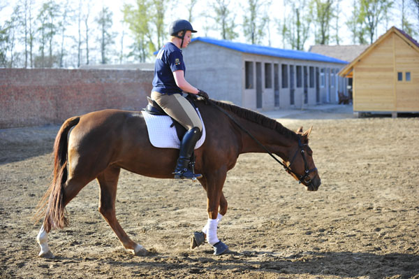 本文由來自德國的職業(yè)騎手JULIA KLATT撰寫,圖片由馬術(shù)雜志攝影師根據(jù)JULIA的新馬調(diào)教訓練拍攝。所使用馬匹為來自德國的韋斯特法倫溫血馬。本選題是在最近國內(nèi)馬友大批進口國外溫血馬的背景下論證產(chǎn)生的,我們試圖通過文字和圖片傳達一種對于年輕馬的訓練的正確理念,幫助讀者與馬主們提高和保持馬的狀態(tài)。 年輕馬的訓練是一個循序漸進的過程,有一定的步驟體系。如有違反,則會使馬匹在身體和心智上出現(xiàn)不和諧。這樣馬匹便會變得很不合作,訓練也就會毫無樂趣可言。這個步驟體系,在德國被稱為馬匹的“教育衡量標準”,其中涵括了牢固基本功訓練的諸多重要方面。如果基本功沒有正確練就的話,馬匹則無法向前邁進一步,開始更高級的訓練。 根據(jù)德國“教育衡量標準”,第一步是要教會馬匹在每一種步伐中都要有清晰的節(jié)奏。這一點之所以首當其沖并且最重要,是因為一匹無法正確走動的馬匹很可能是身體上受到了損害,它將永遠不能取得好的競技成績。通常,在上馬后,首先要長韁慢步幾分鐘。這樣會幫助馬匹找到自己在慢步中的節(jié)奏,改進平衡力,并放松下來。 放松是下一個衡量標準。只有馬匹充分放松,并足夠信任騎手的時候,它才能享受到訓練的樂趣。為達到這一點,在任何情況下,騎手都要保持鎮(zhèn)定且放松。如果馬匹略顯緊張,就去輕輕地拍打它的頸部,直到它開始吹動鼻孔。當馬匹步伐自由、規(guī)整且從容不迫時,它自然會很放松。這時它的嘴巴和頭部都應(yīng)該很穩(wěn),且背部自由搖擺。 為了和馬匹建立良好的溝通,騎手與馬嘴的接觸要柔軟且穩(wěn)固。在開始慢步時,也可以練習這一點。具體做法是,將韁繩收短一些,但不要讓馬匹的頭部因此而被拉低。雙手穩(wěn)固在前,以精力充沛且向前的慢步騎乘。騎手要想象用力推動馬匹后肢向前。雙手與馬嘴之間的接觸就好比拉著一條細線,不是緊到細線被扯斷,也不是很松,細線有彎曲的部分。 以上三點是適應(yīng)訓練中要達到的目標。因為,在開始訓練時,馬匹要學會基本功,在這個階段的訓練中,騎手要做到十分準確?;A(chǔ)打得不扎實,會在日后的訓練中產(chǎn)生很多問題。而當?shù)搅藷o法再進步的時候,重新回到基本功的訓練也是很有幫助的。 所有日常的訓練課程都應(yīng)依照教育衡量標準而定。如果馬匹在慢步中已經(jīng)找到節(jié)奏,且放松,騎手與馬嘴的接觸也很不錯,便可以開始練習慢步-立定-慢步和慢步-快步-慢步-立定-慢步等之間的簡單步伐變換了。當在這些簡單的練習中取得一定的成績后,下一步就要進行快步和跑步之間的變換了。重要的是不要對馬匹要求過多,特別是對年輕馬,要更寬容。要不停地提醒自己隔一段時間,就要讓馬匹慢步休息。 熱身打圈也很有幫助。打圈可改善馬匹的側(cè)向彎曲,并幫助馬匹找到平衡。正確的打圈很有技術(shù)可言,看起來簡單,實則不然。經(jīng)驗不足的騎手不應(yīng)獨自為馬匹打圈,一定要找一位經(jīng)驗豐富的人站在旁邊幫忙,不斷提出建議。圈乘不可太小,不然會導(dǎo)致錯誤的彎曲,馬匹的四肢,肌肉,筋腱和后背也可能因此而損傷。可借用側(cè)韁或三角輔助韁,以達到與馬匹的更多接觸。尤其是三角輔助韁對年輕馬很有幫助,教會馬匹放低頸部,并向前下方伸展。而馬鞭只應(yīng)去鼓勵馬匹向前,或配合聲音指令,千萬不可以用它去懲罰馬匹,不然馬匹會變得害怕并失去信心。打圈的速度也不宜過快或過慢。過快則會讓馬匹失去平衡,可能會使其四肢過度拉伸而損傷。而如果過慢,馬匹太懶,其后肢的推進力則會消失。 在訓練年輕馬時,當它表現(xiàn)得不錯,正確回應(yīng)你的輔助時,千萬不要吝嗇,一定要及時去表揚它。稱贊幫助馬匹認識到它做對了,馬匹也會開心地記下這個特別的時刻。馬的記憶力很好,在日后的訓練中,我們需要的是一匹有著很多美好經(jīng)歷和記憶的馬匹。馬匹會不斷尋找這樣美好的感覺,相對經(jīng)歷平庸的馬匹而言,它的進步會更快。而另一方面,當馬匹做錯了,也不要去懲罰它。也許是你的輔助不對,導(dǎo)致馬匹無法理解指令??傊?,當馬匹的回應(yīng)有所偏差時,首先要檢查自己的輔助是否正確。騎馬時遇到的很多問題,根本原因都不在馬匹,而在于騎手。馬匹是硬件,而騎手是軟件。如果軟件紕漏很多,即便是全世界最好的硬件也將無法正常工作。 雖然以上有關(guān)馬匹訓練的理論聽起來很簡單,但實際要練好基本功,將要花上一年左右的時間。接下來要做的就是去改善馬匹的推進力和正直。盡管基本功中已經(jīng)練習了精力充沛且向前的騎乘,但改善推進力的特殊練習則屬于馬匹下一階段的教育。 如何來進行年輕馬的訓練課程 尤其是對年輕馬而言,打圈是教會馬匹找到自我平衡的最佳訓練方法。如果是在騎乘前進行打圈的話,一定先要讓馬匹慢步10分鐘。這樣使馬匹在開始工作前,能夠充分地活動肌肉和筋腱。而直接快步則會傷害到馬匹。在10分鐘的慢步后,就可以快步了,并在慢步、快步和跑步間做不同的步伐變換。但不可以讓馬匹過度勞累,打圈僅是騎乘前的準備工作而已,最長不得超過30分鐘。 在上馬后,也可以先慢步幾圈,并進行慢步和立定間的變換,從而讓馬匹與你熟悉起來,并適應(yīng)你的輔助。在快步工作