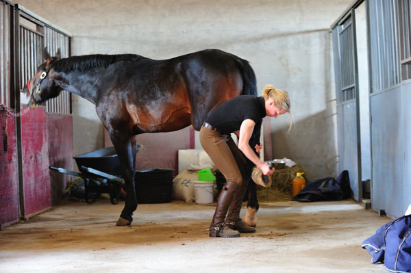 本文圖片由來自德國的職業(yè)騎手JULIA KLATT示范,由馬術雜志攝影師和編輯依據(jù)JULIA的訓練課和《馬術經(jīng)典教程》(喬維科斯編著,唐明川譯)整理成文的。本文所使用馬匹為來自德國的威斯特法倫溫血馬。本選題是在最近國內馬友大批進口國外溫血馬的背景下論證產(chǎn)生的,我們試圖通過文字和圖片傳達一種對于年輕馬的訓練的正確理念,幫助讀者和馬主們提高和保持馬的狀態(tài)。 馬房管理也是訓練的一部分 我們不應該忽視馬房管理對馬匹訓練重要性。我們需要了解馬生活的所有方面,而不僅僅是它的動作表現(xiàn)。一個活生生的生命只有在它感到快和舒適時才能做出最佳表現(xiàn)。對于馬來說,你需要了解從馬房管理、馬的健康和飲食狀況到練習情況及馬具之中的所有環(huán)節(jié)。所有這些環(huán)節(jié)都時常需要進行細微的調整,所以你需要認識到什么對你的馬是最好的,并隨時注意他的表現(xiàn)。無論你和馬是什么樣的年齡、體形、大小或經(jīng)驗水平,這些訓練技巧都是適用的。 打圈是最好的訓練方式 對于精力充沛的年輕馬而言每天的打圈訓練是最好的運動方式。通過打圈增加馬的力量,改善馬的平衡,使得馬匹更加安靜和順從,更利于安全騎乘。在訓練中注意慢步、快步、跑步的節(jié)奏和逐一變換,不同行進方向的變換等。在訓練中要保持聲音的輔助柔和而肯定。在對于精力旺盛的年輕馬的訓練中,通常是建議先打圈熱身后再開始騎乘訓練。 利用練馬索打圈,讓馬學習移行,這樣它們就會學會對我的聲音做出反應。之后在我們騎馬時,使用同樣的口令,也會使用細微的韁繩扶助,這樣馬就會從一開始就學會感受細微的韁繩扶助。對于向上移行使用較尖銳的音調,兒對于向下移行則使用較柔和的音調。例如:“快跑...”用于加快速度,“喔...”則用于停止。你需要讓向上移行的指令充滿刺激和活力,讓馬匹煥發(fā)精神,而向下過渡則應平靜而柔和,但不要讓你的馬失去向前的氣勢。 如何熱身 在熱身時我使用半長韁繩,馬的頸部比較自由,可以向前、向下伸展,背部也可以自由活動。 熱身的第一個目的是達到動作的靈活和柔順,所以你可以用三種速度沿大圈騎行,直到你的馬在心理上和身體上都達到放松為止。我發(fā)現(xiàn)跑大圈會更有助于馬的放松。彎曲的馬頸部有利于身體的伸展并可防止奔跑速度過快。一匹馬的心理狀態(tài)控制著它的肌肉放松和緊張.所以心理上的放松有利于身體上的放松。熱身時間依馬而定,通常約為15分鐘。在圈乘時避免急轉彎。在你要做不同動作之前,你需要給馬足夠的提示,這是很重要的。這樣它就會知道你何時希望它做出例如向下移行或變換里懷動作。我們所說的準備就是這個意思,這會保證馬匹保持身體的平衡、動作的節(jié)奏和身體的柔順。在馴馬時盡可能采用輕快步,因為這種姿勢會讓馬感到更加舒適。 動力和剎車 如果你的車具有優(yōu)良的剎車性能,那么你就不會介意把車開得快一些,對馬來說也是這樣。如果你的馬熱愛速度(它去哪都喜歡用極速),那么這個練習將有利于改善它的剎車系統(tǒng)。在練習場內繞大圈騎行,在長邊時讓馬以中度快步前進。在騎到長邊約一半時,當馬真的要加速時,讓馬移行到慢步。重復這個練習,直到你的馬能夠預見到步行移行時為止。如果它在等待步行的命令,那么它的身體就會比較放松。 我總是利用場地的長邊來開始訓練馬匹中度快步,這樣如果馬匹對訓練中的困難有些記憶的話,那么這些困難與場地的對角線是沒有聯(lián)系的,它將會在考試中沿對角線進行中廑快步。我只有在馬匹能夠在場地長邊做出優(yōu)秀的表現(xiàn)之后,才會開始使用場地的對角線。當馬按照你的要求做完動作時,拍拍它,別吝惜你的鼓勵。 移行提示 1)在進行向上移行時讓你的重心稍上移,身體上部稍稍前傾。 2)在進行向下移行時讓你的身體上部更加豎直。 3)盡可能使用輕微的扶助,只有當馬在第一次沒有反應時才加強扶助命令。 提高跑步表現(xiàn) 你的馬需要學會保持你要求的步伐,直到你發(fā)出其他命令為止。對于這個規(guī)則是沒有例外的,甚至在跑步時也是一樣的,盡管你的馬可能會希望有例外,特別是年輕缺乏經(jīng)驗的馬更是如此。在保持跑步步伐方面我采取了不同的做法,我訓練馬反復重新開始跑步。訓練馬在跑步時保持更佳的身體平衡和保持跑步狀態(tài),可以在場地內馬上就要進入角落前命令馬改變?yōu)榕懿?,訓練場地的邊緣會自然地讓馬放慢速度,這樣做會自如地讓馬進入跑步,而不會讓肩部過于緊張。 一旦能夠保持良好的跑步騎行,你就可以做2 0米的圈乘并稍放松韁繩,這樣馬便可以用頸部幫助平衡身體,你只需要靜靜地坐在馬鞍上隨馬一同行進。不久,身體不平衡的和較懶散的馬很可能就會開始快步。當出現(xiàn)這種情況時,你需要立即要求馬返回到跑步狀態(tài)。這時不要猶豫,因為聰明的馬會為此分散注意力。馬在打斷跑步時所做的移行會有助于他的身體平衡,每次更正他的快步會讓他學會打斷跑步不是有效的逃避方法。我發(fā)現(xiàn)馬會很快認識到最佳的選擇是自覺地保持跑步。確保在跑步以前你的馬保持良好的調教決步狀態(tài)。 放松 在運動后給馬以長韁慢步,讓馬肌肉放松。卸下鞍子后,讓馬在軟沙地處打滾“