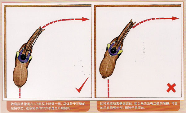 提高馬的柔軟性,可以做各種各樣的圈程、轉彎、曲線運動。如果騎手正確地要求馬匹,這些練習會有很大的價值。圈程騎乘,騎手必須決定兩件事情: 1)圈程起始點的確切位置。 2)圈程的大小。 對騎手而言任何的模糊要求都會導致不易覺察到的不服從。騎手要想做好圈程就必須在起始點前做幾步準備。騎手確認馬匹在固程方向上屈撓,使用內(nèi)方腿和內(nèi)方韁的同時,要保持好外方韁的聯(lián)系。這些都是很微妙的輔助。在進入圈程的起始點,騎手應很清楚地注視他所行進的方向,增加內(nèi)方腿和內(nèi)方韁的輔助。外方韁扮演著一個很重要的角色,開始做圈程時如果外方韁是松的,圈程就不夠精確。然而如果騎手沒有給出外方韁允許馬匹的脖頸向內(nèi)側屈撓,那么馬匹不能做出正確的屈撓。 一旦圈程開始,騎手只須保持向前的動力,馬匹正確的屈撓以保持所行路線是圓的就可以了。馬匹經(jīng)常逃避這種柔軟性練習,例如:不屈撓它的身體,甩出它的后半肢。在肚帶后的外方腿糾正隨時發(fā)生的問題,如后軀的甩出等。馬匹應該在左圈程和右圈程上同等工作。特別注意的是在換方向時馬體應回到正直,在開始另一方向向圈程時馬匹應該在新的方向上屈撓。 盡管很多馬匹有一側是僵硬的,他們必須與外方韁保持好聯(lián)系,不應該一側比另一側屈撓得多。應避免發(fā)生的錯誤: 1)外偏當馬匹向內(nèi)方屈撓太多時,它的的外側肩就會向外甩。糾正錯誤:與外方韁有更多的聯(lián)系,外方腿有更穩(wěn)定的輔助。 2)內(nèi)偏當馬匹向外方屈撓太多時,就會倒向內(nèi)側。增加內(nèi)方腿輔助的力度,輕輕地拿~給內(nèi)方韁。 文/Joni Bentley,圖/Carole Vincer,譯/天星調(diào)良國際馬術俱樂部教練組 |
