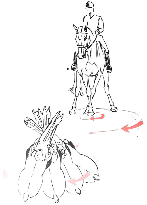 什么才是向馬匹介紹側(cè)向移動的最清晰目一最簡單的方法呢?那就是先教會它如何用前肢轉(zhuǎn)向。 從立定開始,通過讓馬匹與前肢成拱形,移動后軀,來教會馬匹回應(yīng)來自騎手內(nèi)方腿的壓力。馬匹會將左后腿斜對角交叉到右后腿前方,來完成這個動作。 旦掌握了這其中的技巧.馬匹便可以開始學(xué)習(xí)做來革由丁和肩向內(nèi)等側(cè)向運動了。騎手也慢慢感覺到自己對馬匹轉(zhuǎn)向形態(tài),圈乘和圖形等動作完成的技巧大大提高了。 現(xiàn)在,找個場地中央的位置,相對兩邊要足夠大,可以自由轉(zhuǎn)彎。按照我下面所講的,讓我們用左腿告訴馬匹如何來側(cè)向移動。 首先來看下騎手的坐姿。確保騎坐平衡,上身挺直,重心朝下到腳后跟。因為是要向右側(cè)移動,所以讓馬輕微向內(nèi)彎曲,騎手左手關(guān)節(jié)指向自己的右臀部,告訴馬匹你要的是左彎曲。同時,騎手左側(cè)坐骨和左腿略微下壓,約一硬幣厚度。 讓右側(cè)外方韁稍稍柔軟,給馬匹足夠空間,轉(zhuǎn)向右側(cè),右腿被動地輕放在馬匹身上,但同時又像一堵墻,阻擋馬匹臀部過度外閃或每次多走一步出來。 左側(cè)內(nèi)方腿放在肚帶后一點,小腿擠壓,告訴馬匹要向右一步移動臀部,并與前肢成拱形。一旦,馬匹開始用左后腿移動第一步了,告訴它這就是你想要的側(cè)向運動。在馬蹄懸在半空的瞬間,放松左側(cè)內(nèi)方腿,右側(cè)外方韁半減缺。馬匹正確的反應(yīng)是放下馬蹄,通過放正另外一只馬蹄來完成單步轉(zhuǎn)向。 由于主要是在進(jìn)行順從性練習(xí),在這里,不妨就立定,讓馬匹放松。我們總是希望馬匹對騎手腿的輔助能夠予迅速的反應(yīng),并不想馬匹不規(guī)整地去完成動作。休息3-5秒后,再重復(fù)步,每次不得超過到兩次。然后就放長韁,順著場地四周做自由慢步。慢步段后,再收起韁繩,回到場地中心,再來次,這次是要做向左轉(zhuǎn)向了。 當(dāng)騎手和馬匹都能夠順利地完成兩側(cè)轉(zhuǎn)向的時候,就可以按照下面的圖形.進(jìn)行蛇形上的反對彎曲練習(xí)了。 文/Leslie Webb,編譯/汪亞麗 |