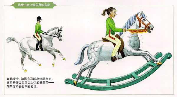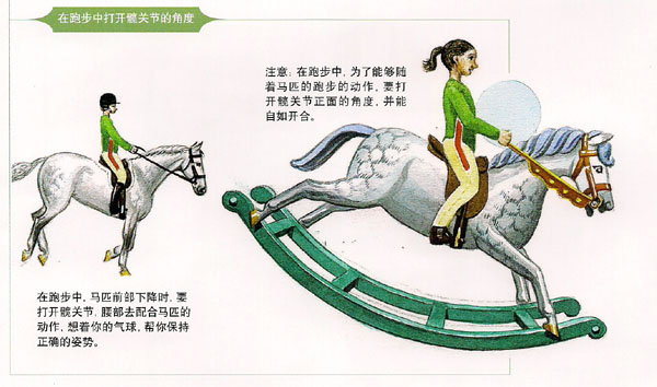 跑步是三節(jié)拍的運(yùn)動(dòng),馬匹在跑步時(shí),當(dāng)四蹄完全離開(kāi)地面時(shí),身體即出現(xiàn)懸空狀態(tài)。 跑步的基本要素是:要讓你的盆骨隨著馬匹運(yùn)動(dòng)而前后搖動(dòng),讓你的腰部和髖關(guān)節(jié)保持自由。要把你的腿沉下來(lái),好像一直沉到地面上。臀部保持放松,膝蓋和腳踝要保持靈活性,肋部保持自如浮動(dòng)。 在下圖里你會(huì)看到小搖馬的跑步姿勢(shì),小馬的背部是向下傾斜的,你身體的正面必須是放松的且像橡皮帶一樣伸展自如,可以說(shuō)你把自己交給了馬。用氣球的想象作為輔助,把你的髖關(guān)節(jié)打開(kāi)。打開(kāi)膝關(guān)節(jié),把你的腿部重量卸到地上,要保持身體垂直,馬匹在你的兩腿之間,但你要感覺(jué)好像是站在地上。 現(xiàn)在你坐在坐骨的前邊緣上。下一步,馬匹跑步時(shí)會(huì)把你的身體帶起來(lái),騎坐坐到坐骨后邊緣,合上髖關(guān)節(jié),讓你的坐骨向兩邊打開(kāi),給馬匹后背上升的空間。馬匹的跑步自動(dòng)導(dǎo)致你盆骨的活動(dòng)和髖部的開(kāi)合。你要自如地隨著它去體會(huì)在馬鞍的前、中、后三個(gè)部分的感覺(jué),如果你的身體不能夠隨著馬匹的跑步的動(dòng)作,那么當(dāng)馬匹后腳更深踏進(jìn)時(shí),你就會(huì)阻斷馬匹的動(dòng)作,造成馬匹后肢踏進(jìn)不夠。 用氣球的方式來(lái)試著給你更多幫助。當(dāng)馬匹身體下降時(shí),你用鼻吸氣,它上升時(shí),用鼻呼出氣體。要記住,你的身體重力和馬匹對(duì)你的支撐力是50/50。坐好,讓馬匹去工作。 想象你的腳像鴨掌一樣又寬又長(zhǎng),來(lái)幫助你在騎馬跑步時(shí)腿部伸長(zhǎng)、有效地動(dòng)作。想象下如果你的腳趾變長(zhǎng)了,變寬了,你的整個(gè)腳底就會(huì)展開(kāi)在腳蹬上,甚至能到地上。 長(zhǎng)韁做馬匹在跑步中的伸展 在跑步時(shí),首先在左里懷做這個(gè)練習(xí)。右手持韁,左手舉起,指尖朝上,當(dāng)你感到馬匹要下降時(shí),吸氣,把自己掛在指尖上。讓你的髖關(guān)節(jié)打開(kāi),在你下半身伴隨支撐的同時(shí),吸收馬匹向上的支撐力,當(dāng)你注意到馬匹的身體回來(lái)時(shí),呼出氣體并且繼續(xù)懸掛在指尖上,合上髖關(guān)節(jié)?,F(xiàn)在左手持韁,用右手重復(fù)以上的練習(xí)。 |