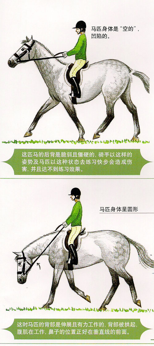 我們通常會(huì)看到騎手無(wú)止境地去做快步練習(xí),長(zhǎng)時(shí)間的調(diào)教索練習(xí),騎手和馬匹雙方都很痛苦,并且動(dòng)作僵硬,馬匹背部下陷并向上抗銜,這是錯(cuò)誤的。如果繼續(xù)讓馬匹背部凹陷地工作的話,那是在傷害馬匹。一定要找出馬匹為什么會(huì)背部塌陷的原因?也許是你的動(dòng)作限制了馬匹,沒(méi)有讓馬匹用整個(gè)脊椎去工作,或者是馬匹對(duì)某些事物的煩燥。很可能是由于鞍具不合適(一般都是因?yàn)榘白犹?,或者馬匹的背部沒(méi)有自由得到運(yùn)動(dòng)時(shí)必需的力量與柔軟,以致無(wú)法拱起背部和支撐起你的重量。 看這兩個(gè)圖例,注意這兩匹馬的背部和肚子的外輪廓線有什么不同,第一匹馬的背部是下沉的(凹陷的),腹肌虛弱,不結(jié)實(shí)(人類(lèi)也一樣)?,F(xiàn)在來(lái)分析第二匹馬,這匹馬的背部是向上拱的,并且在用腹?。ǘ亲樱┕ぷ?。 除非你的馬匹的工作狀態(tài)像右圖第二匹馬那樣,否則練習(xí)快步是毫無(wú)用處的。你需要作輕快步起立的原因,是讓馬匹后背輕松地拱起來(lái),并且加強(qiáng)背部力量。 注意馬匹下巴以下的空間形狀,這個(gè)空間是非常重要的。因?yàn)轳R匹的脊椎下部肌肉越是伸展,馬匹的上輪廓線就會(huì)越伸長(zhǎng),身體就會(huì)越向上挺起,馬匹后肢就會(huì)更加好踏進(jìn),從而馬匹的身體就會(huì)更提升、更優(yōu)美。當(dāng)馬匹正確的外輪廓線建立好時(shí),馬匹就不會(huì)抗拒,這時(shí)馬匹在完成基本調(diào)教運(yùn)動(dòng)和變換時(shí)會(huì)更加有力地踏進(jìn)。馬匹會(huì)把工作重心轉(zhuǎn)移到后肢上,前肢的受力會(huì)減輕,動(dòng)作會(huì)輕揚(yáng)起來(lái)。 練習(xí)快步同樣要求正確的身體姿勢(shì),就如下列圖例所示那樣,要讓你整個(gè)身體的運(yùn)動(dòng)隨著馬匹的運(yùn)動(dòng),接收馬匹對(duì)你的支撐力和你給馬匹的壓力要盡量持平,檢查如下: (1)你的頭部是否指引著你去的方向? (2)你的髖部是否隨馬背部動(dòng)作自如運(yùn)動(dòng)? (3)你是否打開(kāi)了你的所有關(guān)節(jié),并且在運(yùn)動(dòng)中起到了減振的作用? (4)你是否使用氣球假設(shè)去幫助你保持正確的姿勢(shì)? 把你髖部和腿部的重力卸到地面上,讓你的腿和髖關(guān)節(jié)完全跟隨馬匹,特別是馬匹肋部的動(dòng)作。你的腰部以上特別是你的肋部要打開(kāi)——這樣可以讓騎手自己達(dá)到自我承載。 |