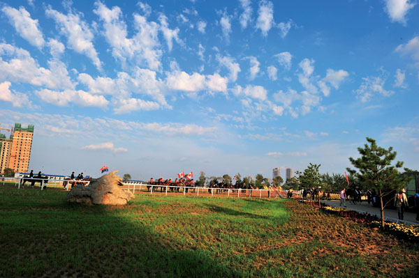 對(duì)于鄂爾多斯,印象里一直是一個(gè)路過的城市。很多年前開車回京,從這里經(jīng)過,只覺得羨慕其地廣人稀,交通順暢,晚上路面都見不到車,卻從未停留。這次因?yàn)閲?guó)際馬文化節(jié)的舉辦再次來(lái)到這里,不知道因?yàn)樾膼鄣鸟R的原因,還是曾經(jīng)的經(jīng)過,仿佛依稀,心情與老友重逢一般。 8月19日 天氣晴 經(jīng)過幾天的籌備,按計(jì)劃今天要進(jìn)行包括中國(guó)在內(nèi)的六個(gè)國(guó)家的騎手,在鄂爾多斯市康巴什新區(qū)到伊金霍洛旗之間的盛裝游行活動(dòng)。原本下午4點(diǎn)鐘才正式開始,那幾個(gè)騎乘葡萄牙馬的丹麥女孩1點(diǎn)半就到了馬場(chǎng),開始為愛馬梳洗打扮。歐洲的盛裝馬裝扮極其費(fèi)時(shí)費(fèi)力,矜持高貴的貴族風(fēng)范是需要大量的人力物力堆砌的。女孩子們站在太陽(yáng)下給馬鬃、馬尾編辮子,花樣繁復(fù),手法靈活,邊做邊笑。相反,來(lái)自美洲的巴西和加拿大騎手們就輕松的多了,他們只需要用普通的西部鞍具和牛仔褲。 下午的盛裝游行要從位于康巴什新區(qū)的“康城五期”馬場(chǎng)出發(fā)??蛋褪彩嵌鯛柖嗨沟囊粋€(gè)新區(qū),位于老城區(qū)伊金霍洛旗的東北方,特點(diǎn)是道路寬闊,紅綠燈繁多,最短的距離200米就有一個(gè)紅綠燈。后得知,這個(gè)城市人少路寬,所以需要強(qiáng)迫車輛慢行,避免出現(xiàn)大的交通事故。康巴什新區(qū)政府致力于發(fā)展城市規(guī)模、提升城市形象,吸引更多的人來(lái)此落戶,所以這里的城市建設(shè)正在大刀闊斧、如火如荼地進(jìn)行著,建筑工地林立。據(jù)說目前這里的房子比住戶多,按照比例平均一人能擁有三套住房。這讓從北京這種住房擁擠、寸土寸金的地方出來(lái)的人羨慕不已。 也許是這個(gè)新開發(fā)的地方國(guó)外游客少的原因,看到有人騎馬上街,在哪里都是個(gè)新鮮事,何況還有這么多不同國(guó)家的男男女女,穿戴新奇,引得路人紛紛駐足拍照。此次活動(dòng)是鄂爾多斯市政府主辦,所以得到了政府的大力配合,在游行時(shí)出動(dòng)了大量的交通、治安警力維護(hù)馬隊(duì)行進(jìn)的路線,最可愛的是連警察們也抽空拿著手機(jī)留影。 協(xié)辦方邦成牧場(chǎng)就在鄂爾多斯旁 公里處,30多匹純血和溫血馬大部分提供給了游行隊(duì)伍。隊(duì)伍前端的三個(gè)丹麥女孩原本在葡萄牙學(xué)習(xí)騎乘技術(shù),穿著的是歐洲古典貴族衣飾,貴氣十足,最為惹眼。緊隨其后的4個(gè)英國(guó)女孩和十多個(gè)澳大利亞騎手是英式騎術(shù)裝備,端坐馬上,腰背筆直。后面的加拿大和巴西人則是西部牛仔裝扮,姿態(tài)隨意。外國(guó)的騎手對(duì)于這次出街游行與中國(guó)人的嚴(yán)肅謹(jǐn)慎不同,我們當(dāng)是工作,他們當(dāng)是游樂,不斷向圍觀群眾揮手、笑著說“你好”,有時(shí)朝他們揮手的方向看過去,根本沒有人,抬頭一看,樓上開著的窗戶探出個(gè)頭來(lái)。巴西人最悠閑,一邊慢步一邊唱著歌,笑語(yǔ)盈盈以為是在郊游。 馬行進(jìn)在柏油路上其實(shí)并不舒服,大量的人和車的圍觀,容易讓原本就膽小的馬更加驚慌,因此又出動(dòng)了大量的工作人員作為后勤保障,車隊(duì)比馬隊(duì)還要長(zhǎng)。偶爾有馬調(diào)皮搗蛋,也能迅速被安撫控制住,實(shí)在折騰的,我們只好遺憾地讓他在技術(shù)總監(jiān)的手中被牽著走完全程了。好在今天晴空萬(wàn)里,下午4、5點(diǎn)鐘的太陽(yáng)不僅溫度適宜,光線也非常漂亮,顯得騎手個(gè)個(gè)面容燦爛,笑靨如花。 8月23日 雷陣雨 今天早上起來(lái),陽(yáng)光燦爛的,不禁懷疑當(dāng)?shù)氐奶鞖忸A(yù)報(bào),分明藍(lán)天白云,哪里像有雨的樣子?!大家心里都很高興,原本定于今天下午政府領(lǐng)導(dǎo)要來(lái)視察,看看開幕前的準(zhǔn)備工作,如果要下雨,就太不合作了。事實(shí)證明,我們高興得早了。 午后的陽(yáng)光依然燦爛,工作人員幾天都沒好好休息,我也趁著飯后僅有的不開會(huì)的一小時(shí)補(bǔ)了補(bǔ)覺。一睜眼發(fā)現(xiàn)云層密布,竟然暗喜了一下,這可比在戶外讓太陽(yáng)暴曬舒服多了。到達(dá)馬場(chǎng)時(shí)天氣還是陰,國(guó)內(nèi)外的騎手已經(jīng)開始牽馬進(jìn)入場(chǎng)地,進(jìn)行隊(duì)列練習(xí),就在所有人熱火朝天準(zhǔn)備的時(shí)候,讓人心碎的雷聲帶著雨終于趕過來(lái)了。事后我們才知道,姍姍來(lái)遲的領(lǐng)導(dǎo)乘坐的飛機(jī)就是因?yàn)檫@場(chǎng)雷,才未能按時(shí)起飛,這也預(yù)示了今天的一切活動(dòng)都會(huì)受到影響。 幾次延后的時(shí)間終于到了,中外騎手們打著自己國(guó)家的國(guó)旗,列隊(duì)在跑道上等候,一時(shí)間只見馬場(chǎng)入口處人頭攢動(dòng),步話機(jī)里傳出“來(lái)賓到達(dá)”的聲音,工作人員到位了,音樂起來(lái)了……毫無(wú)征兆地,瓢潑大雨瞬間而至,這一下,在場(chǎng)的人都停下了。 馬場(chǎng)上出現(xiàn)了奇異的一幕,除了偶爾的馬嘶外,只有鏗鏘的音樂和呼嘯的風(fēng)雨,再也聽不到其他聲響。大雨不停,隊(duì)列中的馬略有不安,卻沒人下馬離開,也沒人提出異議。這個(gè)時(shí)候,我由衷地敬佩他們。一切按照既定程序進(jìn)行,仿佛大雨不存在一樣。隨著行進(jìn)隊(duì)伍中每個(gè)國(guó)家的執(zhí)旗
